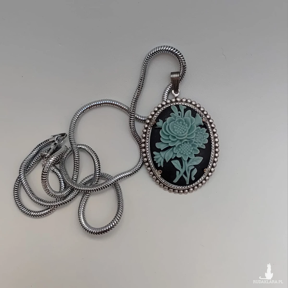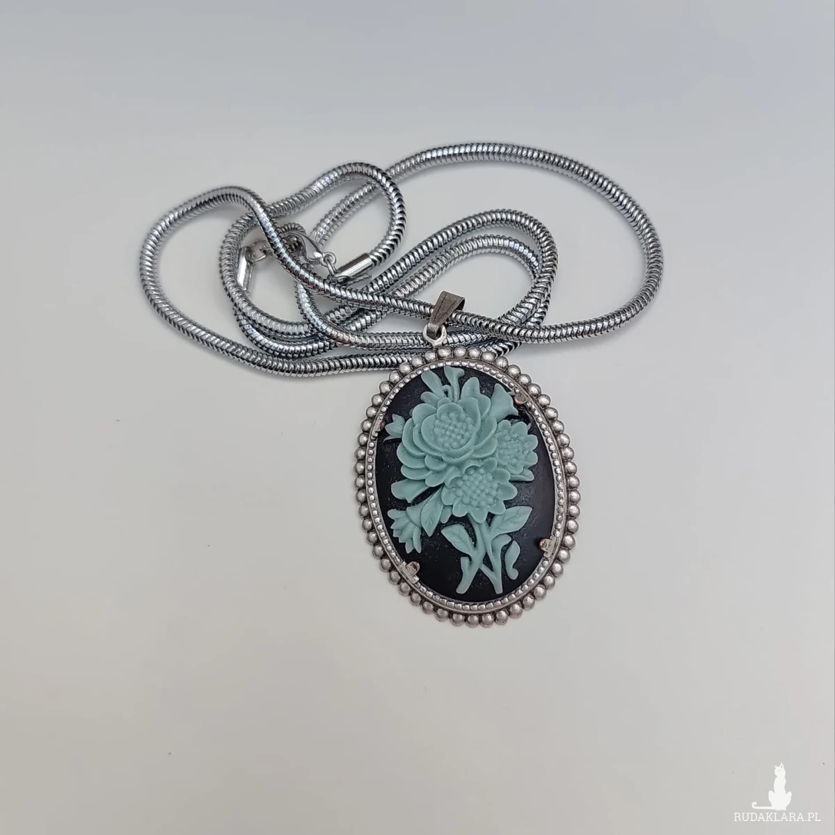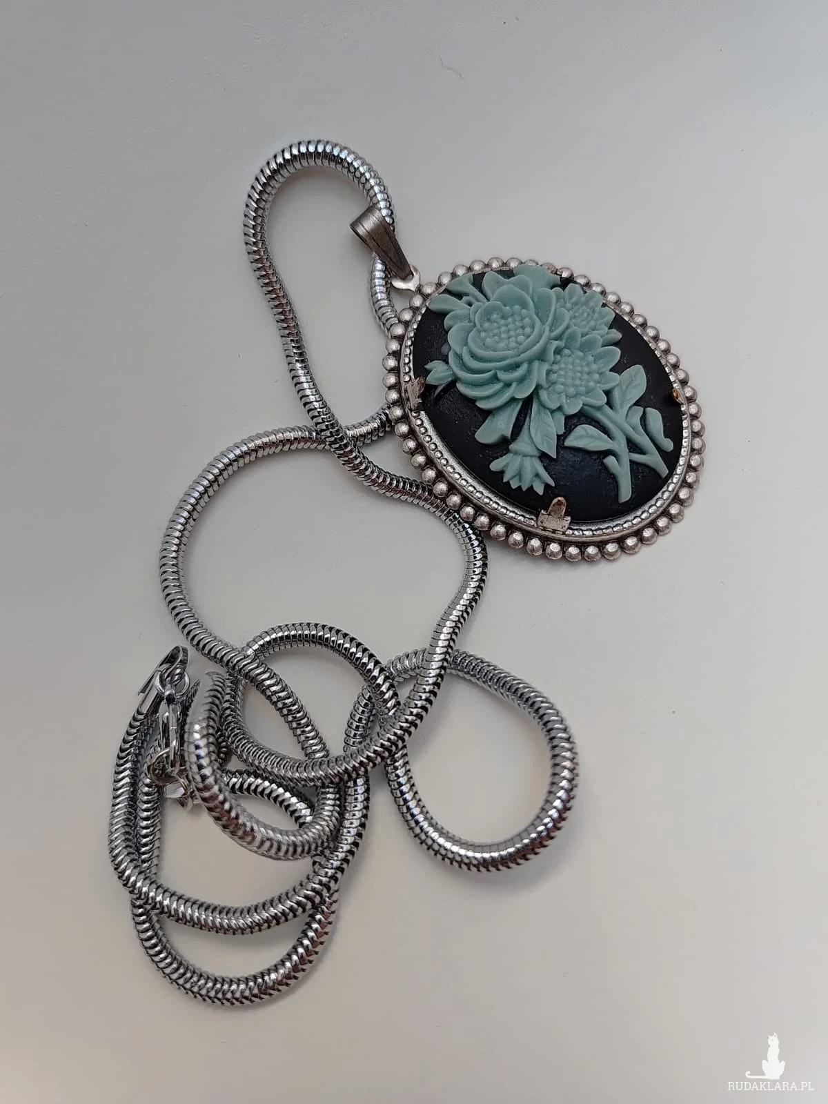 Naszyjnik z piękną cameą, dużą 5 cm, niebieski bukiet na czarnym tle, w mosiężnej oprawie posrebrzanej. Wisior zawieszony na łańcuszku typu żmijka ze stali nierdzewnej. Zapięcie ze stali w kolorze srebrnym. Długość z wisiorkiem 36 cm