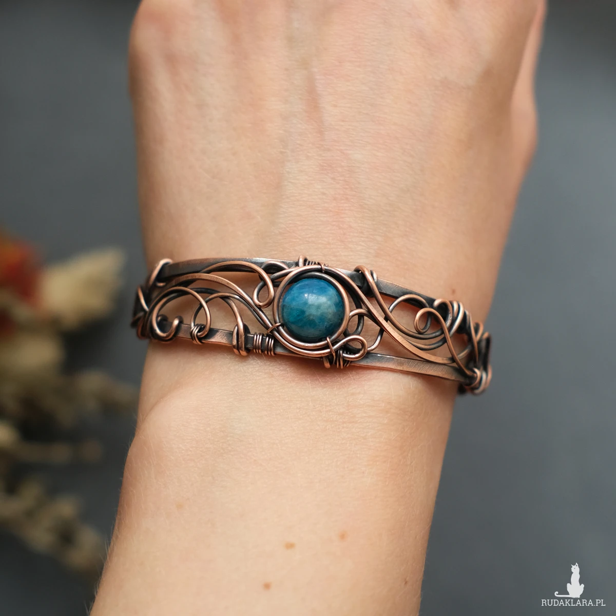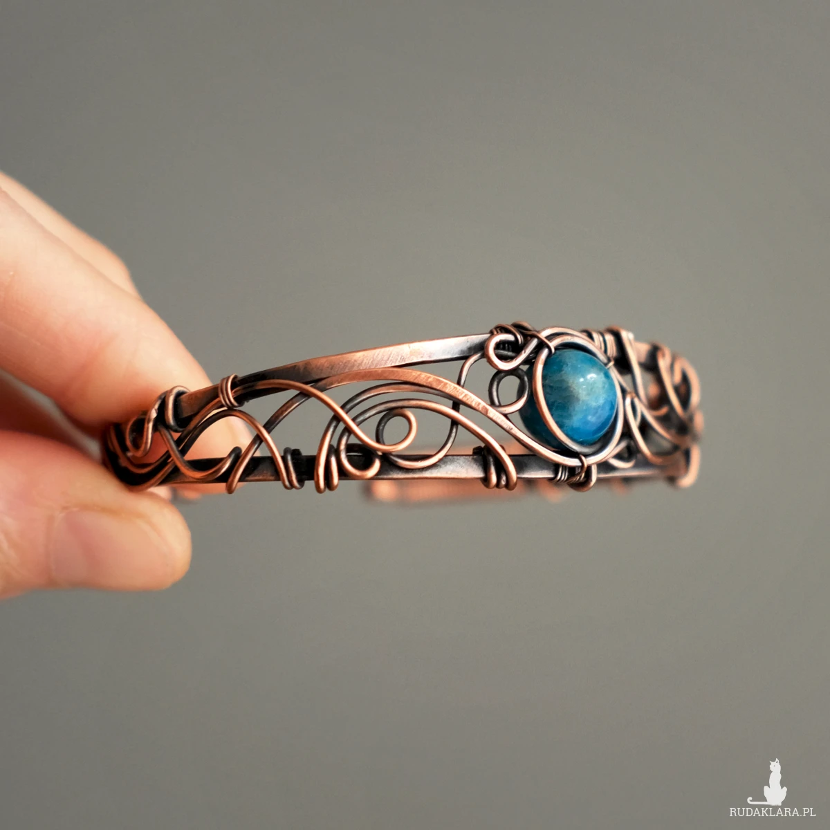 Miedziana bransoletka w elfickim stylu mieści w sobie kamień apatytu. Oplatają ją sploty miedzianego drutu nadające baśniowego klimatu.