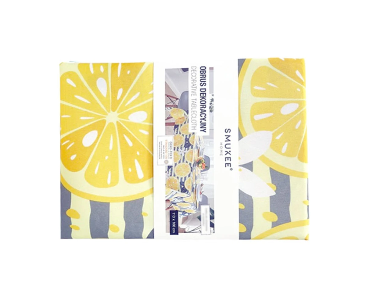 Nowy, modny obrus z  nadrukiem, wzór w cytrynki, rozmiar: 110x160 cm, materiał poliester 100 %. Wysoka jakość, certyfikat OEKO-TEX Standard 100. Obrus łatwy do utrzymania w czystości, marka smukee. Praktyczny obrus w stylu boho. Kolory: żółty, szary, biały. Prać w 30 stopniach.