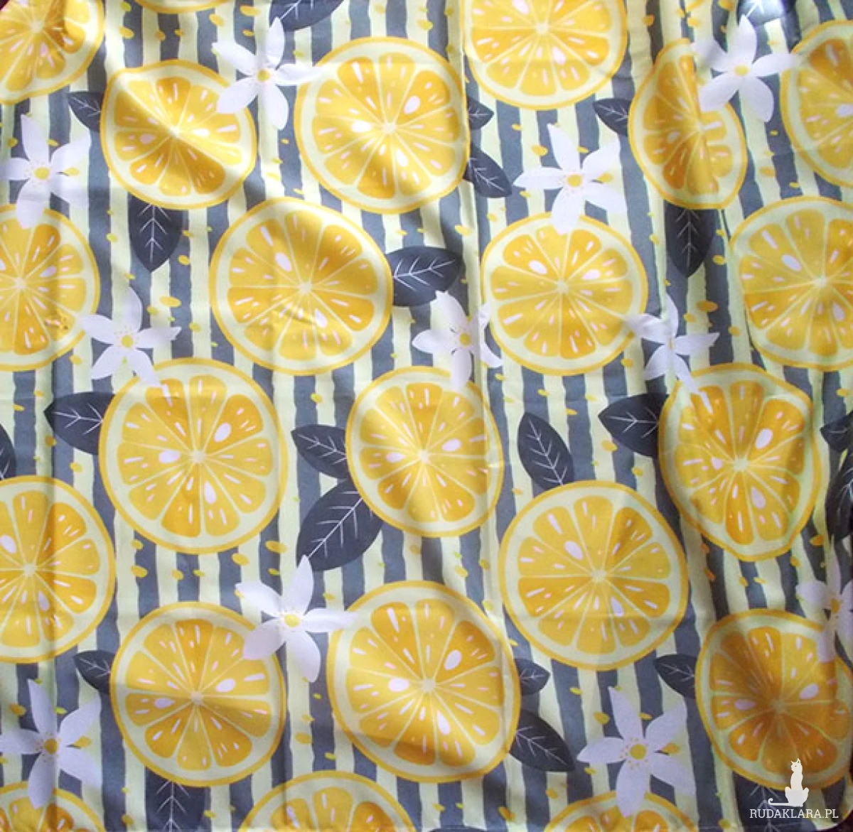 nowy obrus z nadrukiem w cytryny, plamoodprny obrus 110x160, cytryny obrus plamoodporny 110x160, owoce obrus 160x110, cytrusy obrus żółto szary, boho obrus dekoracyjny