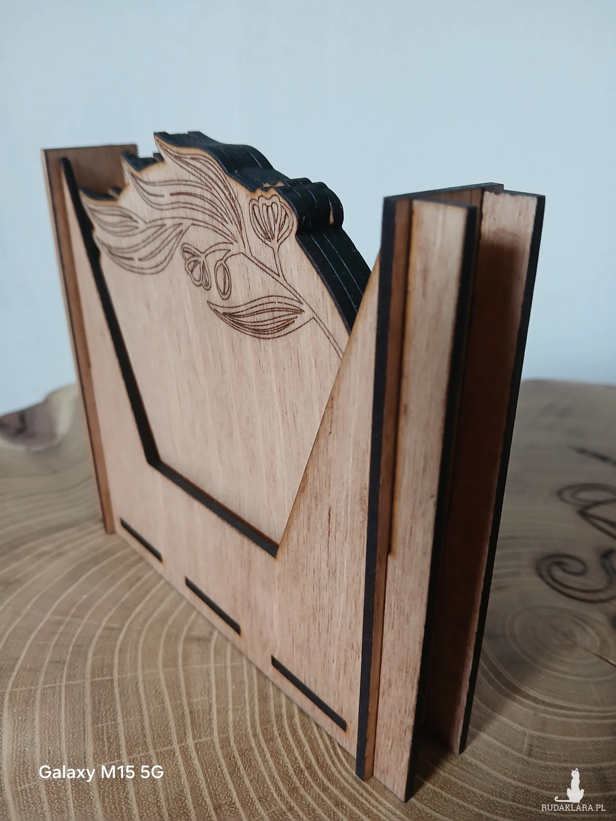 Podkładki pod kubki z delikatnym grawerem ,ze sklejki 3mm,woskowane, średnica 10 cm ,komplet 4 sztuk plus kasetka.