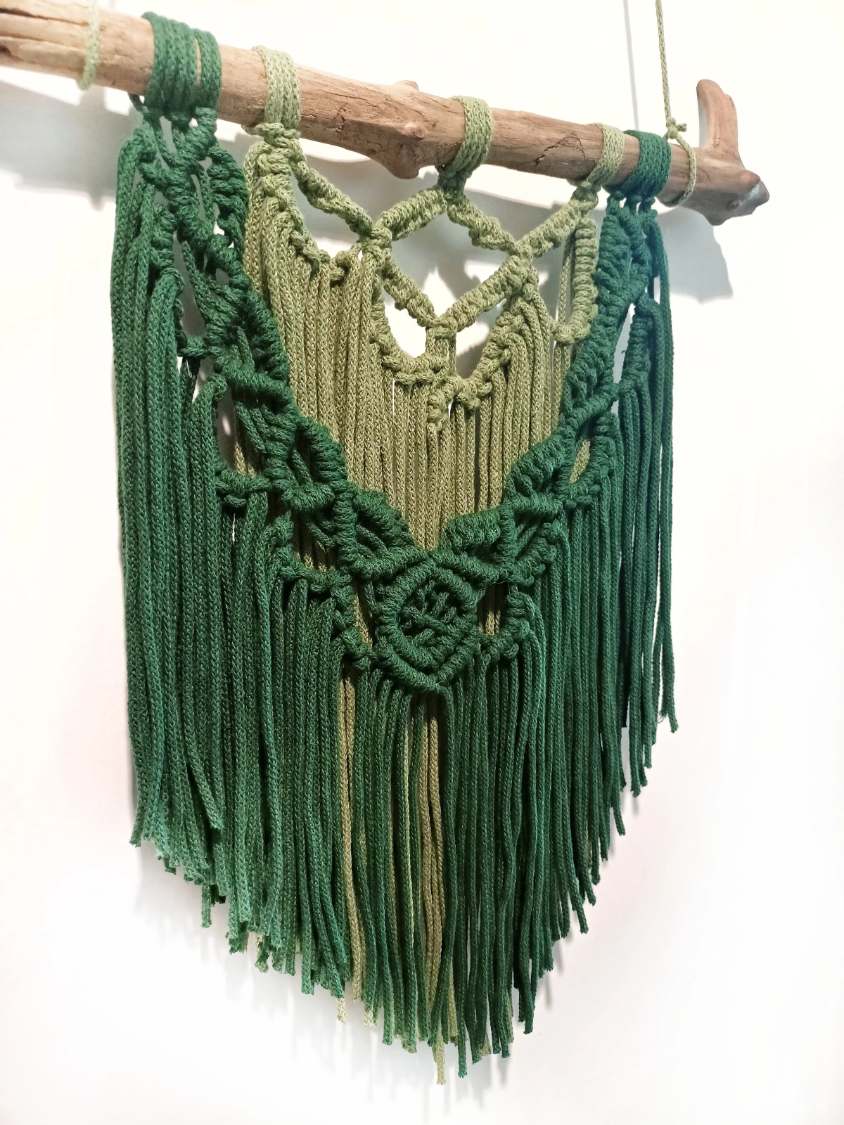 makrama na ścianę • mała makrama handmade • dekoracja boho do salonu • makrama szałwiowa • ozdoba z bawełnianego sznurka • makrama na gałęzi • dekoracja rustykalna • makrama zielona • polskie rękodzieło • prezent boho handmade