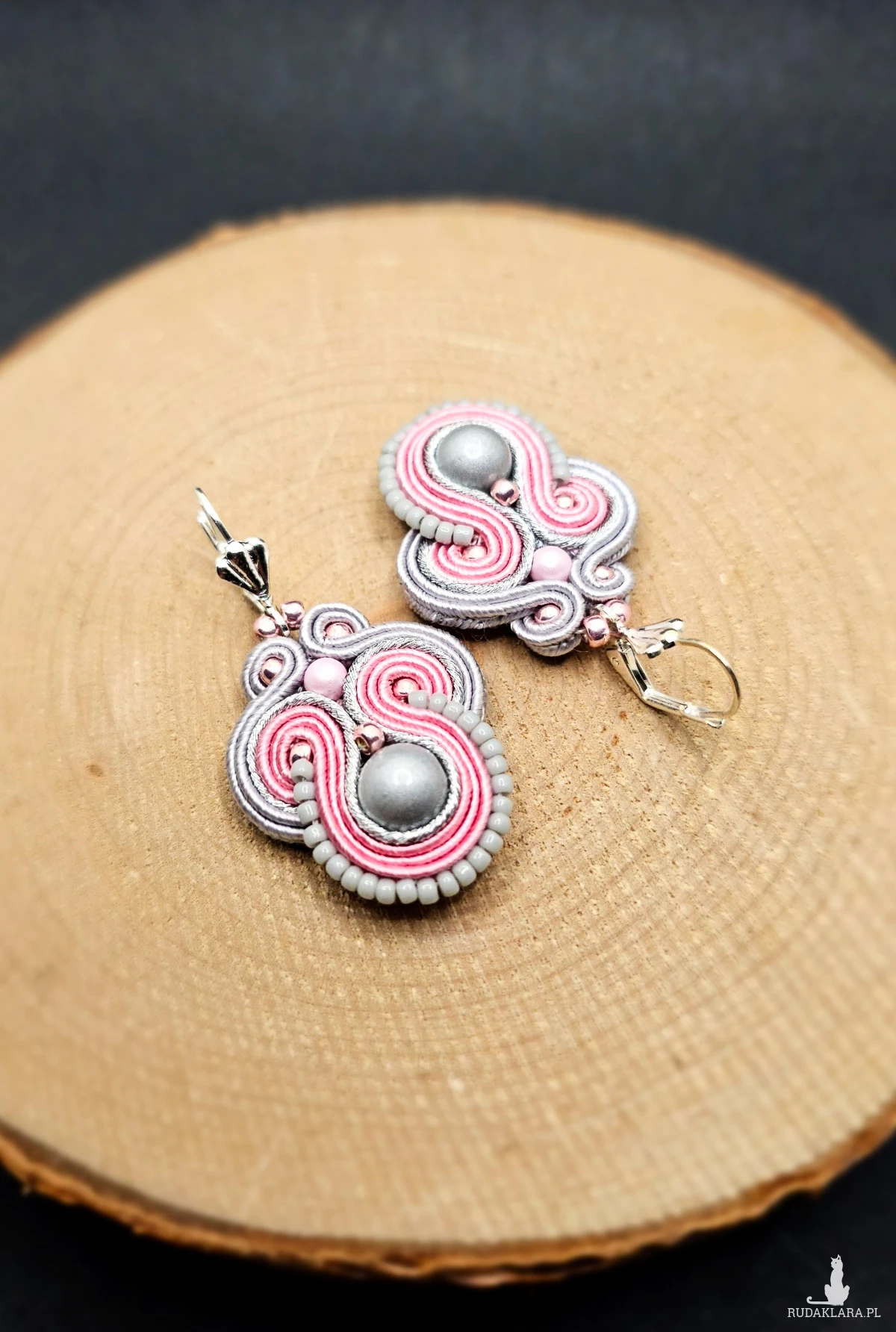 Kolczyki w kolorze różowo-szarym z szklanymi kulkami. Srebrne kulki otoczone sznurkami sutasz oraz szklanymi koralikami w kolorze szarym i różowym o różnych wielkościach. Srebrny metalizowany sznurek dodaje kolczykom elegancji i wyrazistości. Kolczyki zawieszone na ozdobnych biglach angielskich w kolorze srebrnym.
