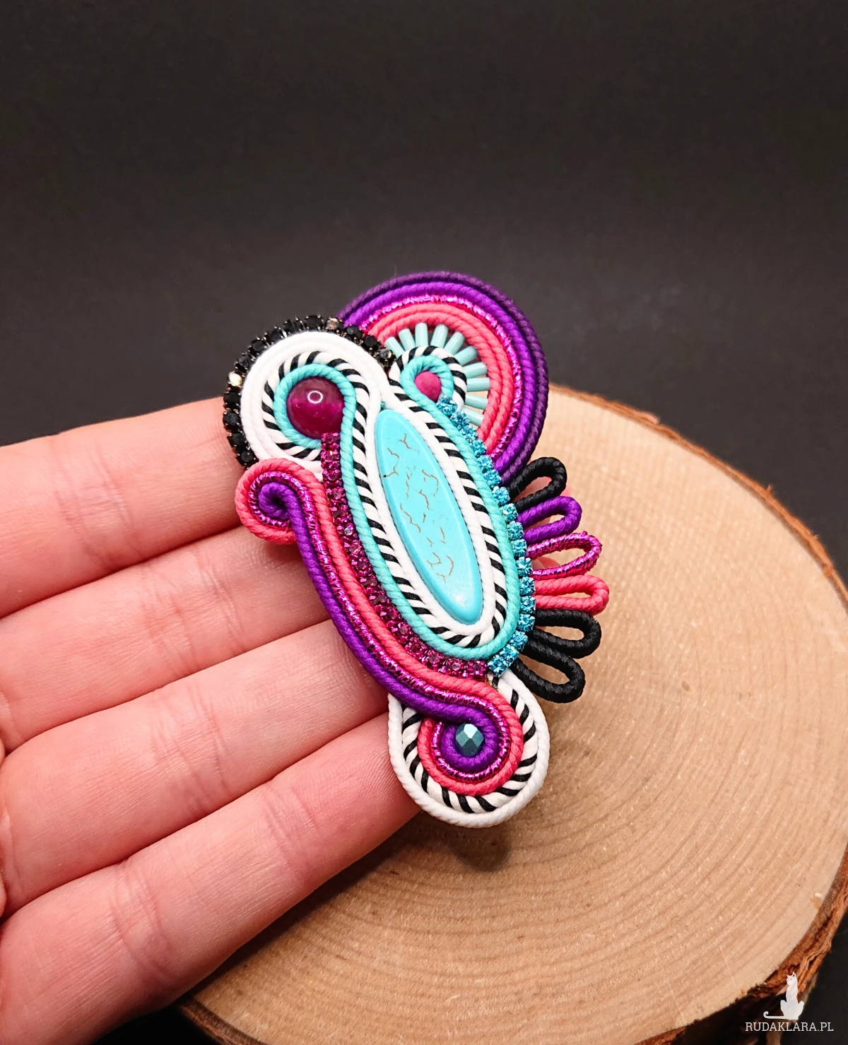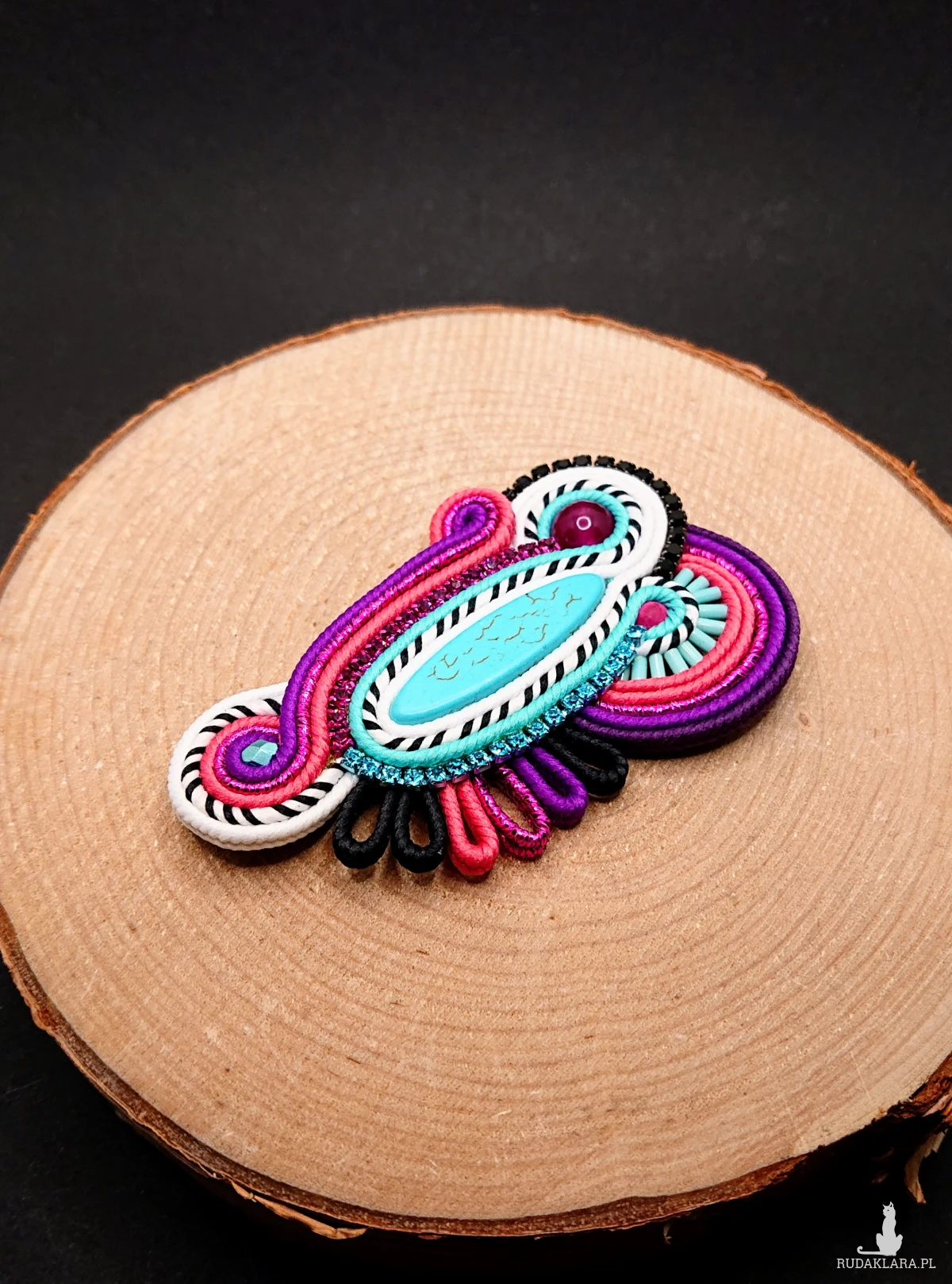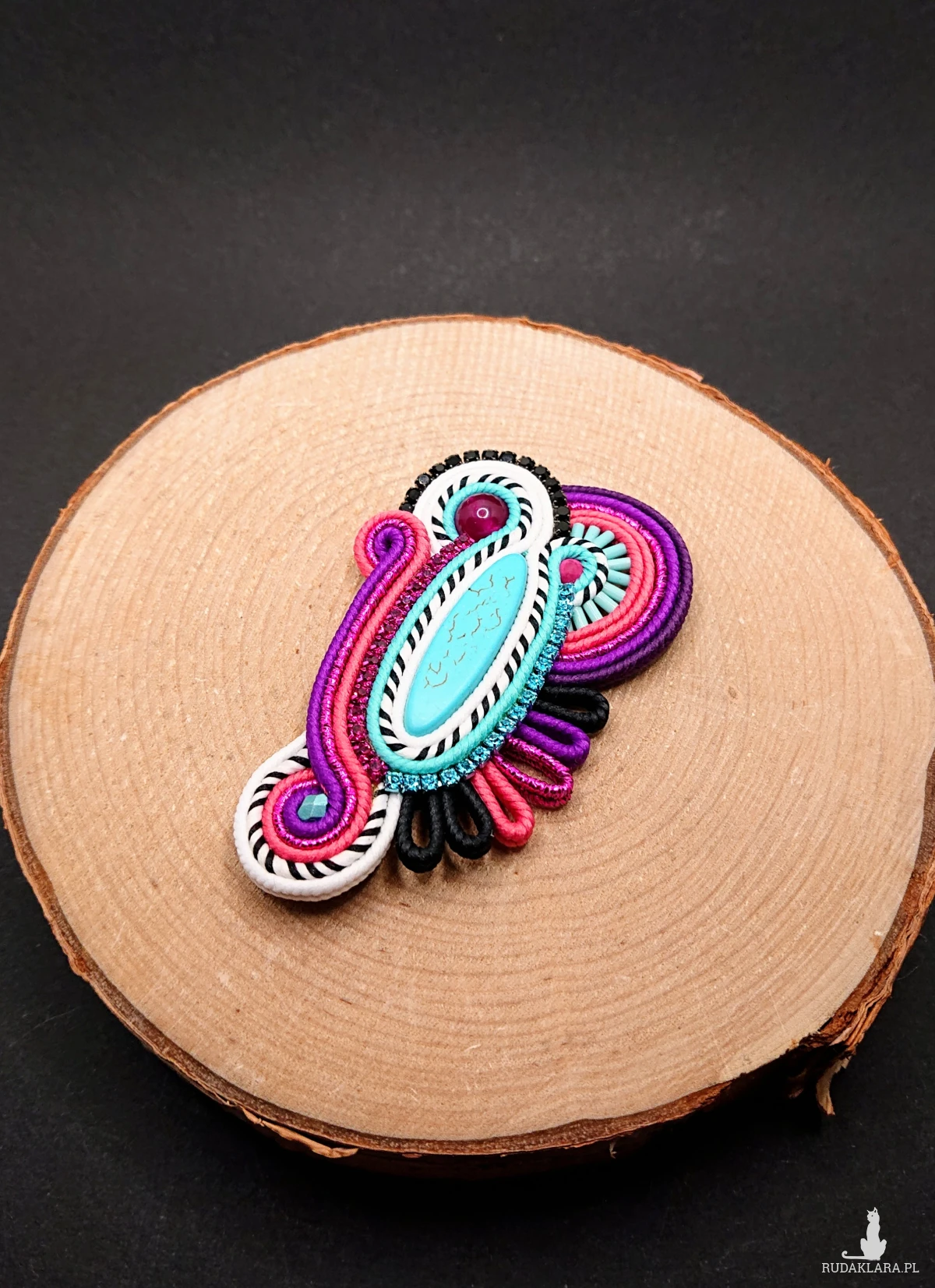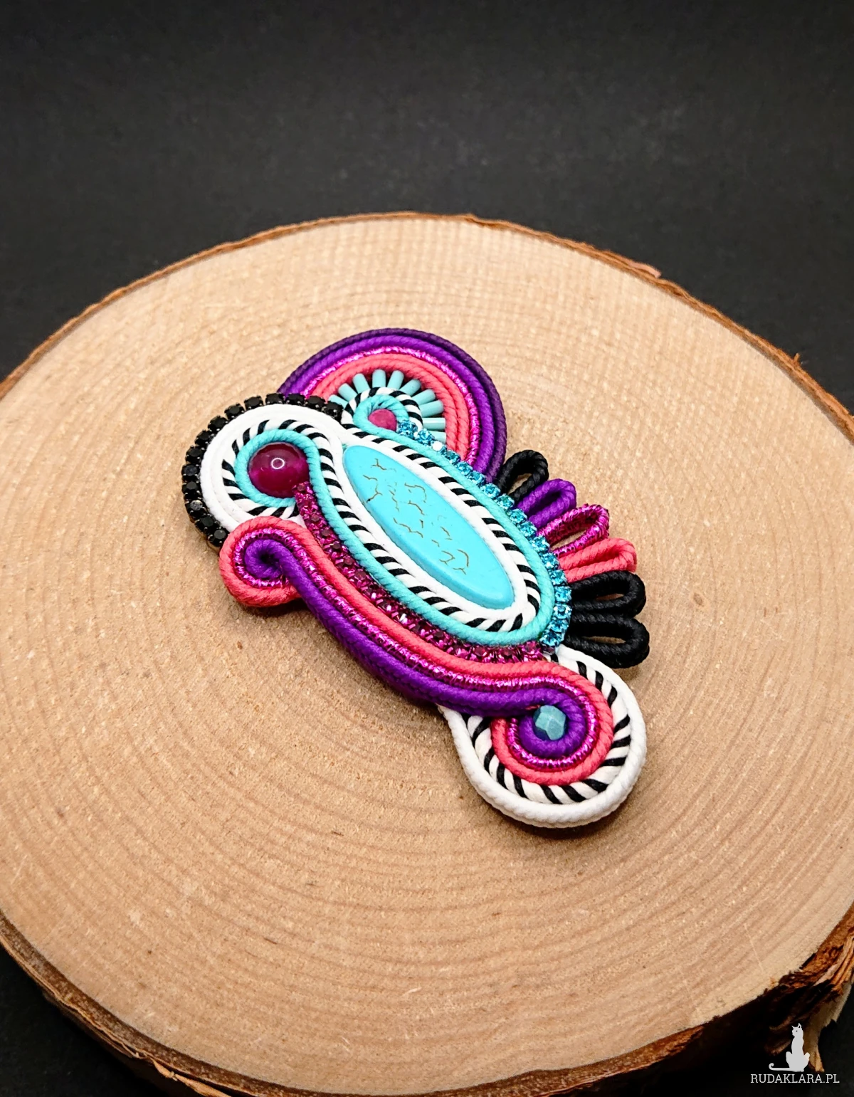 Owalny turkusowy howlit otoczony ozdobnym kolorowym sznurkiem oraz polskimi sznurkami sutasz. Szklane koraliki o różnych kształtach i wielkościach, jadeit oraz taśma z cyrkoniami nadają jej blasku. Broszka w wyrazistych kolorach z czarno-białymi akcentami.