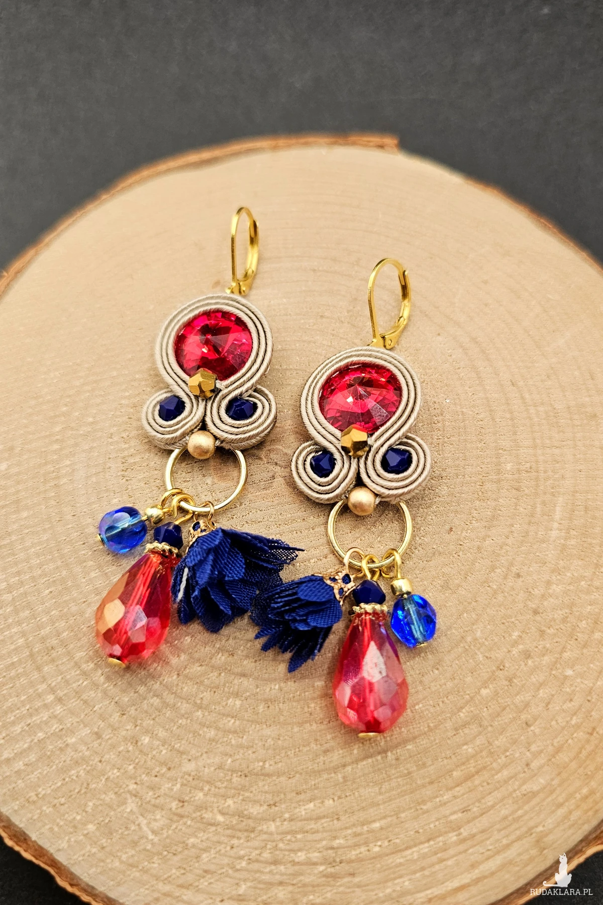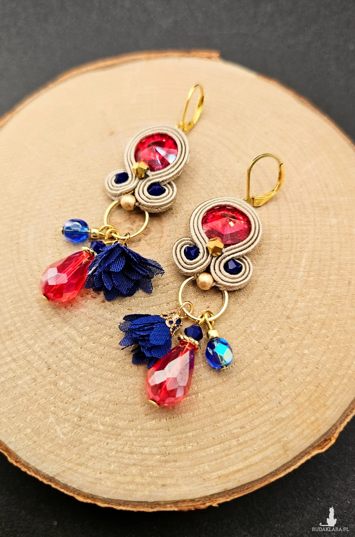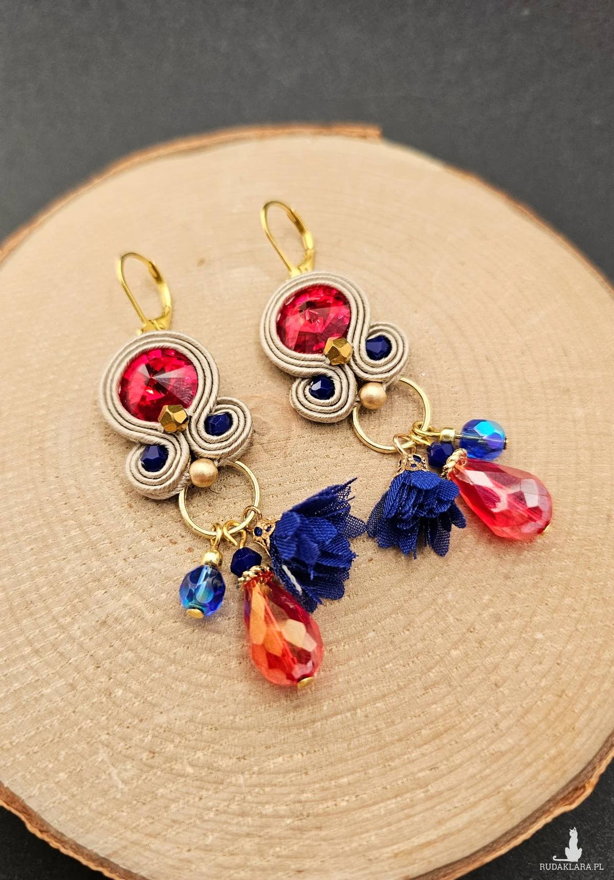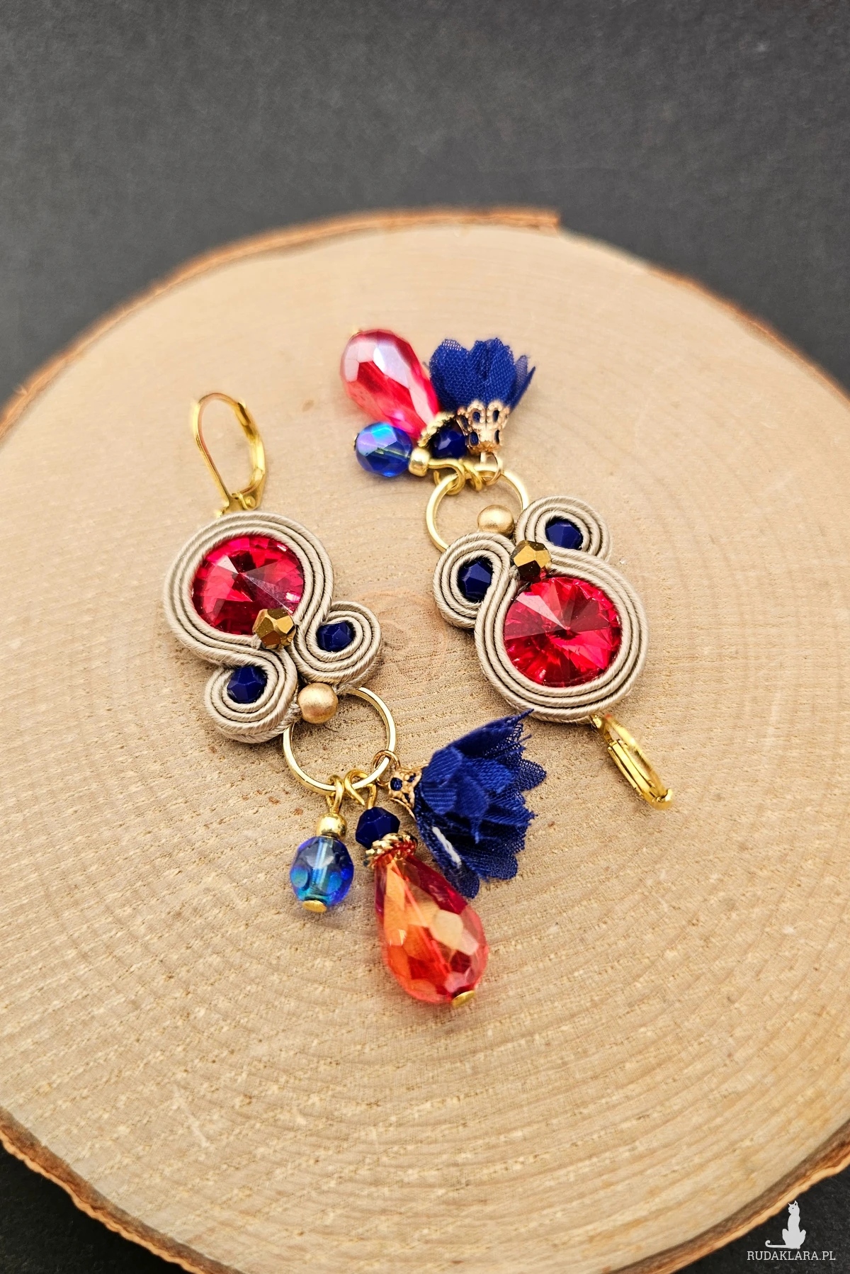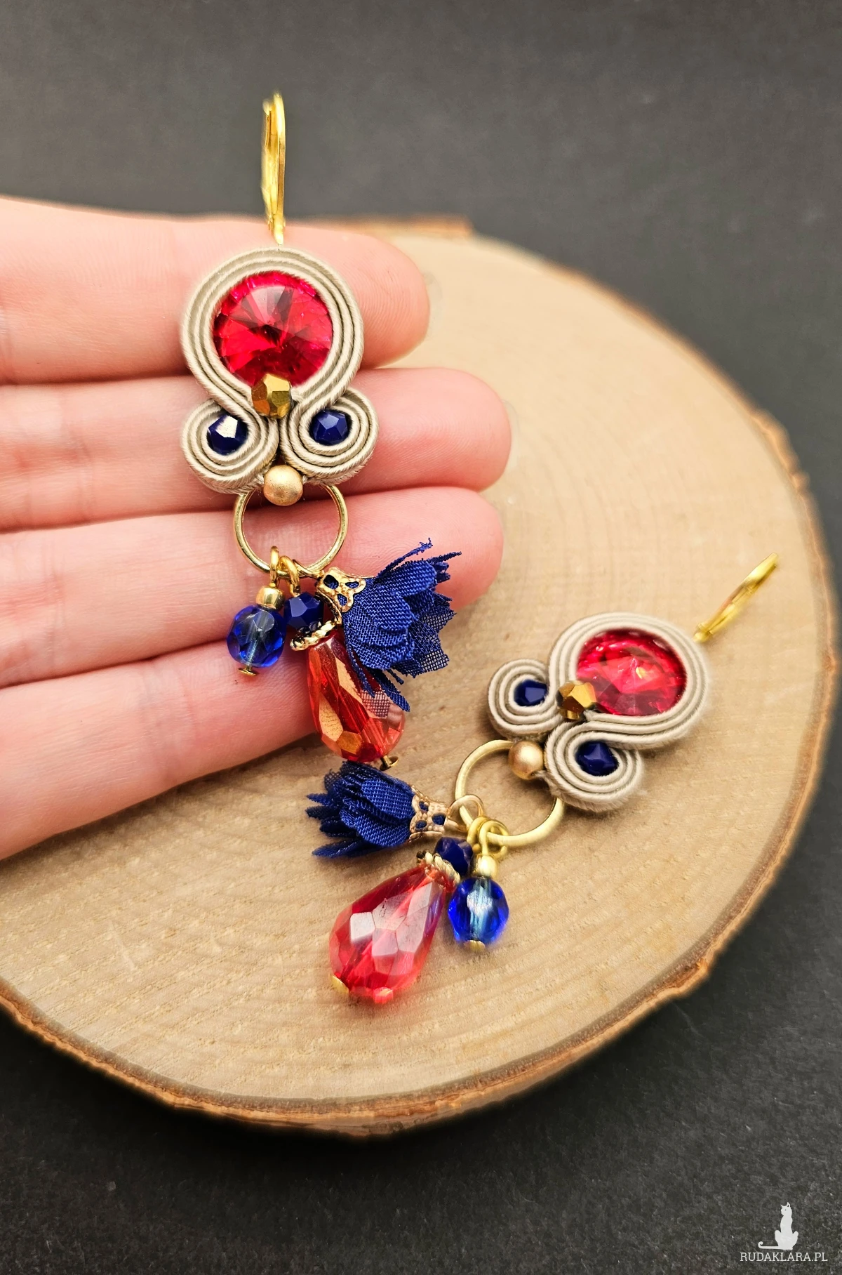 Szklane fasetowane kryształki otoczone sznurkami sutasz oraz szklanymi koralikami. Dół kolczyków zdobią ozdobne błyszczące zawieszki z koralików i kryształków. Kolczyki zawieszone na biglach angielskich w kolorze złotym. Kolorystyka kolczyków: beżowy, niebieski, czerwony, złoty.