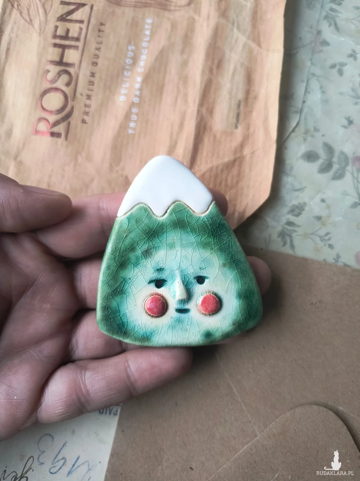Broszka ceramiczna w postaci góry o wymiarach ok 4,5 cm x 6,5 cm, wykonana z gliny szamotowej wypalona na biskwit, a następnie szkliwiona w temp ok 1260 stopni C. polecam serdecznie.