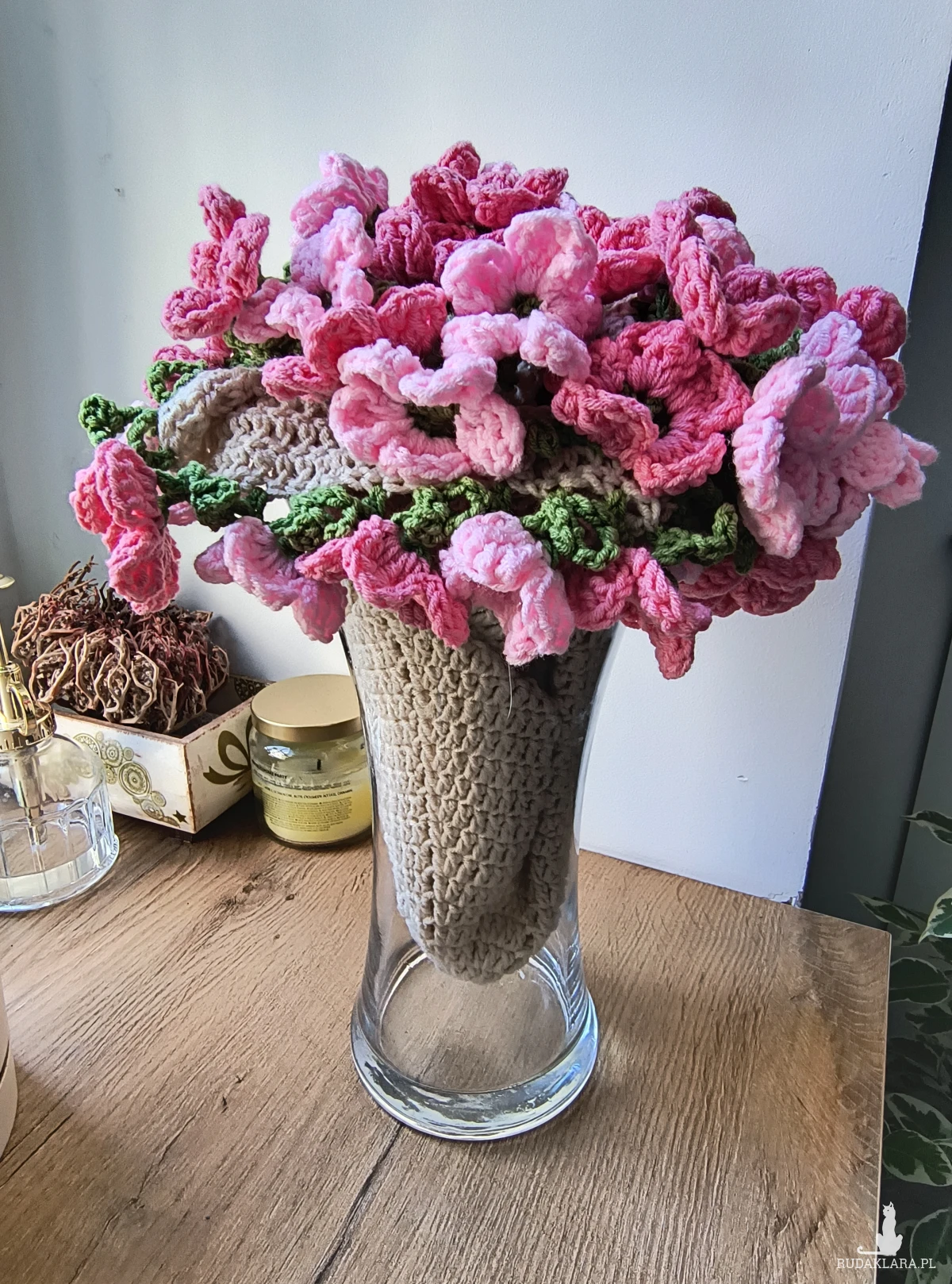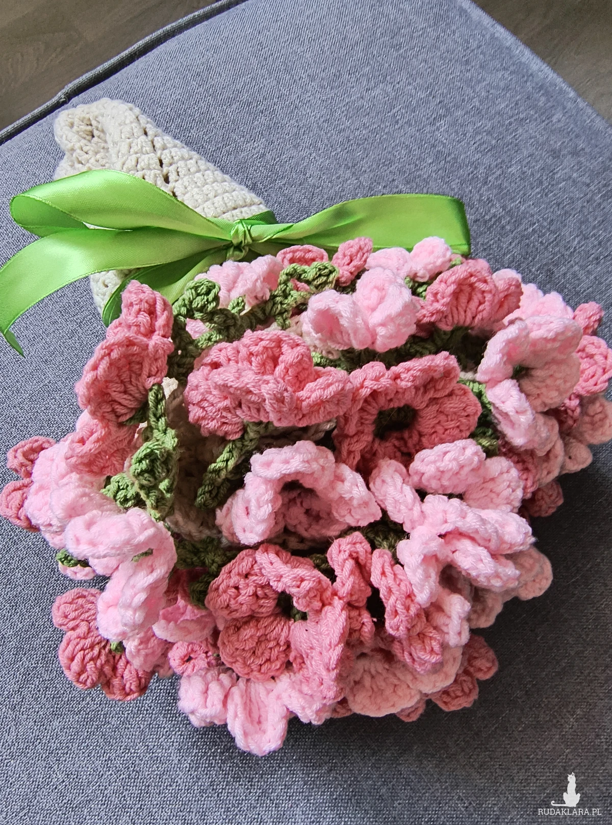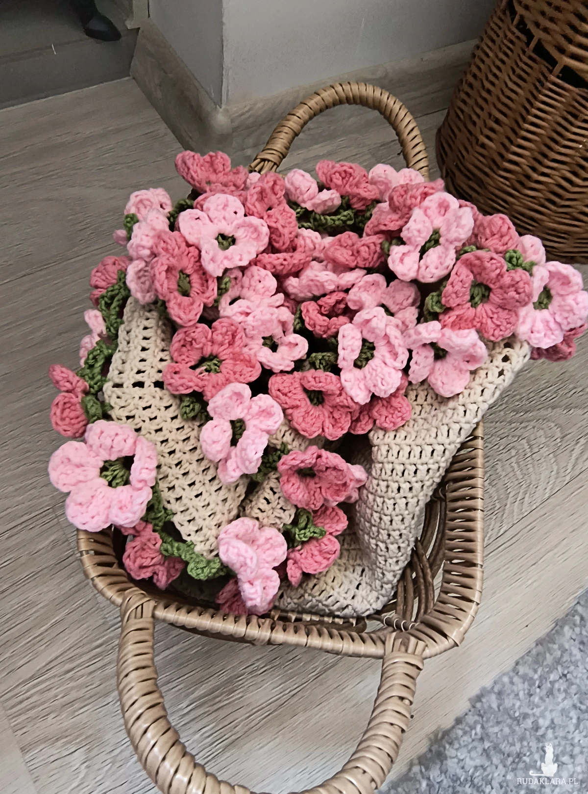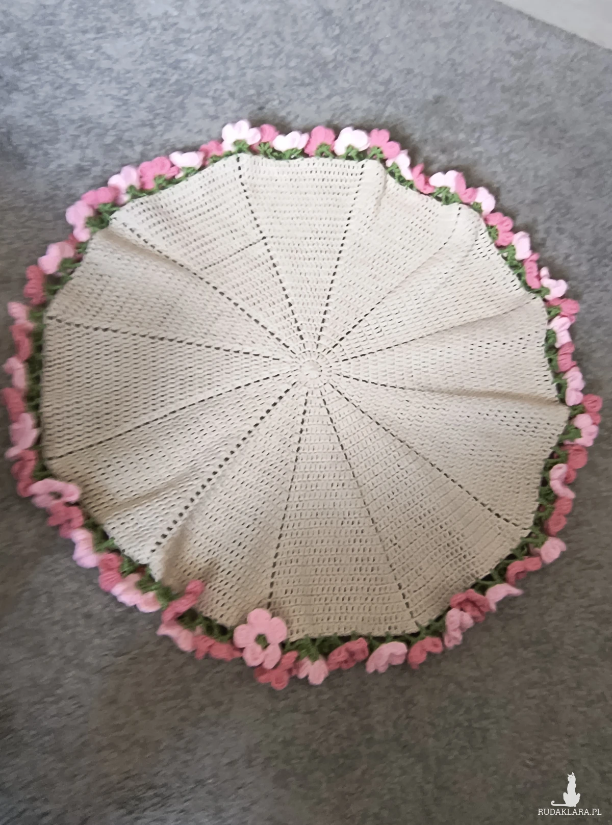 Serwetka o średnicy 56 cm, ale po złożeniu piękny, kolorowy bukiet z 58 ręcznie robionych kwiatków. Całość robiona szydełkiem. Piękny niepowtarzalny prezent lub ozdoba w domu.