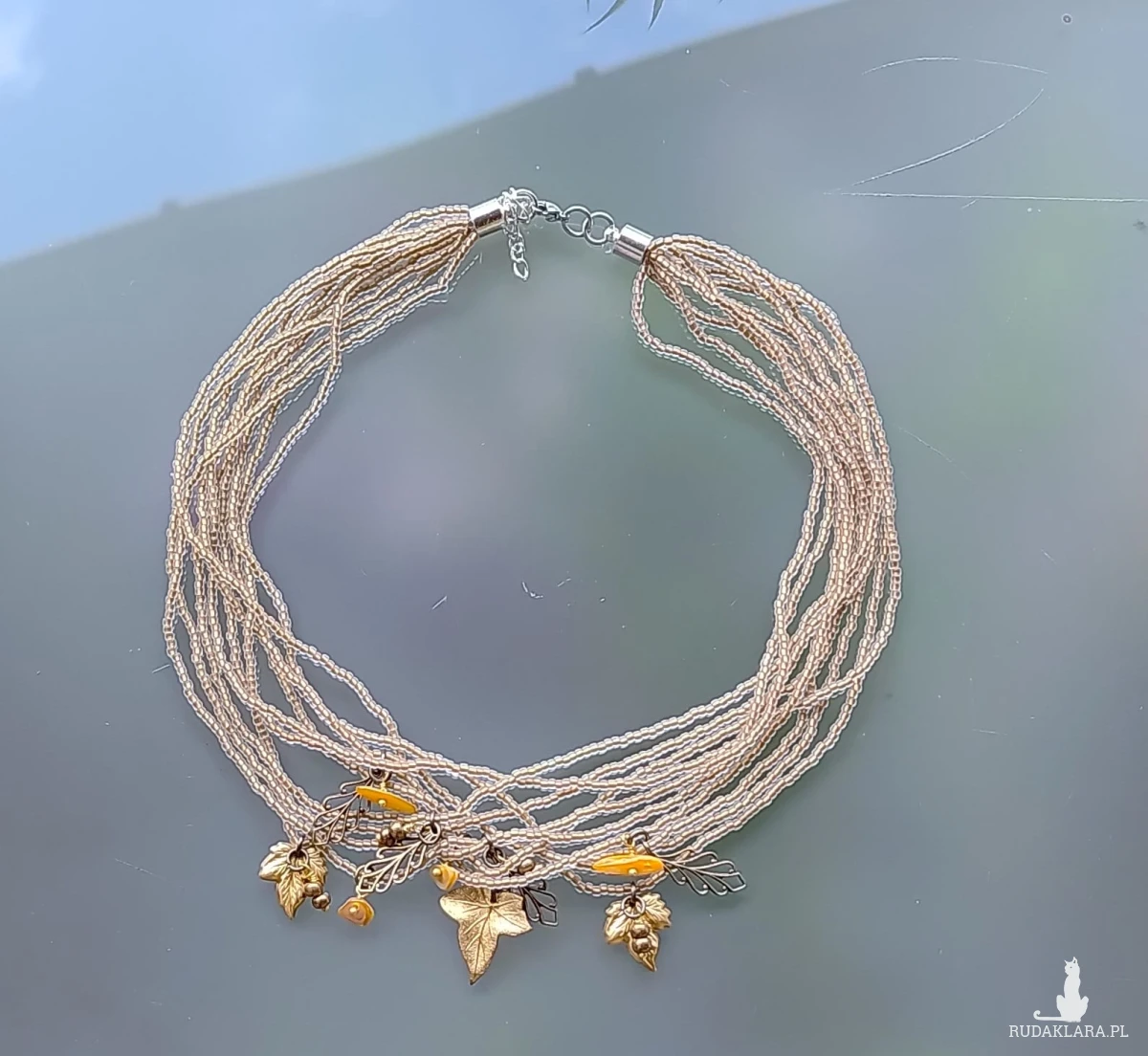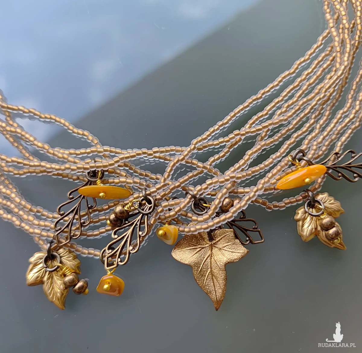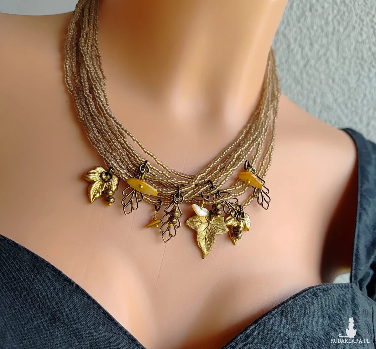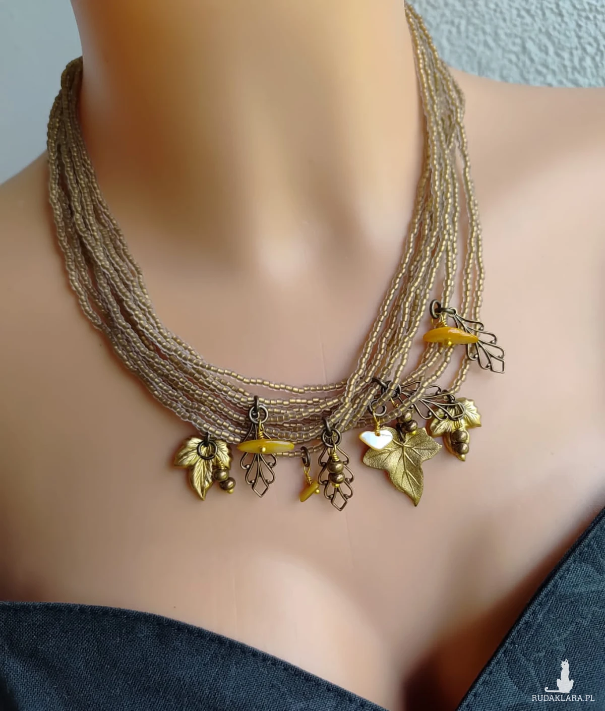 Naszyjnik z matowych koralików drobnych na których zawieszone są mosiężne różne liście i koraliki szklane kuleczki 3 mm i koraliki z barwionej masy perłowej.  Objetość 42 cm plus 3 cm łańcuszka. Naszyjnik mały. Delikatny, lekki.