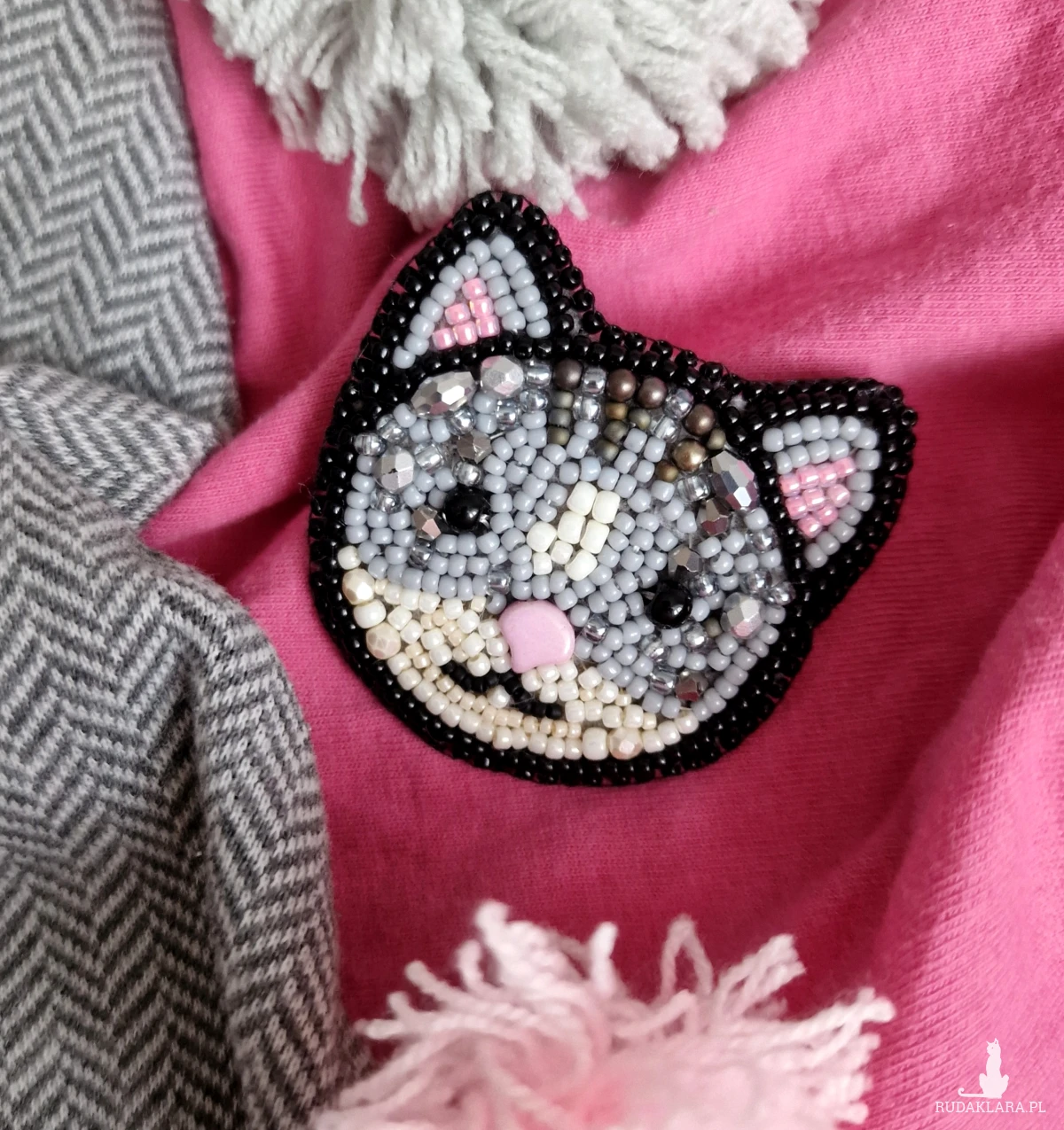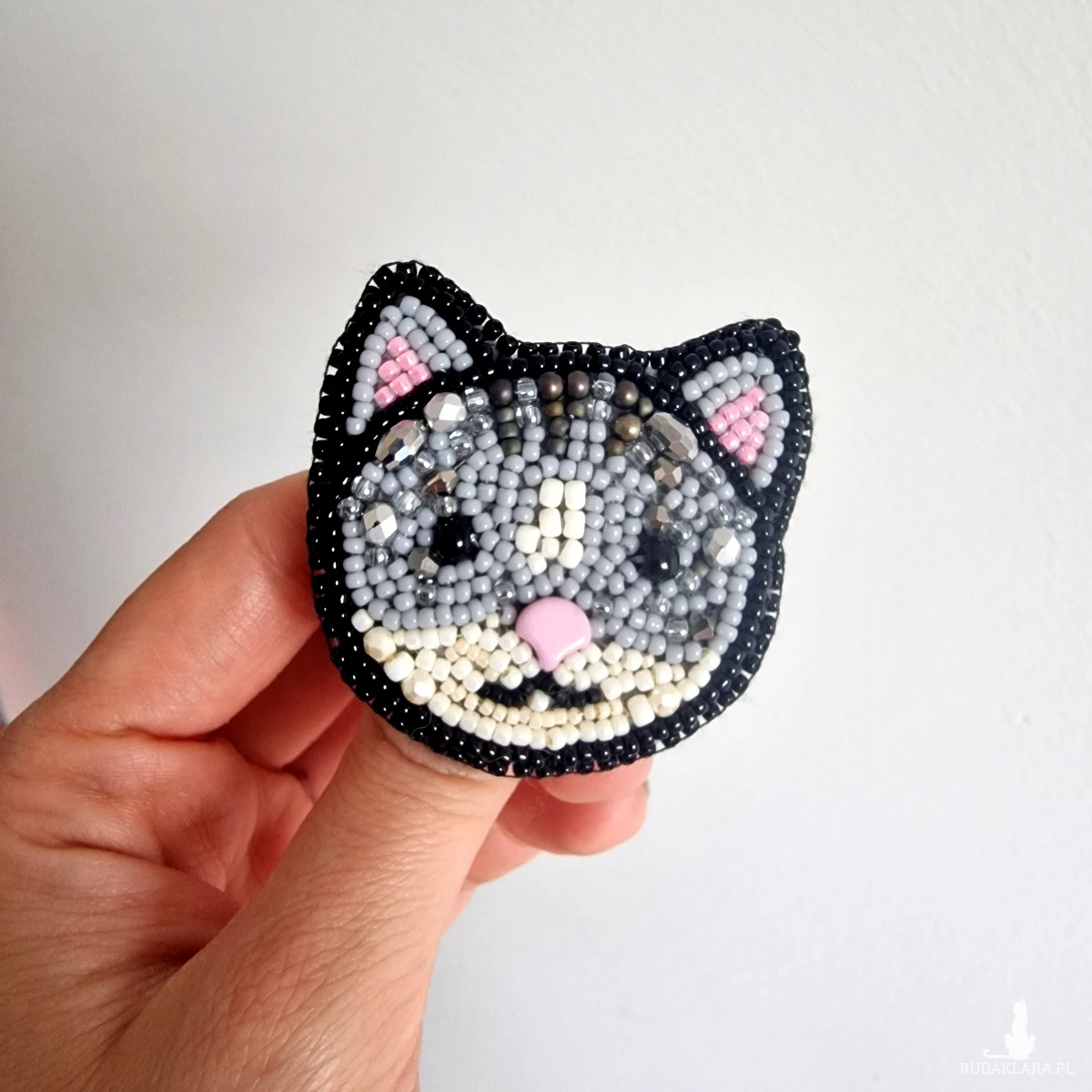 Biżuteria tekstylna. Ręcznie haftowana koralikami broszka - głowa kotka. Wykonana z koralików szklanych toho, kryształków i szklanych kuleczek. Z tyłu klasyczne zapięcie. Wymiary: 5×5,5cm.