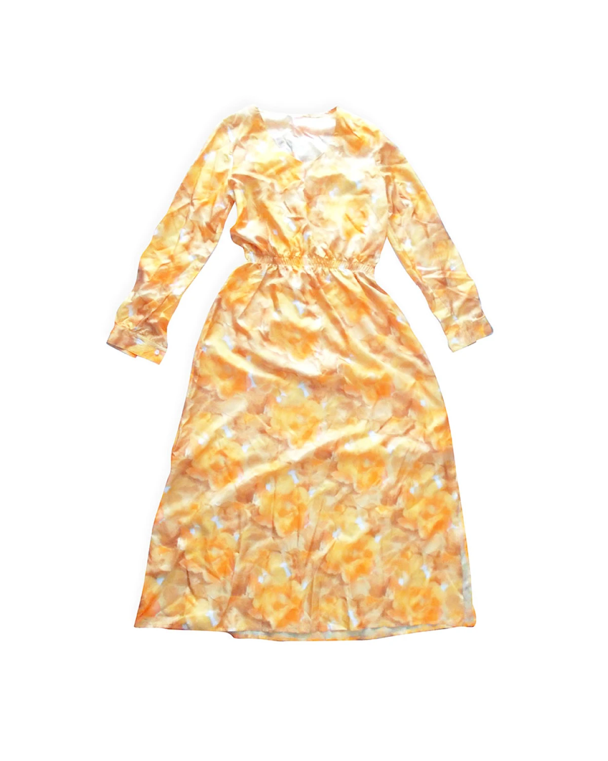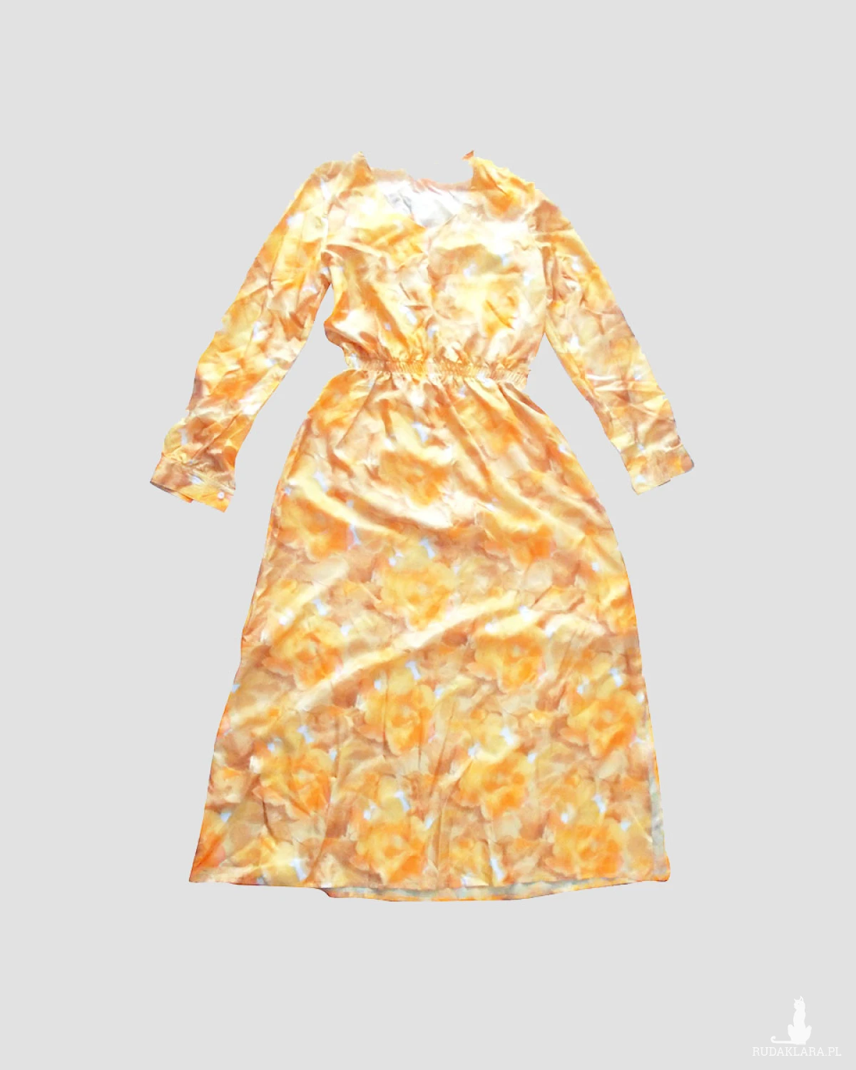 Nowa, oryginalna sukienka w stylu boho. Została uszyta z kuponu naturalnego jedwabiu. Sukienka zwiewna, prosta i elegancka. Długa sukienka, rozcięcie z boku (do wysokości kolana). Długi rękaw zapinany na guziczek. W pasie gumka, dekolt w szpic. Wymiary na płasko: