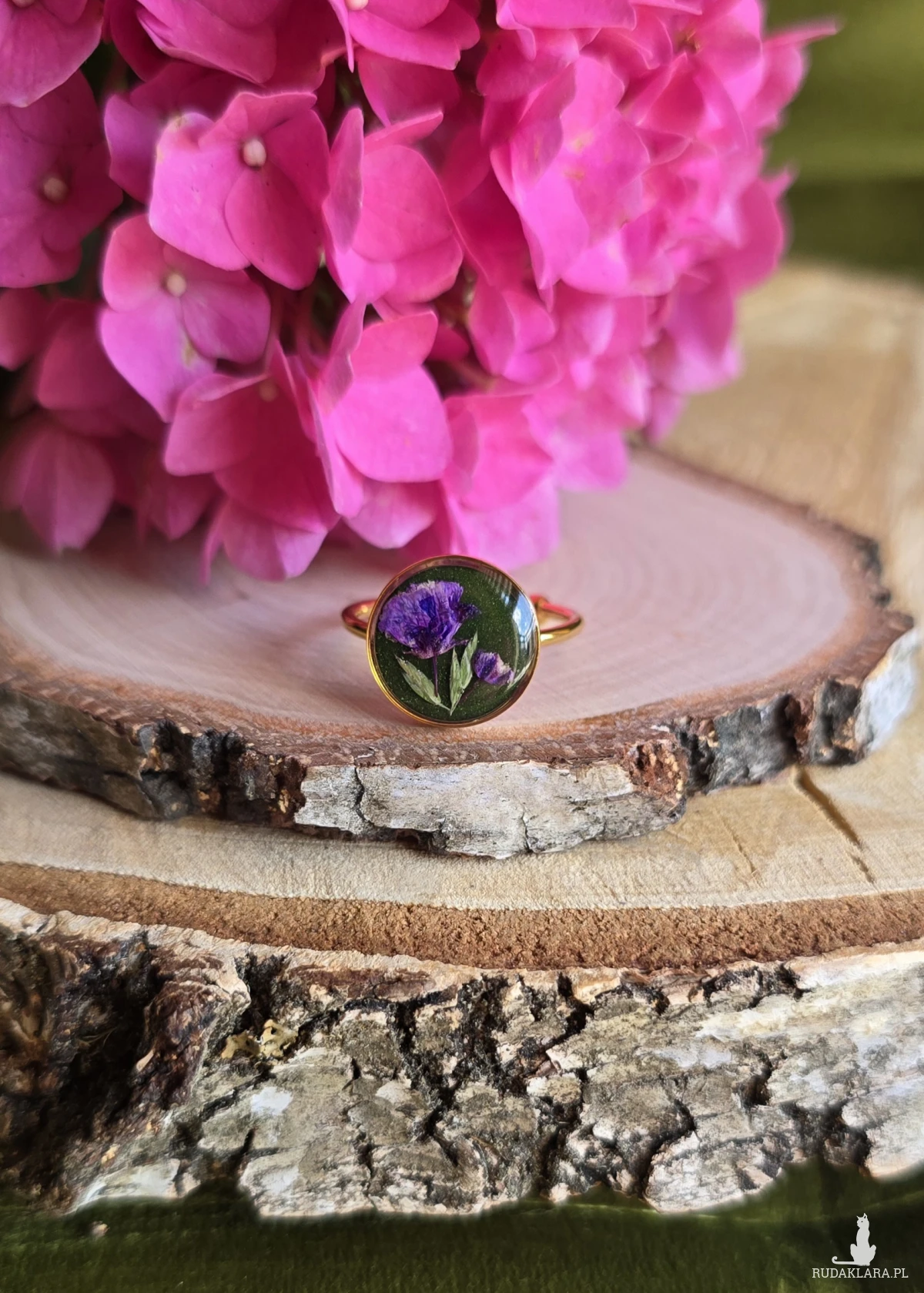 Oferuję Państwu unikalną biżuterię. Pierścionek jest wykonany z suszonych kwiatów i żywicy epoksydowej. Biżuteria jest wspaniałym i oryginalnym prezentem na lata.