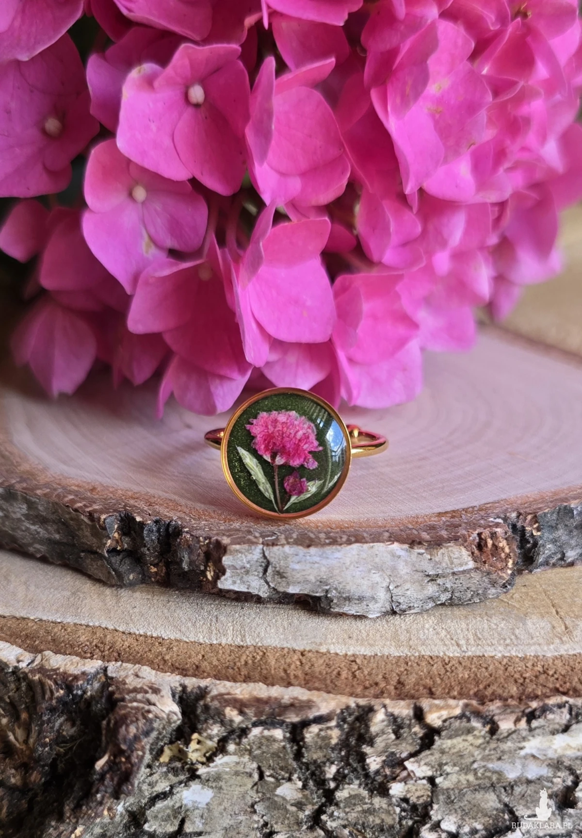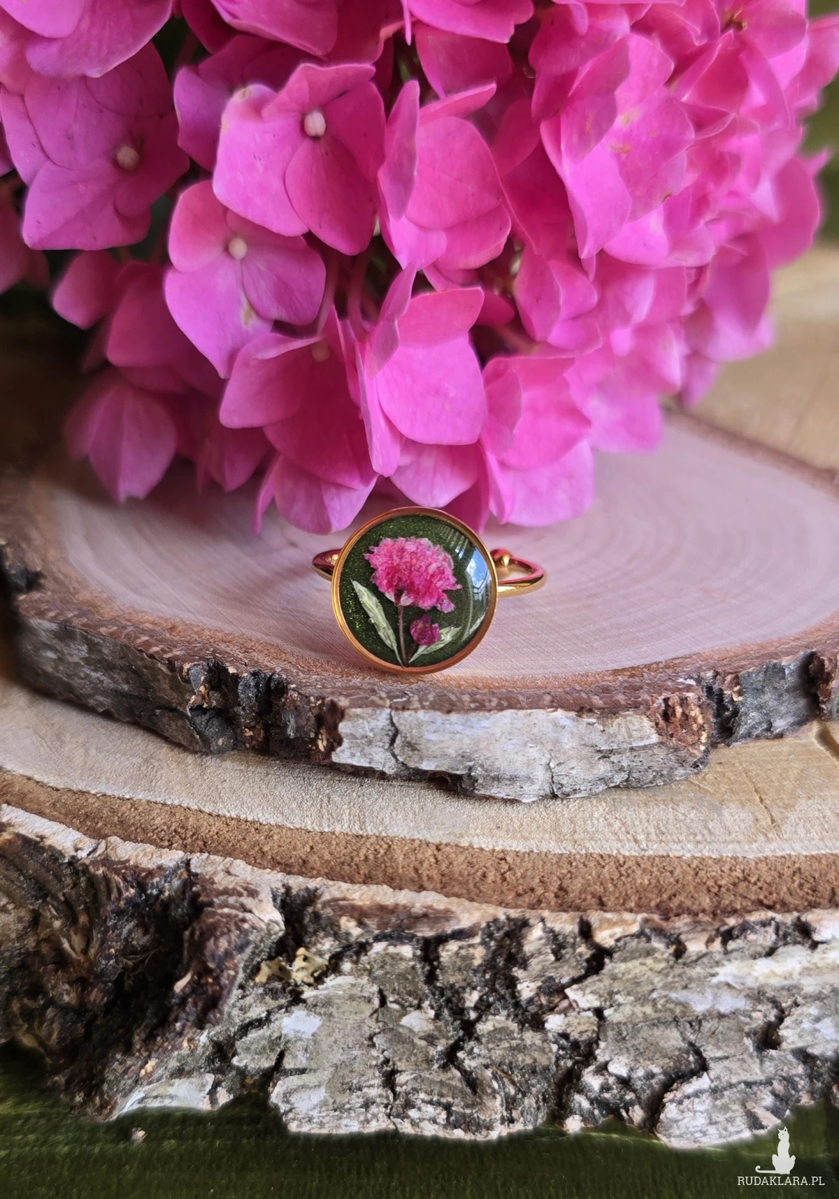 Oferuję Państwu unikalną biżuterię. Pierścionek jest wykonany z suszonych kwiatów i żywicy epoksydowej. Biżuteria jest wspaniałym i oryginalnym prezentem na lata.