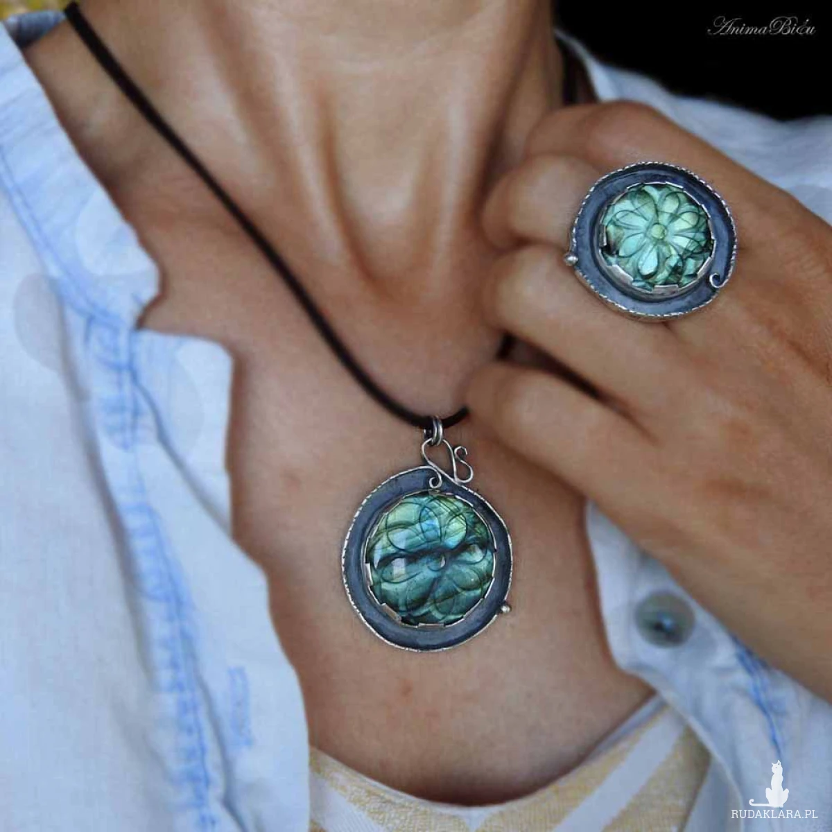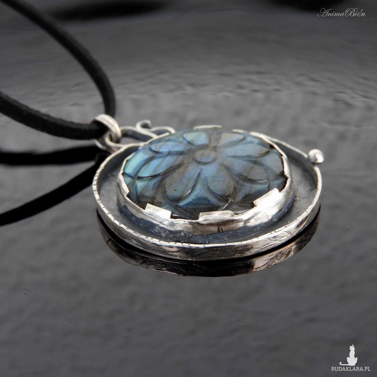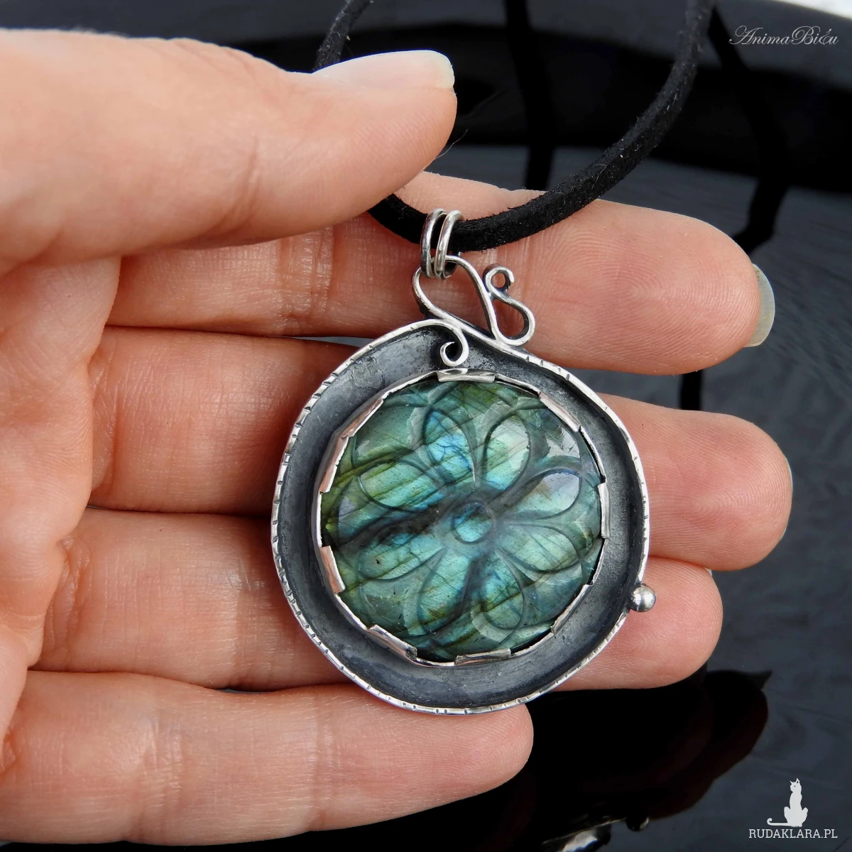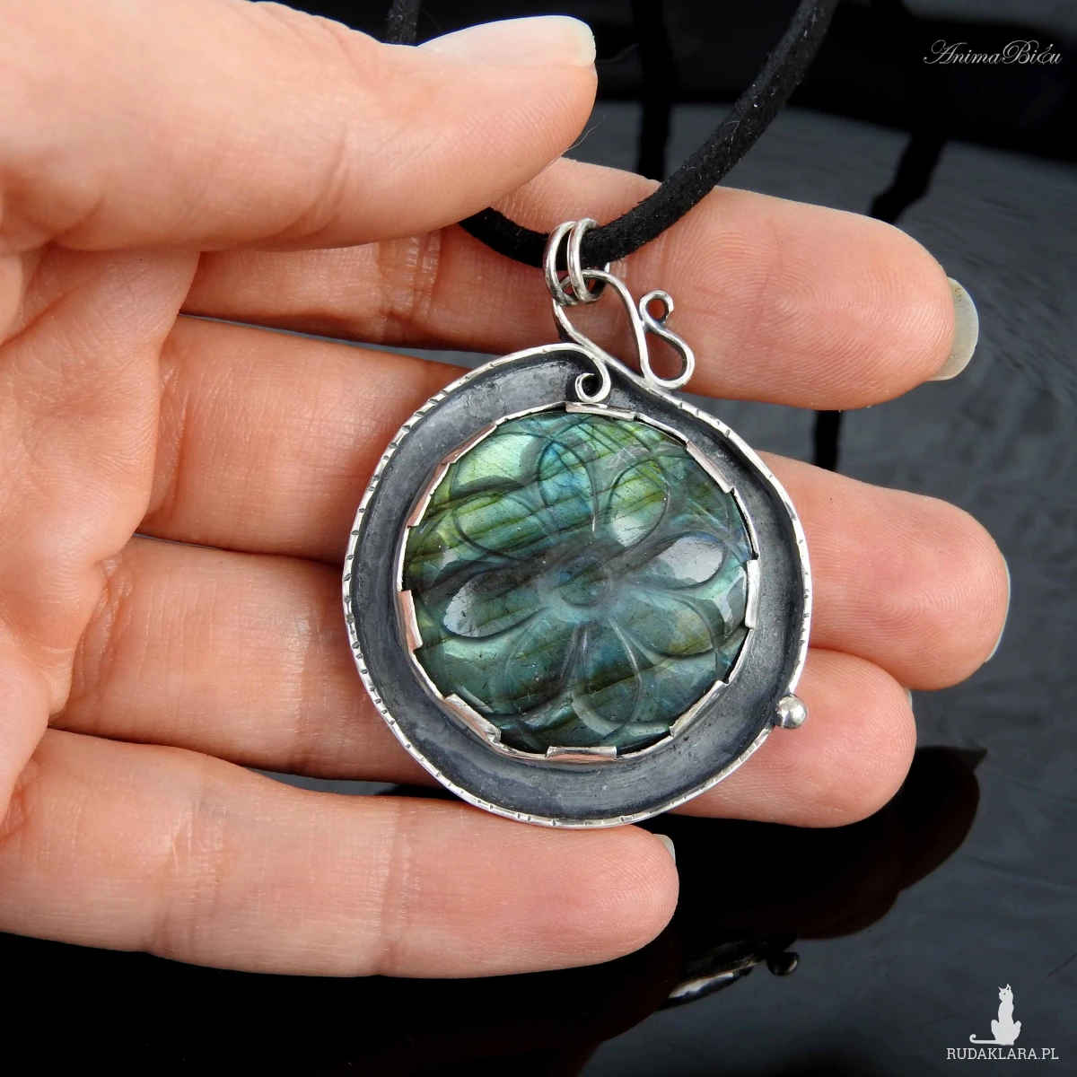 labradoryt rzeźbiony na kształt mandali, iryzujący w kolorze zieleni i błękitu