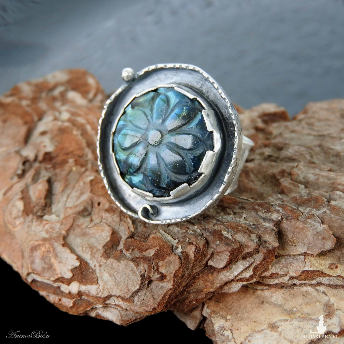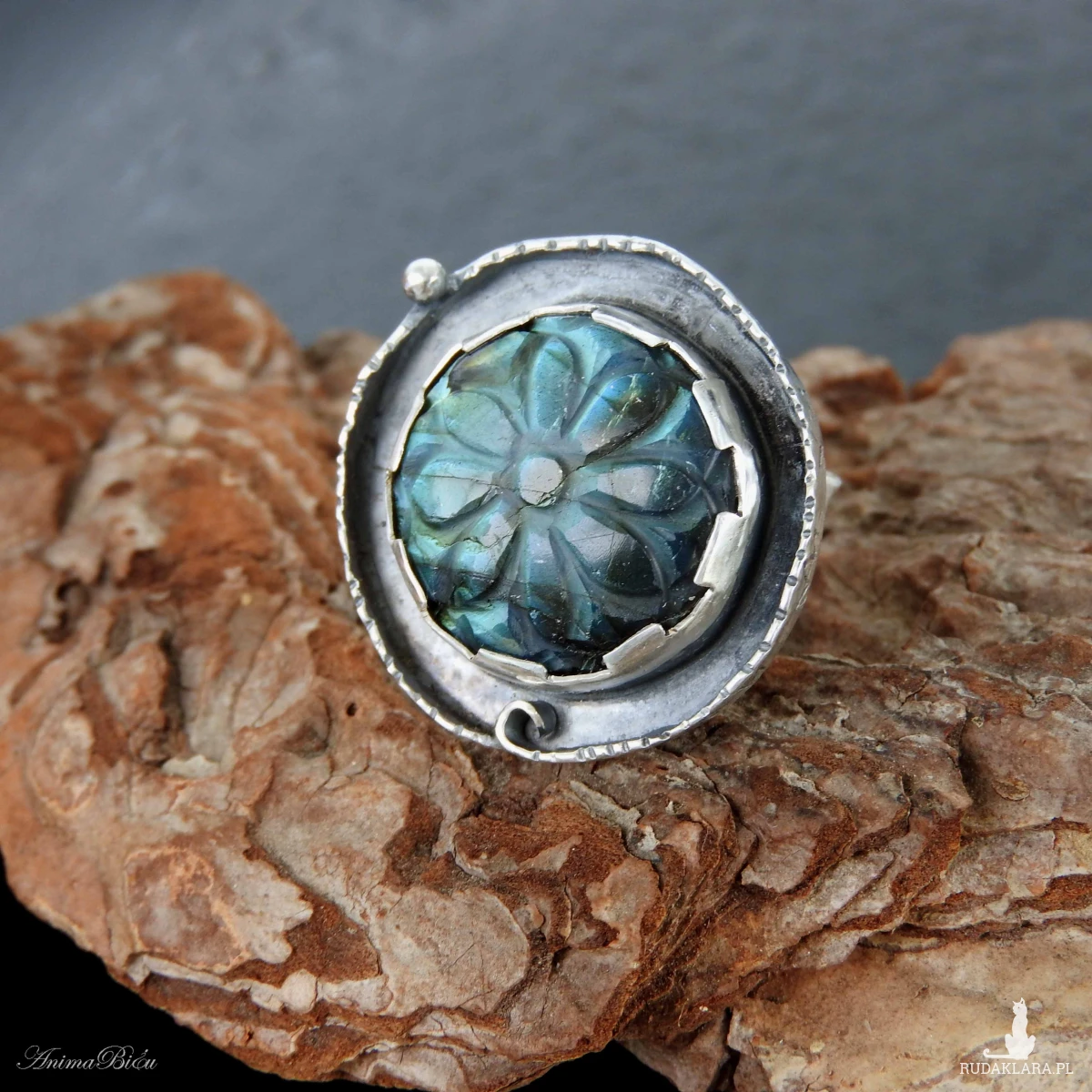 Pierścionek srebrny z labradorytem. Piękny, madagaskarski