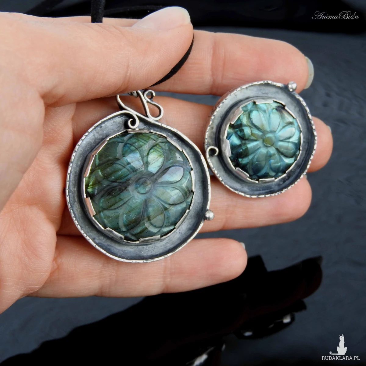 labradoryt rzeźbiony na kształt mandali, iryzujący w kolorze zieleni i błękitu