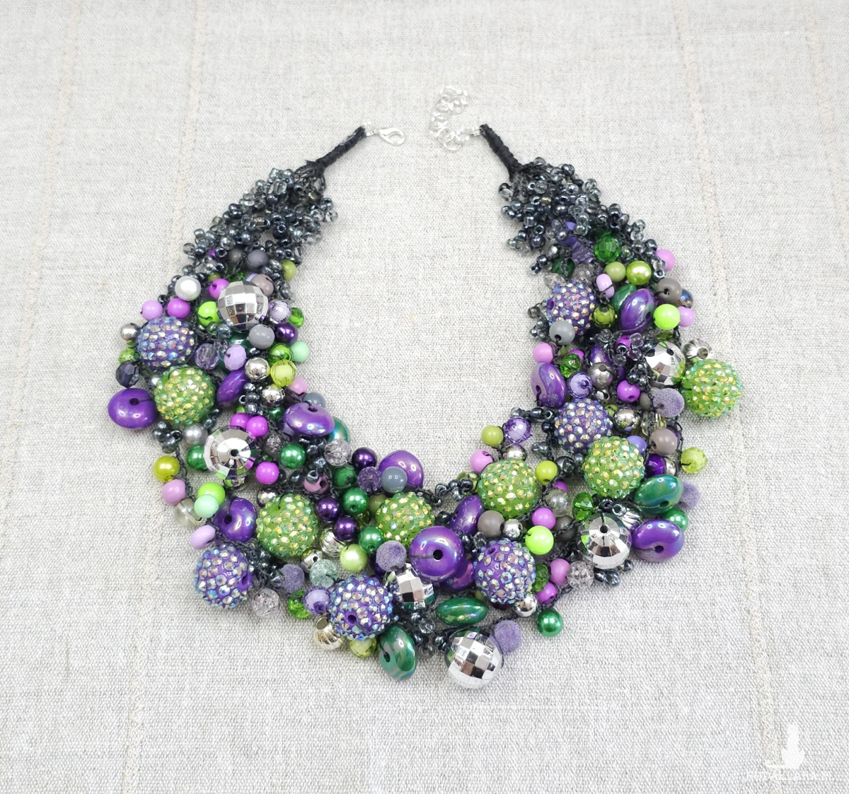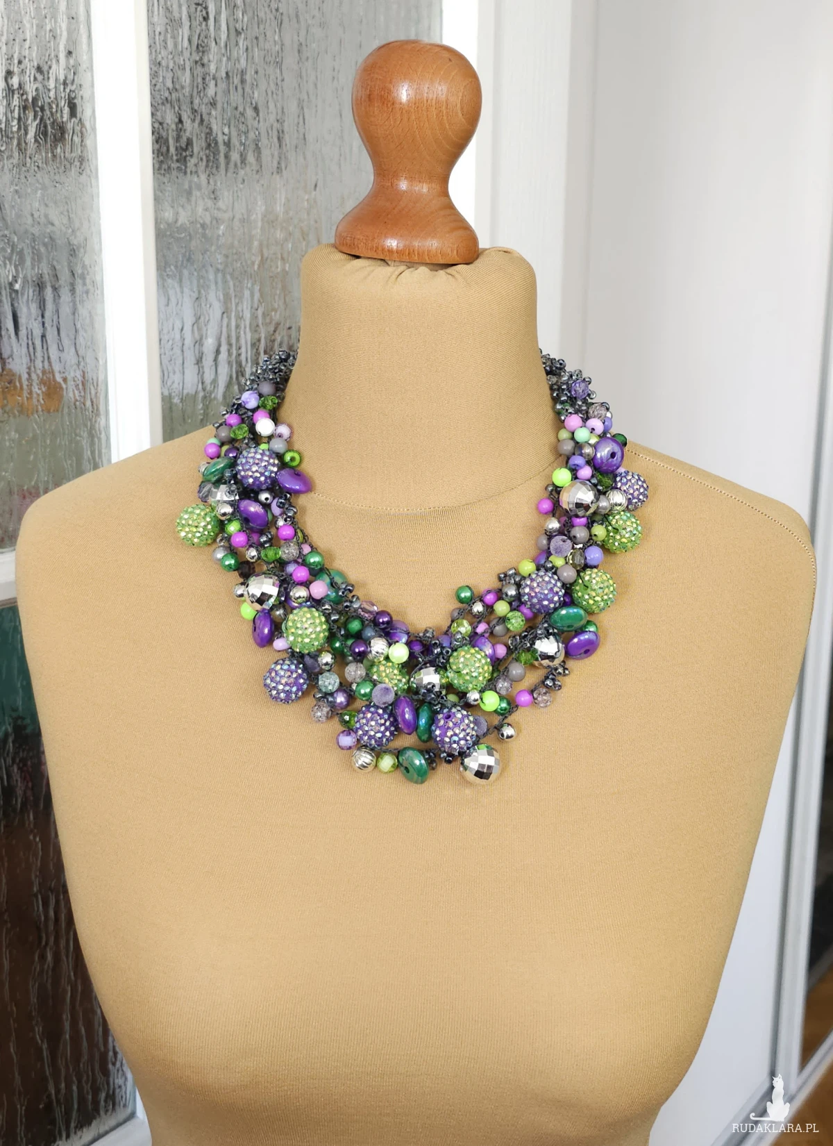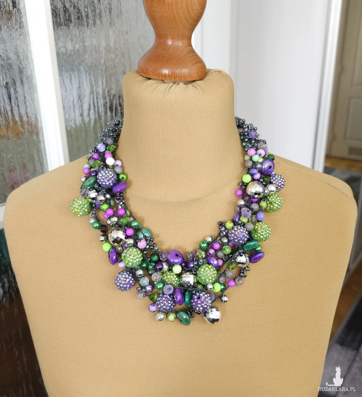 Odkryj nasz wyjątkowy naszyjnik w odcieniach intensywnego fioletu i soczystej zieleni, wzbogacony o błyszczące, srebrne i szare akcenty.