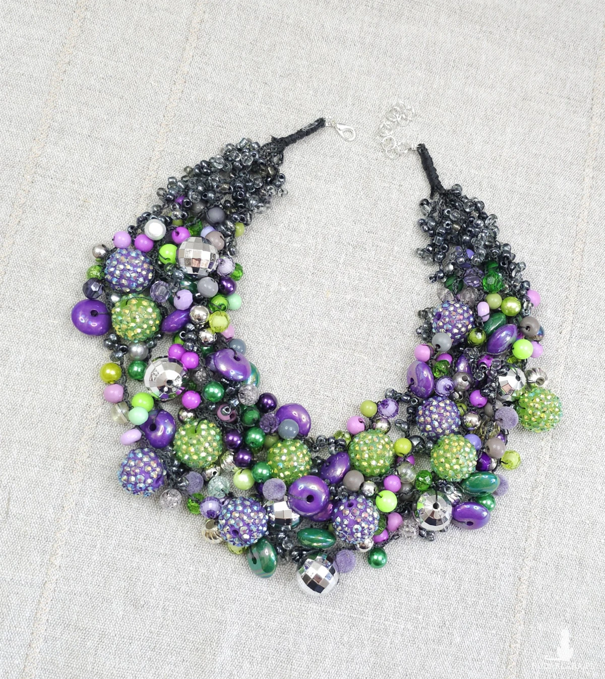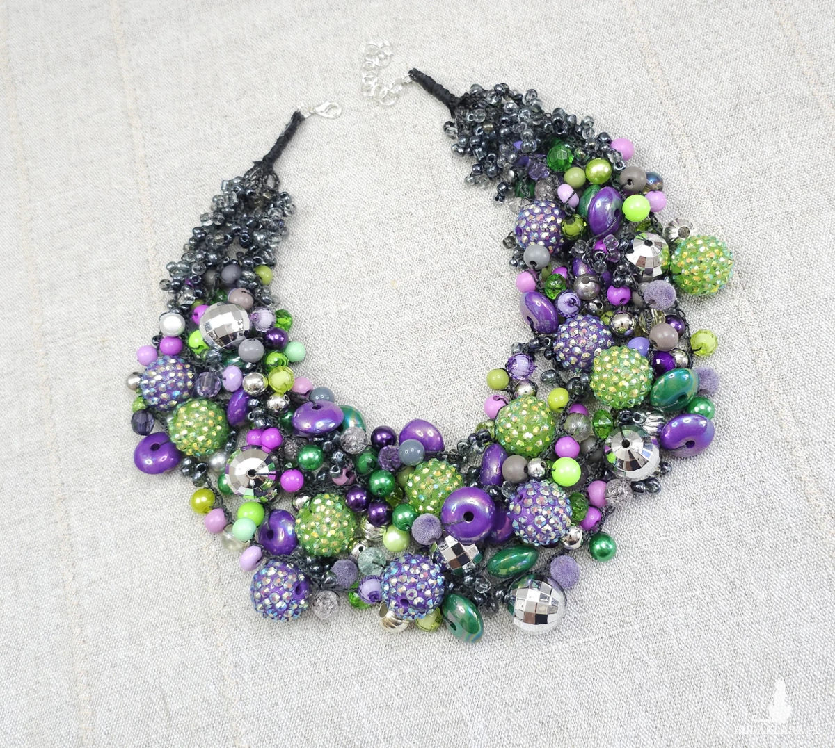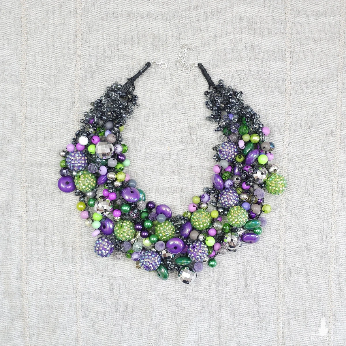 Odkryj nasz wyjątkowy naszyjnik w odcieniach intensywnego fioletu i soczystej zieleni, wzbogacony o błyszczące, srebrne i szare akcenty.