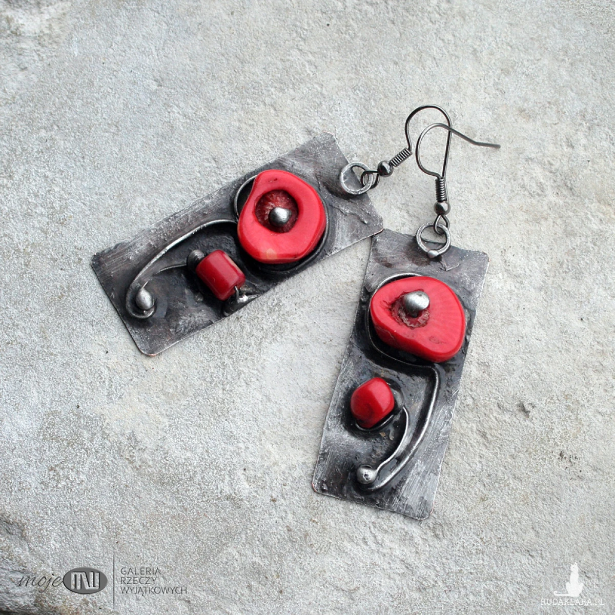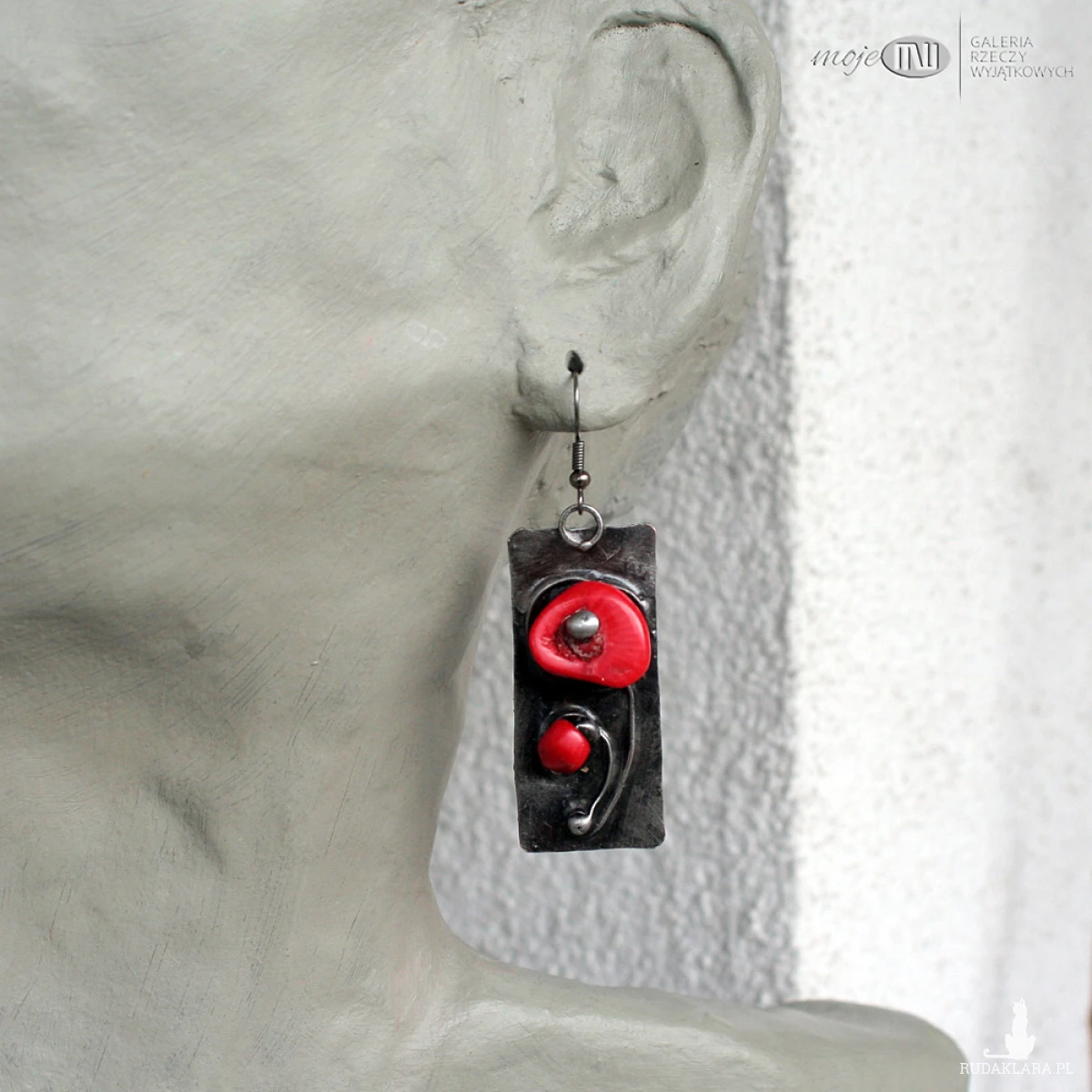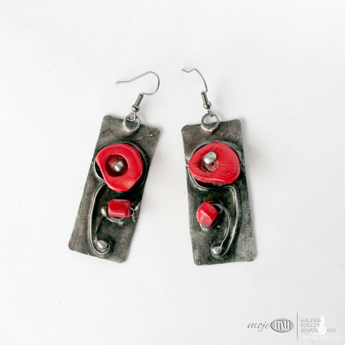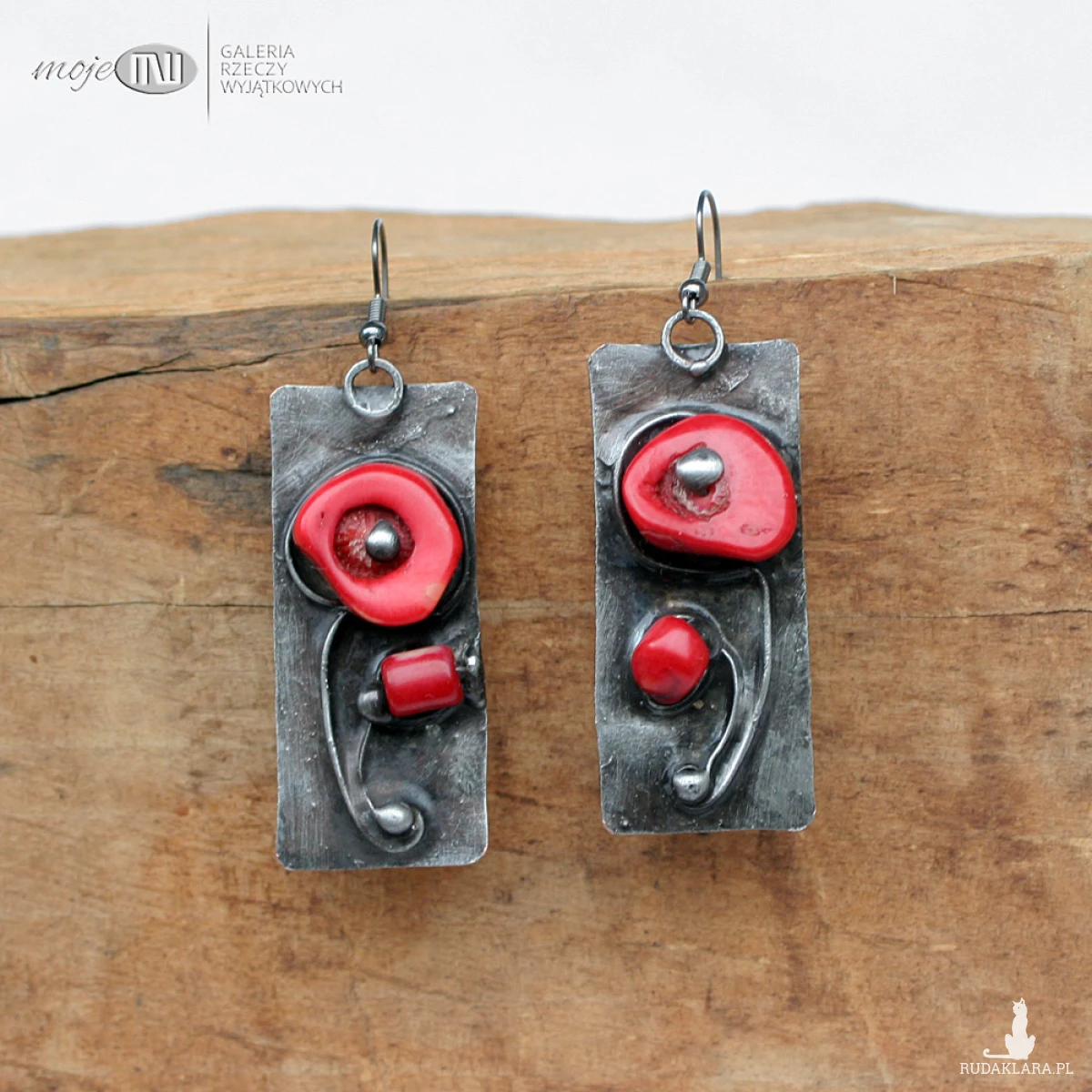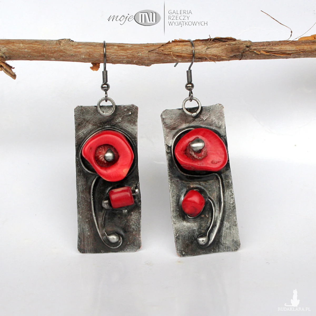 Kolczyki z czerwonym koralem. Metalowe prostokąty z akcentem mocnej czerwieni - stylizowane kwiaty maków. Rustykalne wiszące kolczyki. Zawieszone są na metalowych biglach w grafitowym kolorze.
