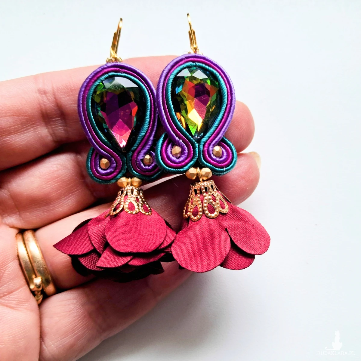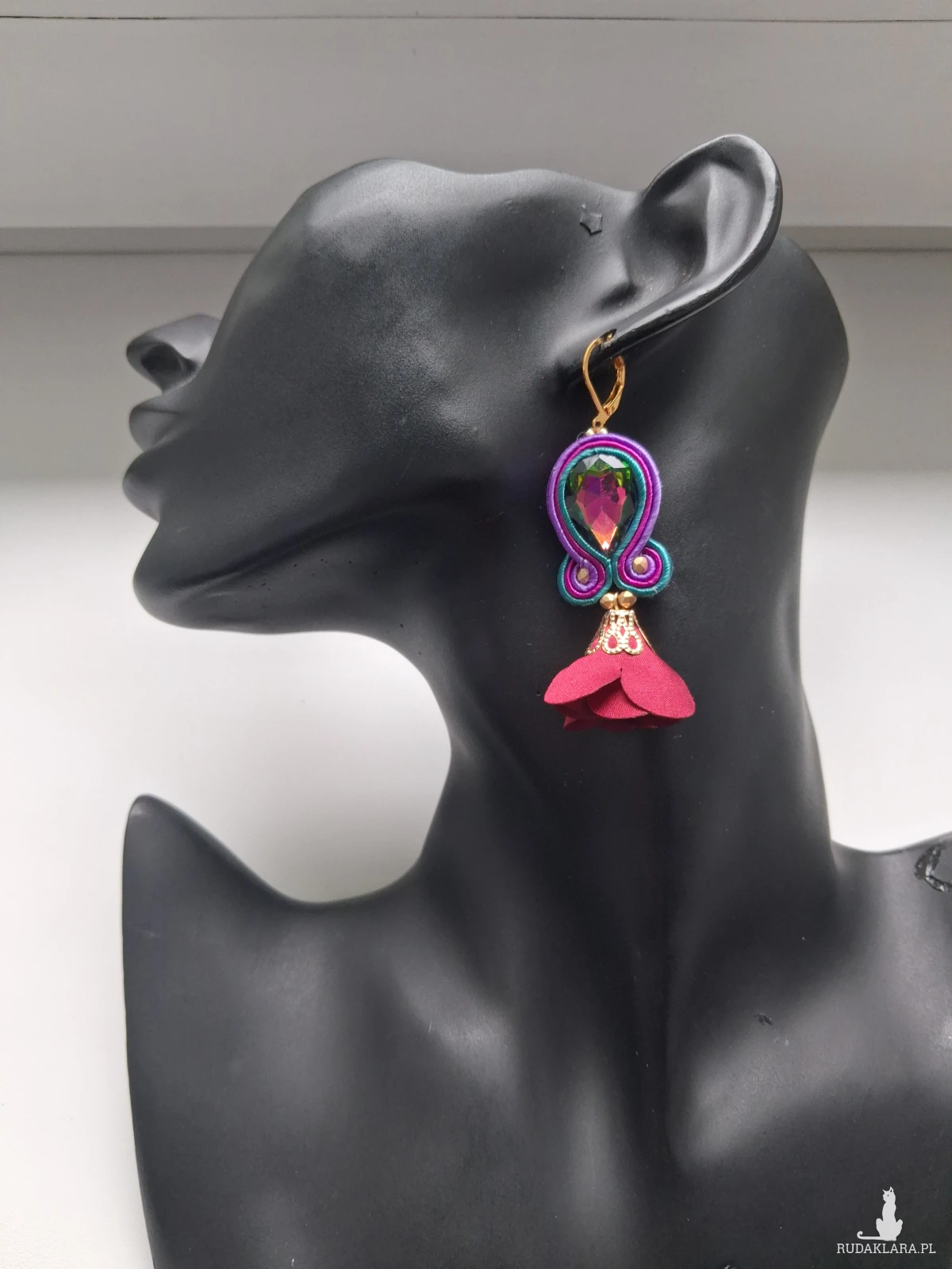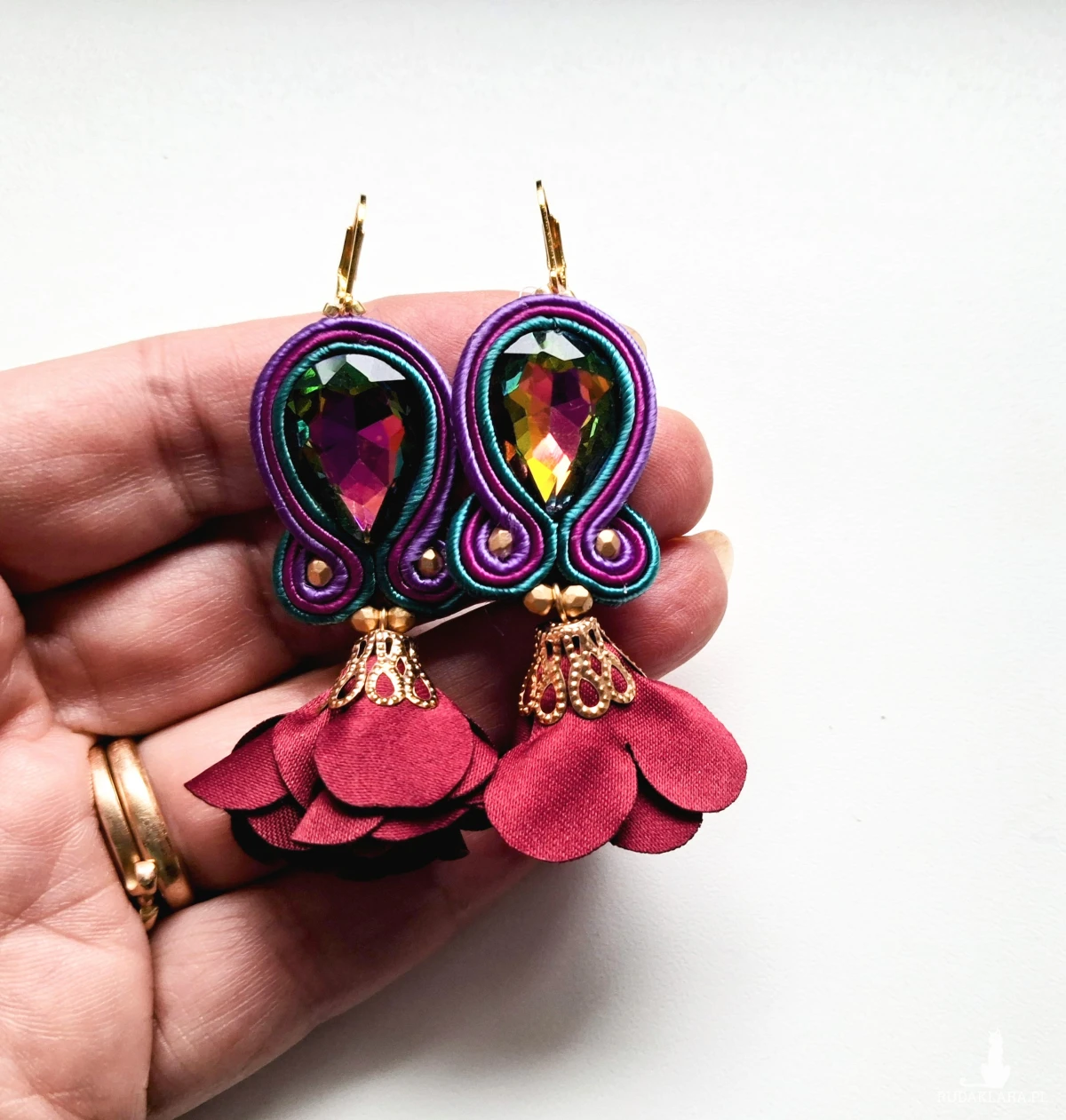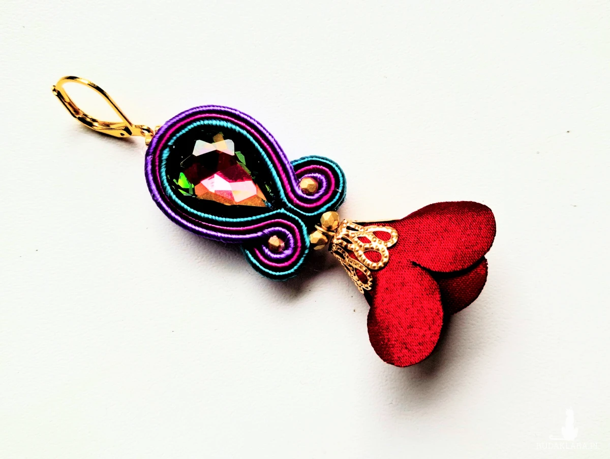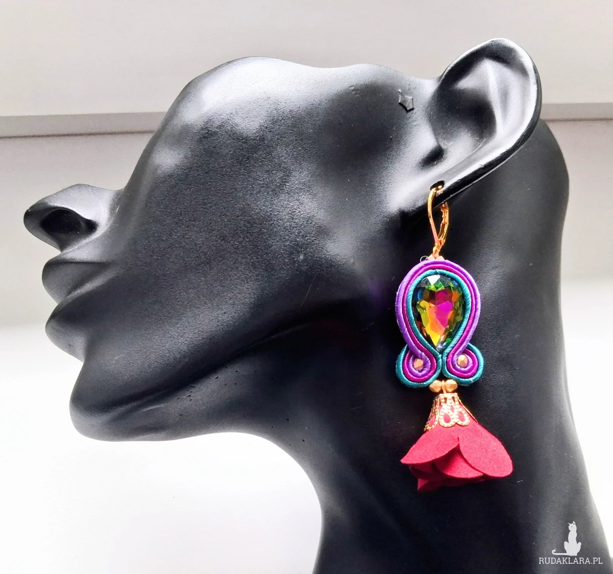 Materiał: sutasz, kwiat satynowy, koraliki Fire Polish, kryształ szlifowany.