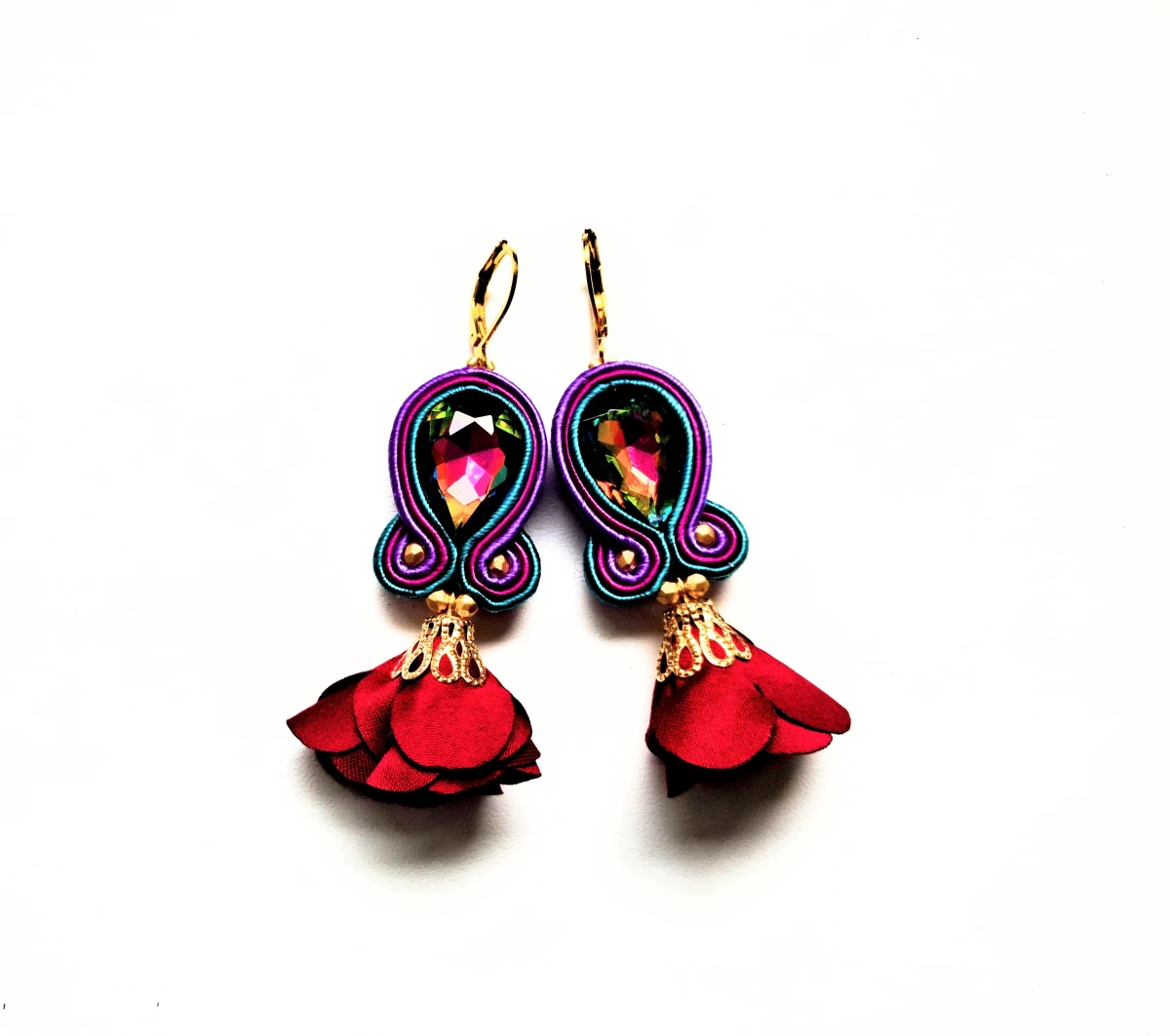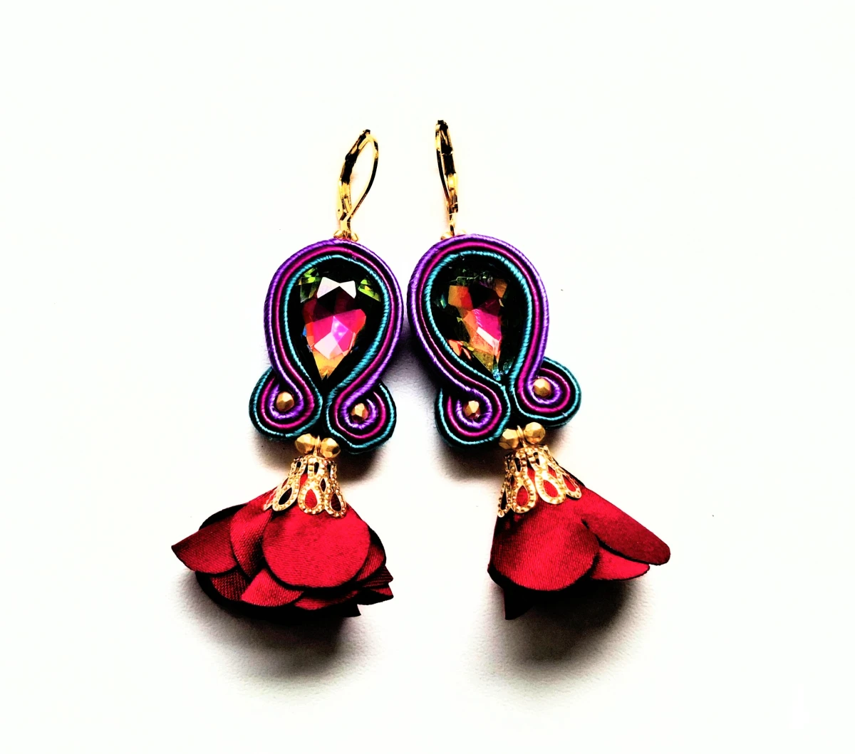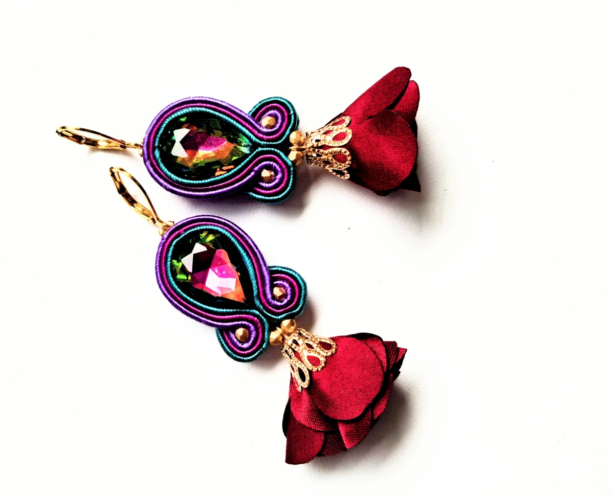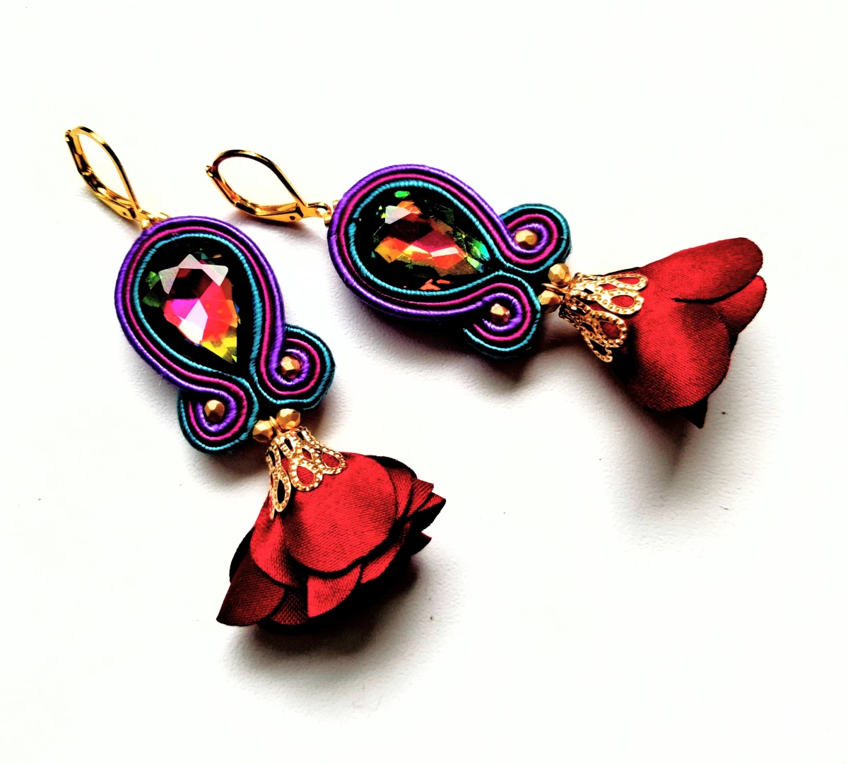 Materiał: sutasz, kwiat satynowy, koraliki Fire Polish, kryształ szlifowany.
