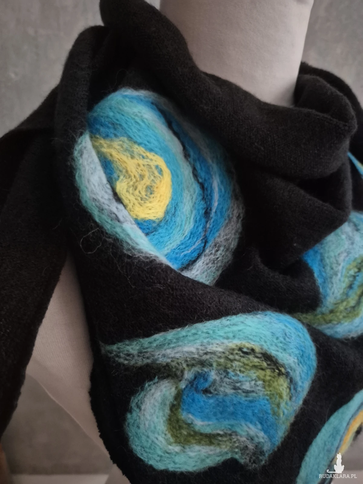 Czarna chusta handmade wełniana, elementy filcowane to wełna merynosów, produkt wysokiej jakości, chusta miła i ciepła, doskonała na chłodne dni, idealna na prezent, wspaniała na codzienne noszenie, zwraca uwagę swą oryginalnością, miękko układa się wokół szyi, absolutny bestseller polecam czas oczekiwania tydzien box a1