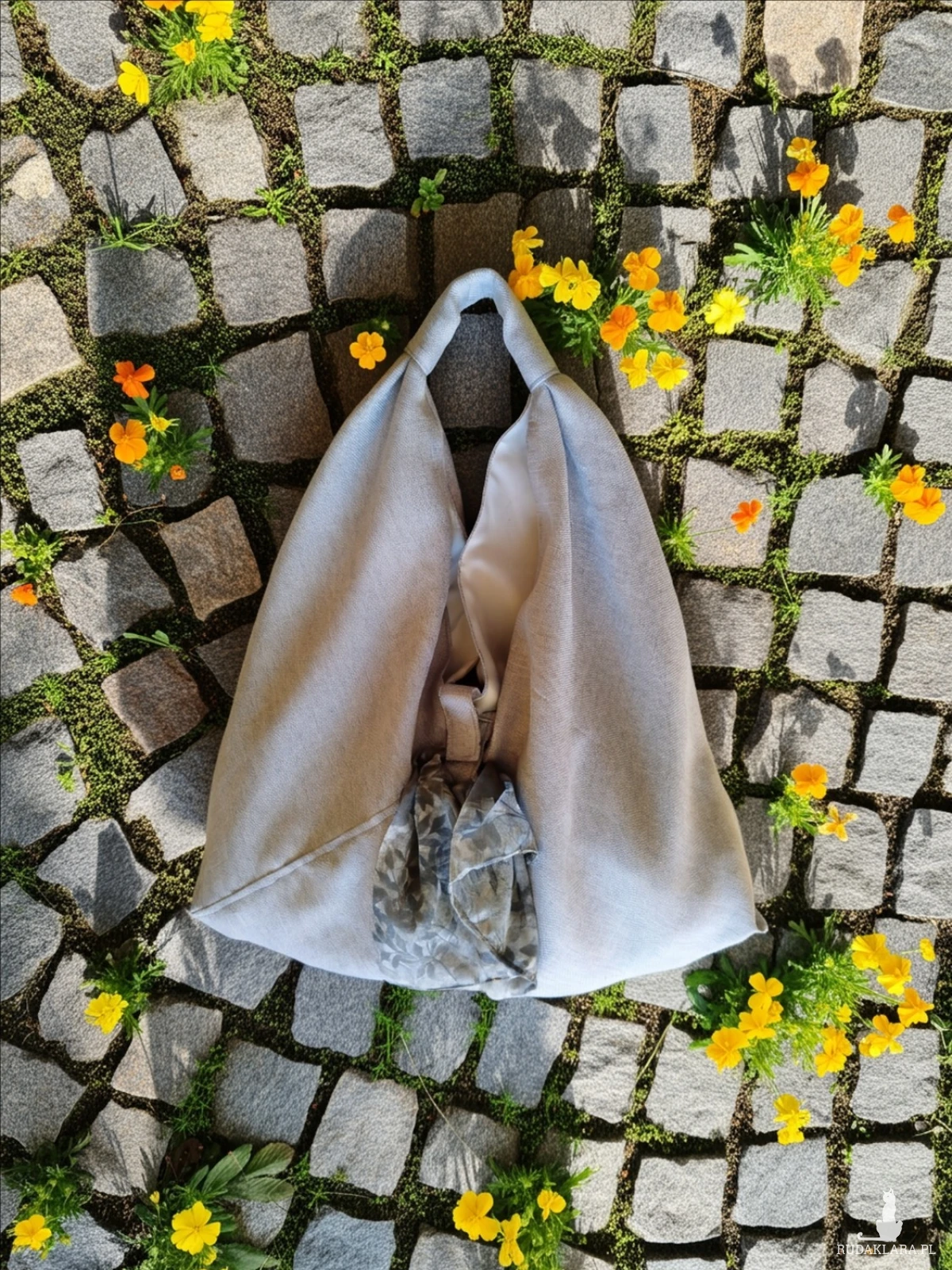 Torba Azuma na ramię wykonana japońską techniką Origami z tkaniny poliestrowej imitującej grube płótno: ręcznie robiona torba, może być zastosowana jako damska torebka albo torba na zakupy. Można nosić na ramieniu bądź w ręku. Na ramieniu dobrze się układa pod pachą. W środku kremowa podszewka, oraz kieszeń przedzielona na 2 części, w jednej mieści się smartfon. Torba zapinana na napkę, do pateczki przymocowana ozdoba z żorżety poliestrowej. Torba jest bardzo duża, na jednym zdjęciu dla zobrazowania wielkości na torbie leży teczka A4. Bardzo fajna i wygodna, tkanina jest w kolorze srebrnym z lekkim połyskiem. Wymiary: Szerokość ok. 62 cm, dł. w najwęższym miejscu 35 cm, głębokość 11 cm.