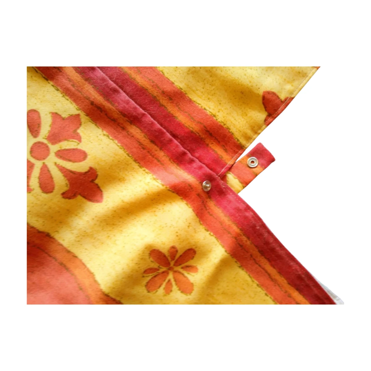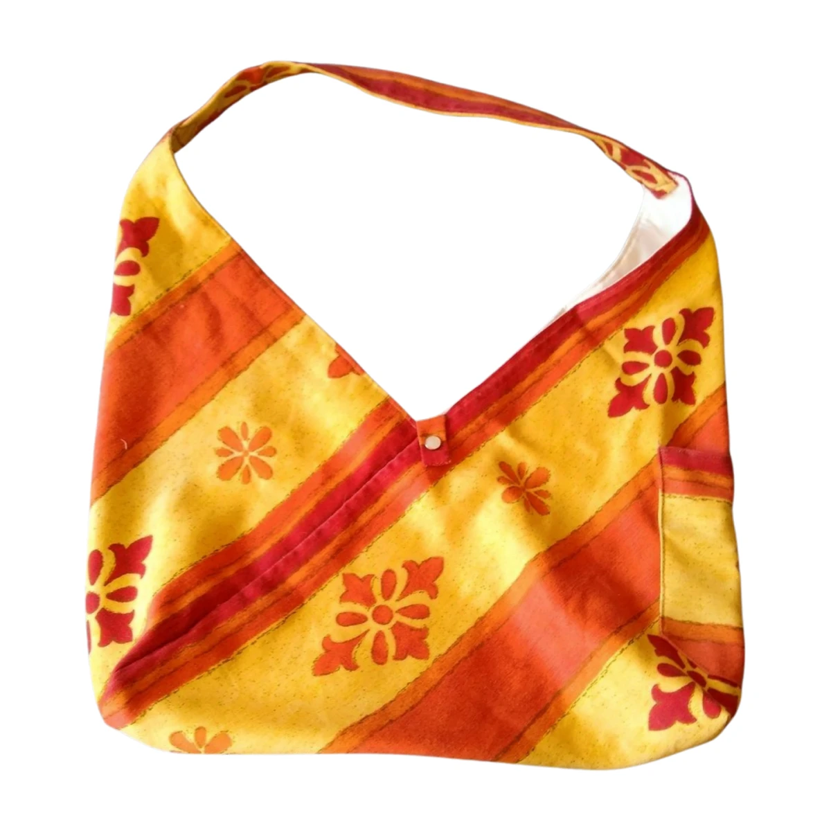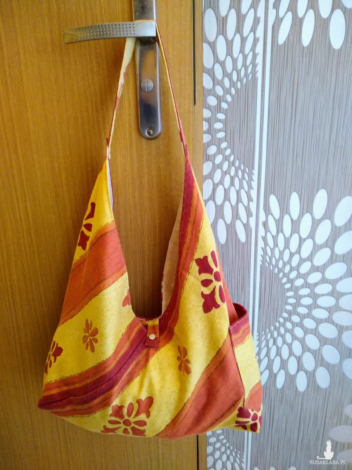 Torba Azuma na ramię wykonana japońską techniką Origami z materiału w motywy orientalne: ręcznie robiona torba, może być zastosowana jako damska torebka albo torba na zakupy. Jest na dłuższym pasku, aby można ją było wygodnie nosić na ramieniu jak i przewieszoną przez drugie ramię jak listonoszkę. W środku kremowa podszewka, z zewnątrz z boku kieszonka np. na smartfona. Zapinana na napkę, w środku przedłużony pasek z kółeczkiem do przypięcia np. kluczy. Bardzo fajna i wygodna, tkanina mieszanka bawełny z poliestrem. Wymiary: Szerokość ok. 47 cm, długość w najwęższym miejscu 26 cm, głębokość 8 cm.