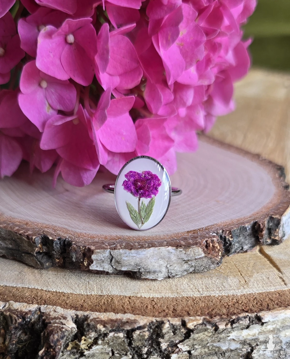 Oferuję Państwu unikalną biżuterię. Pierścionek jest wykonany z suszonych kwiatów i żywicy epoksydowej. Biżuteria jest wspaniałym i oryginalnym prezentem na lata.