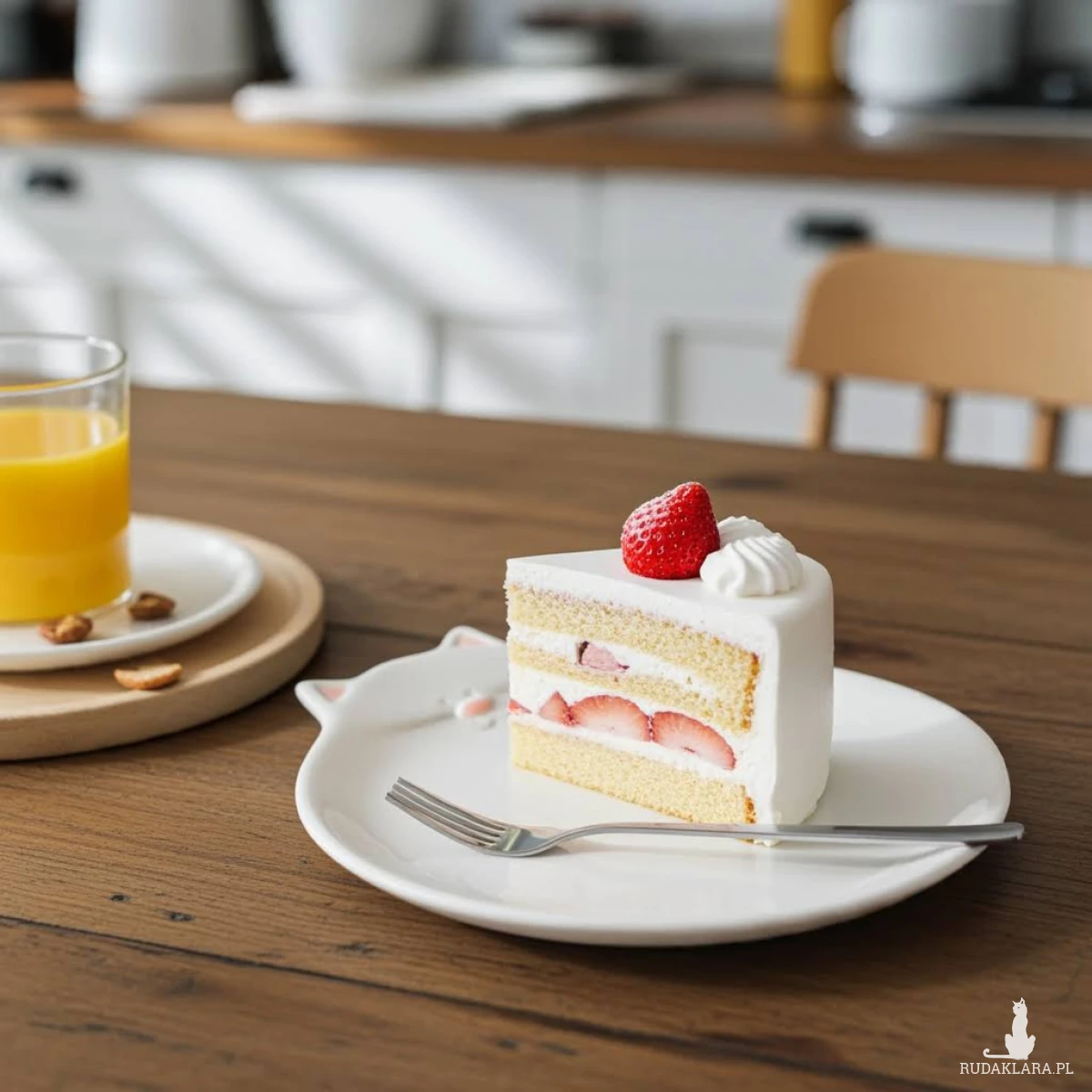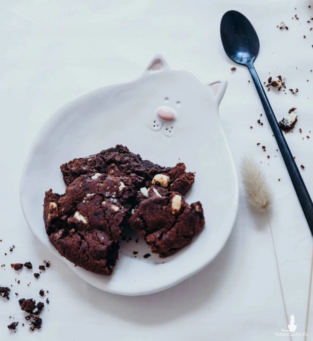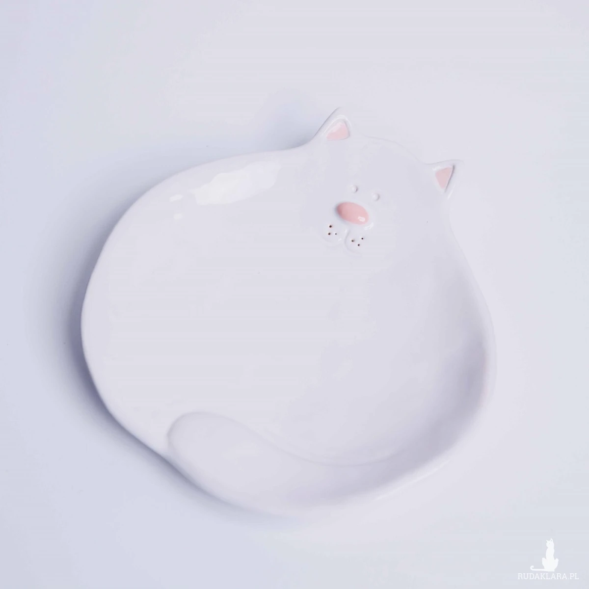 Ceramiczny biały talerzyk deserowy w kształcie kota, z kocimi uszkami, zawiniętym ogonem i uśmiechem. Talerzyk może służyć do podawania drobnych potraw, słodyczy, przechowywania niewielkich rzeczy, jako mydelniczka lub podstawka na świece.