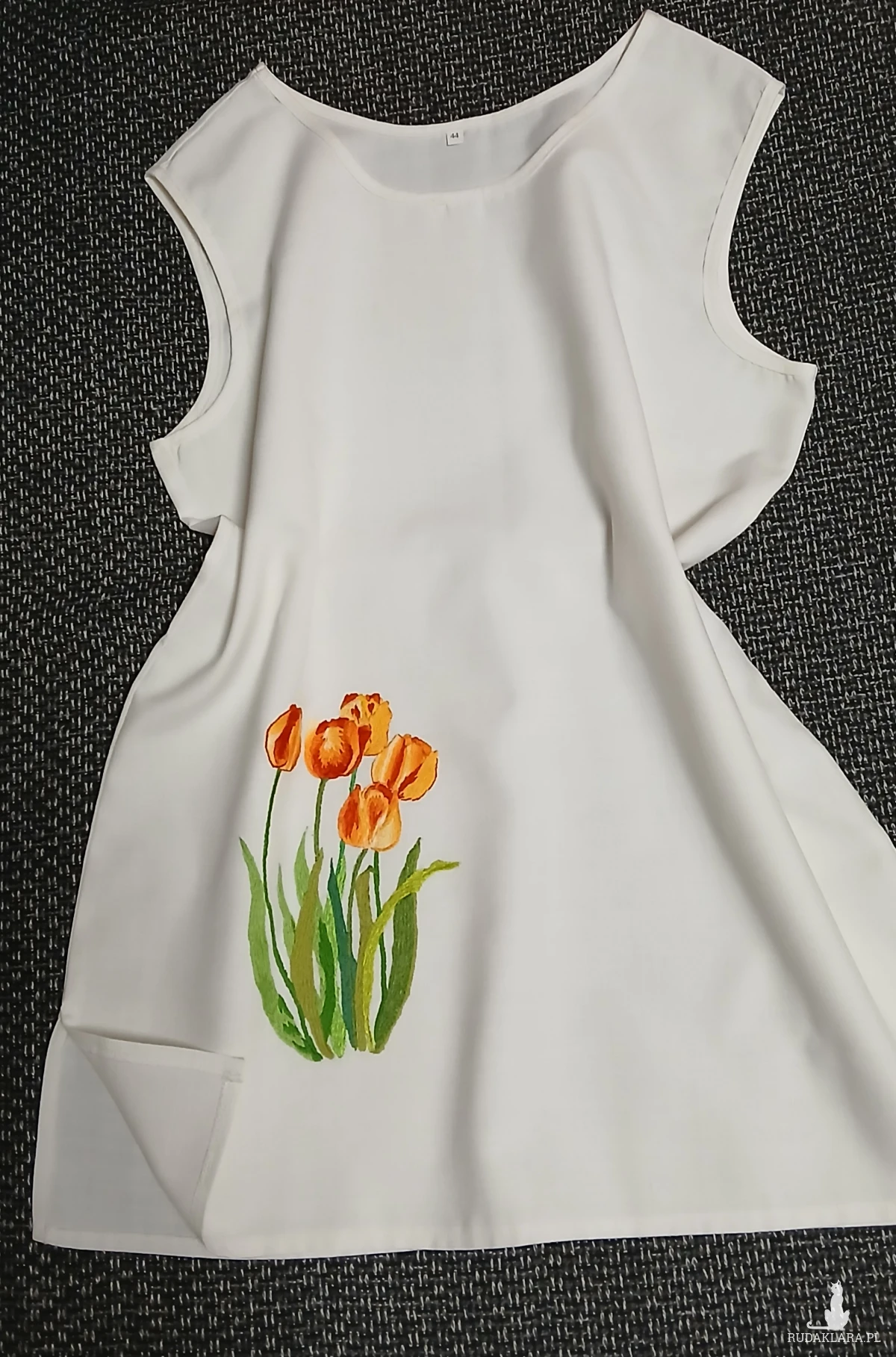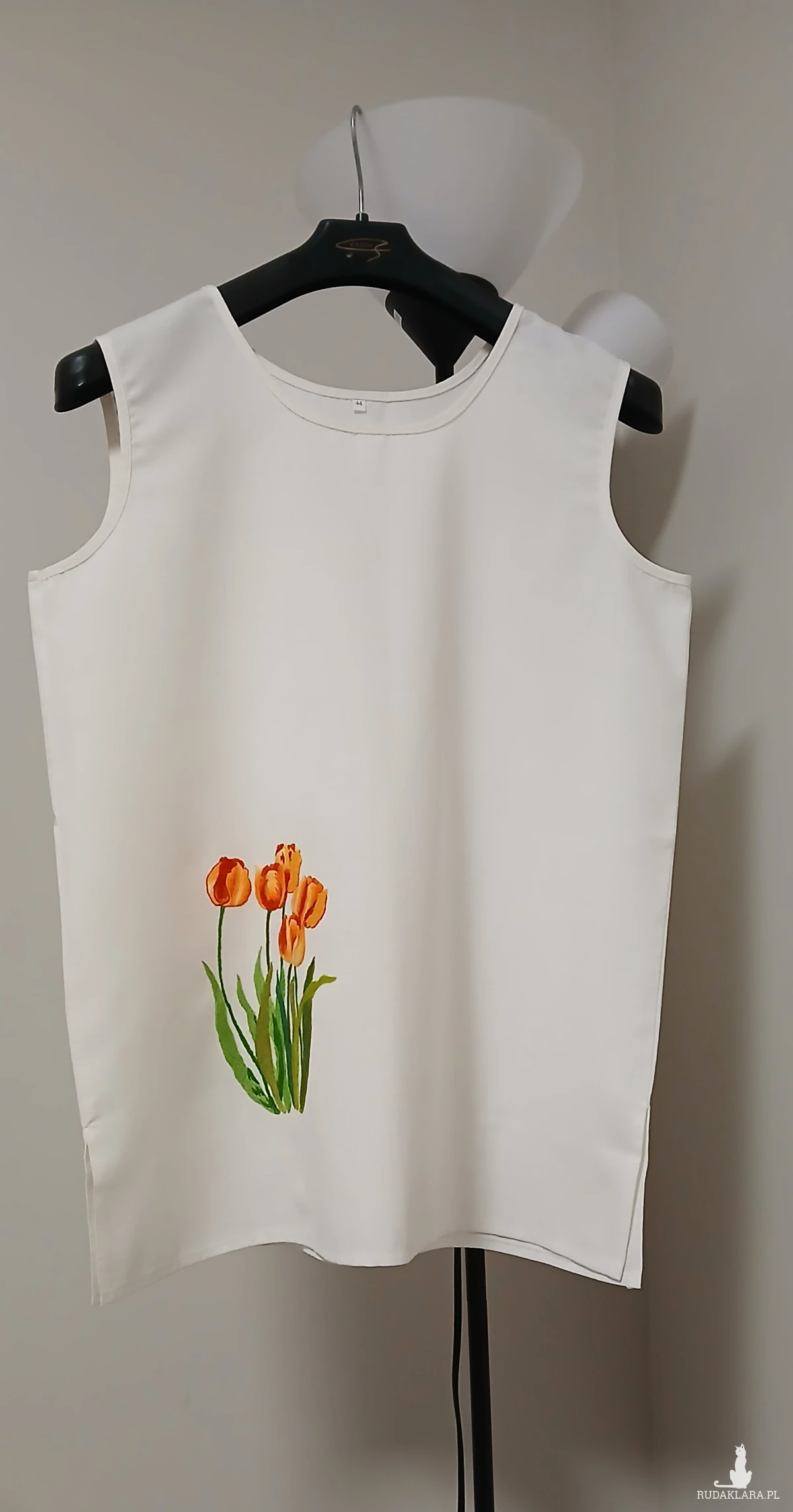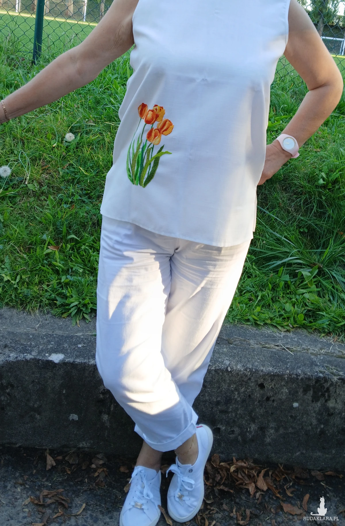 Ręcznie haftowany bukiet tulipanów na białej bluzeczce. Prawdziwy rarytas modowy dla każdej pani, która chce się wyróżniać. Faktura materiału jest miękka i w dotyku przypomina bawełnę, a fakt że jest to viscoza i poliester dowodzi że bluzka nie będzie się nadmiernie gniotła.