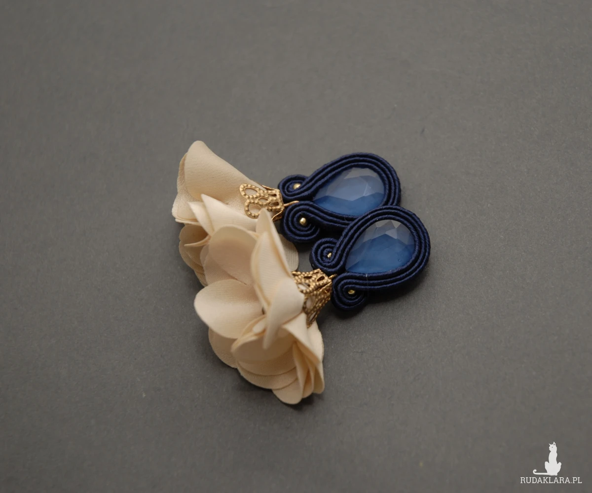 granatowo-kremowe kolczyki lub klipsy sutasz z kwiatkami
