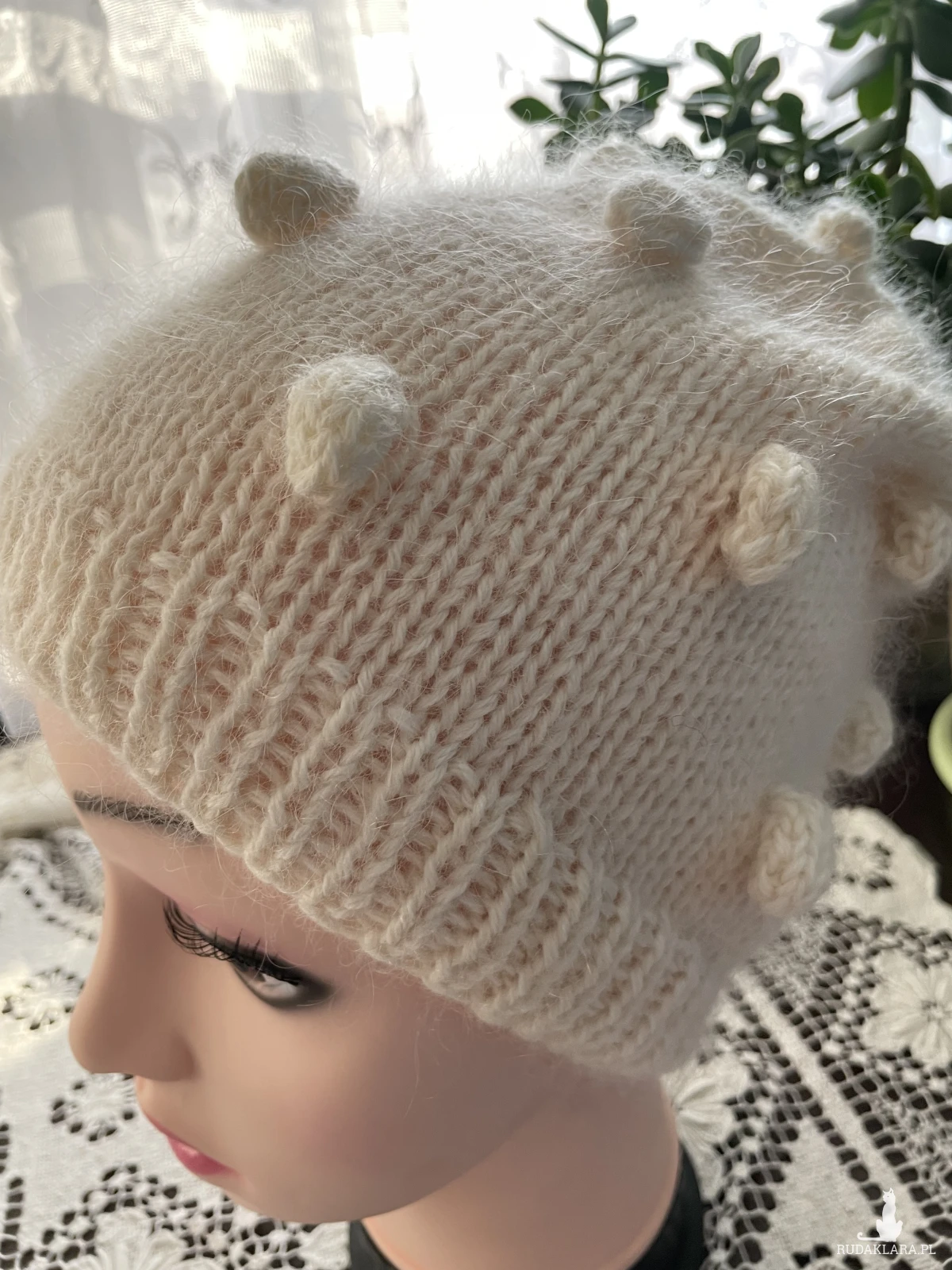 Czapka wykonana ręcznie na drutach z mieszanki wełny, alpaki i jedwabiu. Obwód głowy ok 54 cm.