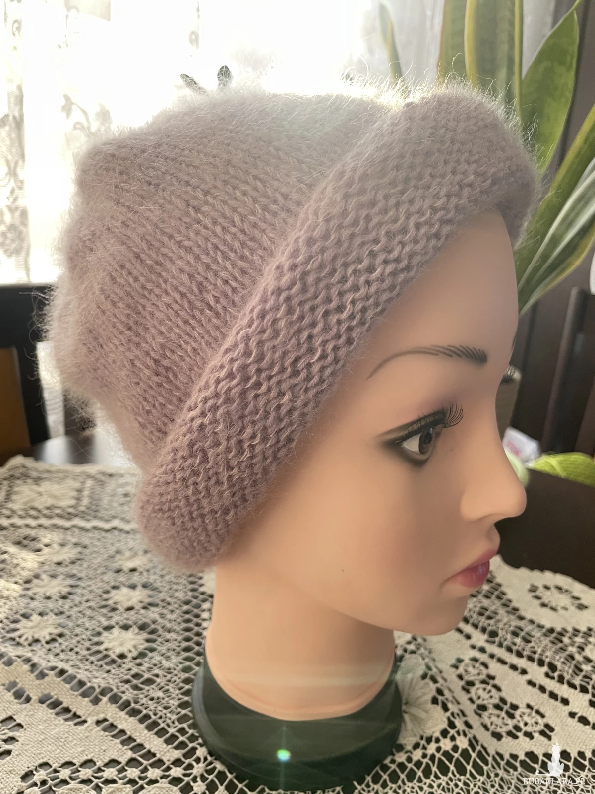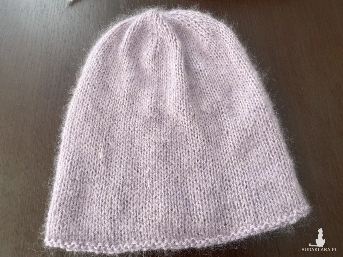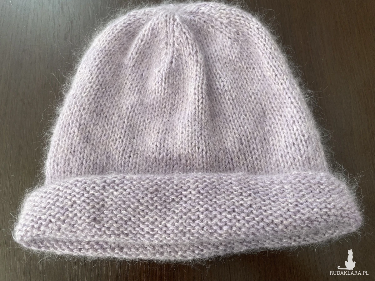 Czapka wykonana ręcznie na drutach z mieszanki wełny merino, moheru i jedwabiu. Obwód głowy ok 56-58 cm.