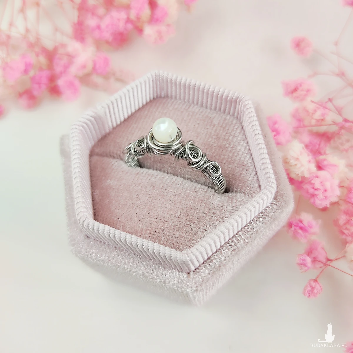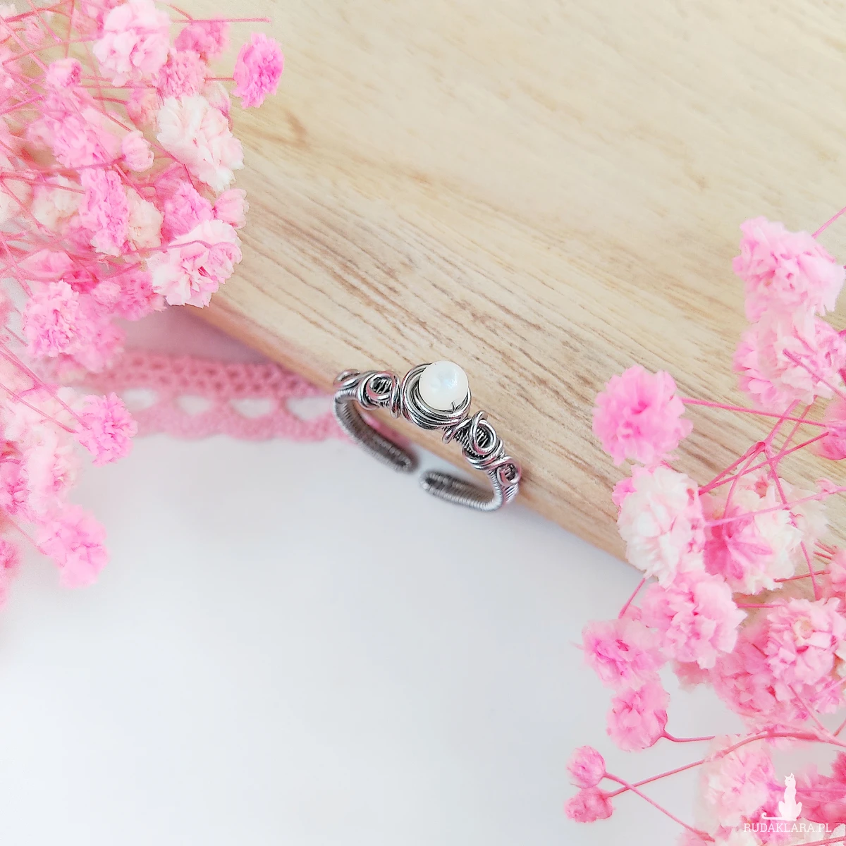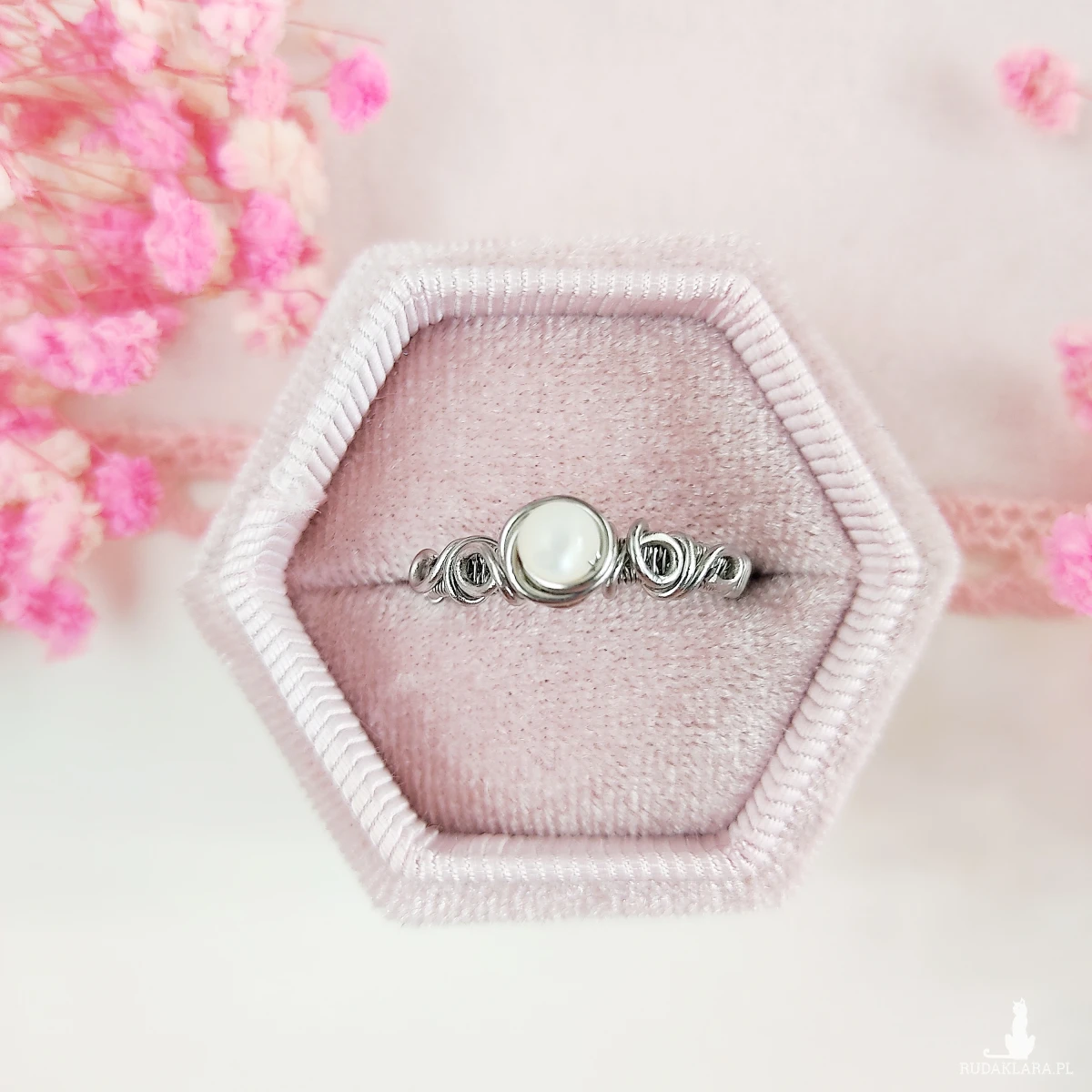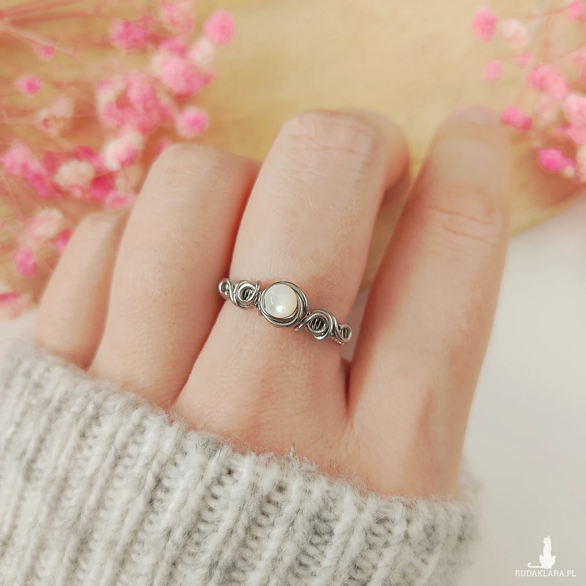 Pierścionek Masa Perłowa ręcznie robiony. Wykonany techniką wire wrapping z drutów ze stali chirurgicznej.