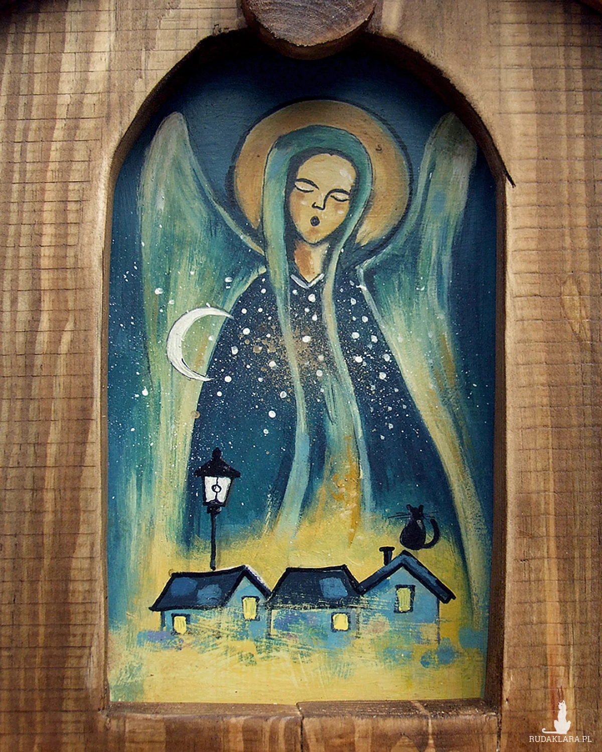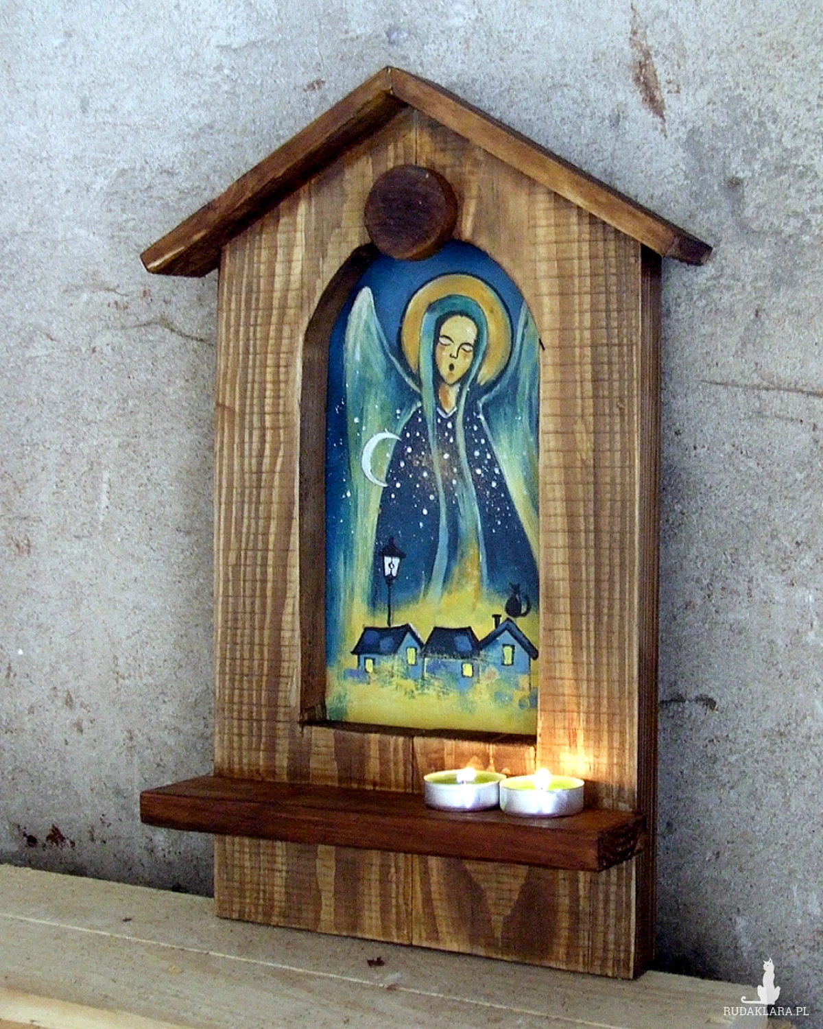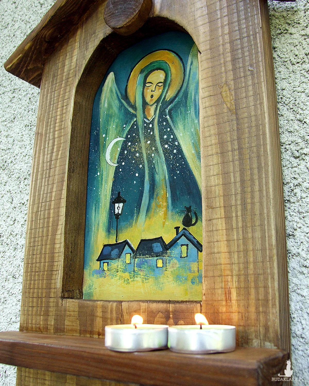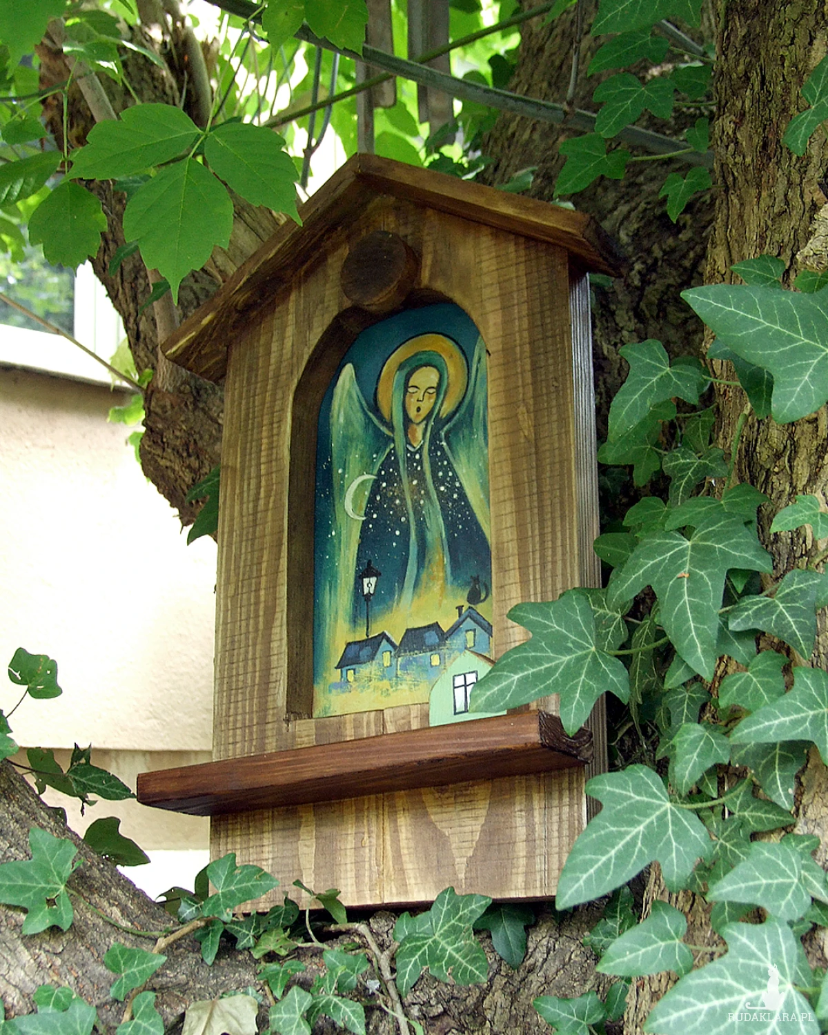 Kapliczka została docięta ze starej sosnowej deski, która ma ślady wcześniejszego użytkowania (otworki po gwoździach). W desce jest wycięte jakby okienko, a w nim zamontowany jest ręcznie malowany obrazek z aniołem. Obrazek jest namalowany na cienkiej sklejce, farbami akrylowymi - cała kapliczka jest zabezpieczona matowym lakierem akrylowym, nietoksycznym i wodoodpornym.