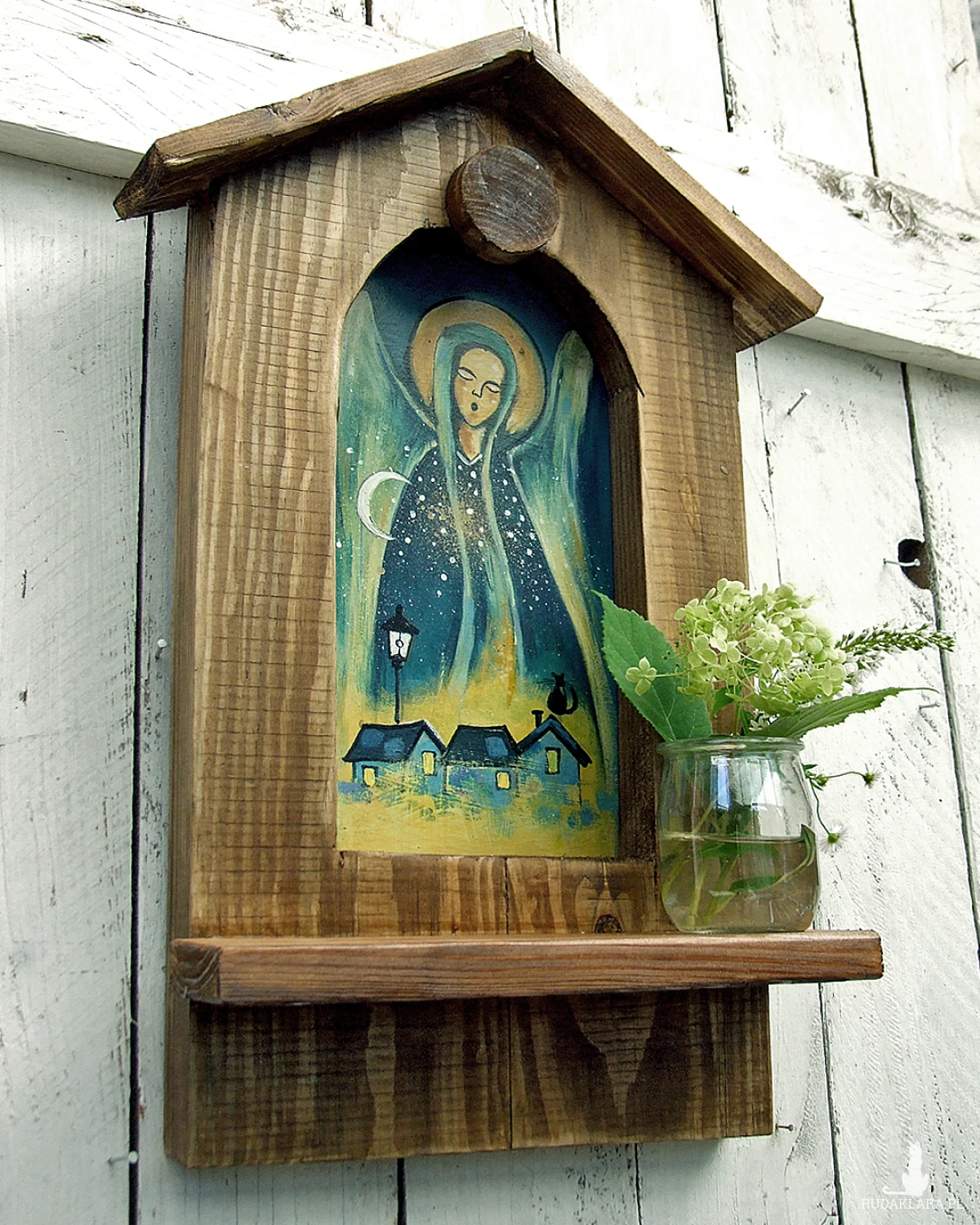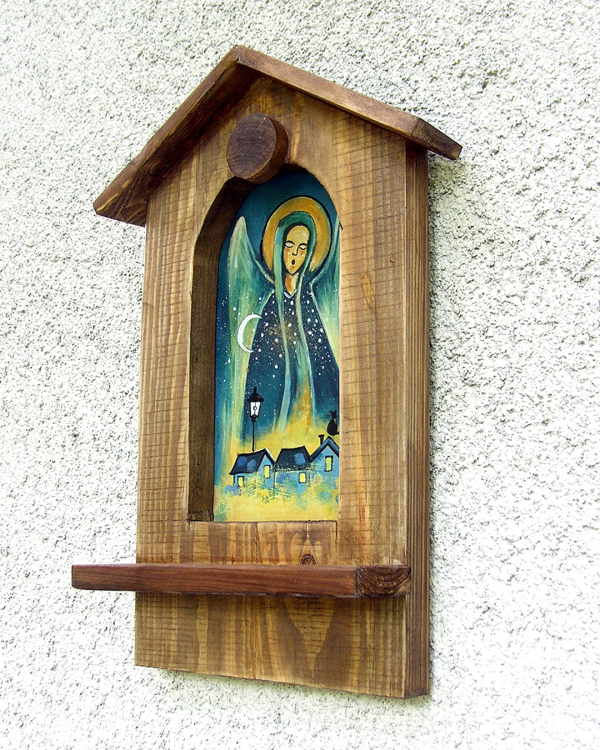 Drewniana Kapliczka - klimatyczna i pełna uroku dekoracja wnętrza. Może być także zawieszona w ogrodzie - w miejscu osłoniętym od deszczu, albo na werandzie. Taka kapliczka to także miły, oryginalny prezent do nowego domu.