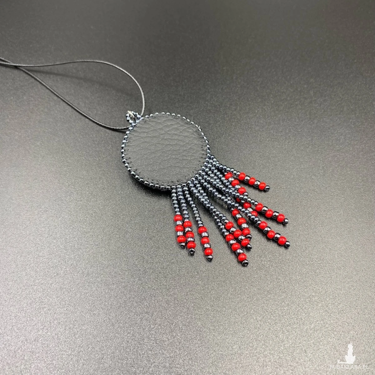 Kolory wisiorka: hematytowy, czerwony. Zawieszony został na sznurku powlekanym czarnym. Tył podszyty czarną eko skórką. Elementy metalowe ze stali chirurgicznej w kolorze srebrnym.