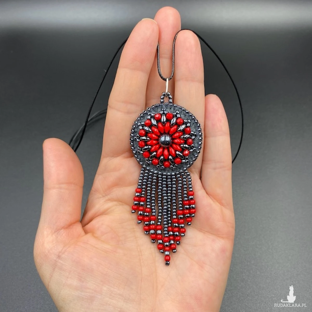 Mini wisiorek został wykonany techniką haftu koralikowego w 100% wyszyty ręcznie i zakończony ozdobnymi frędzelkami.