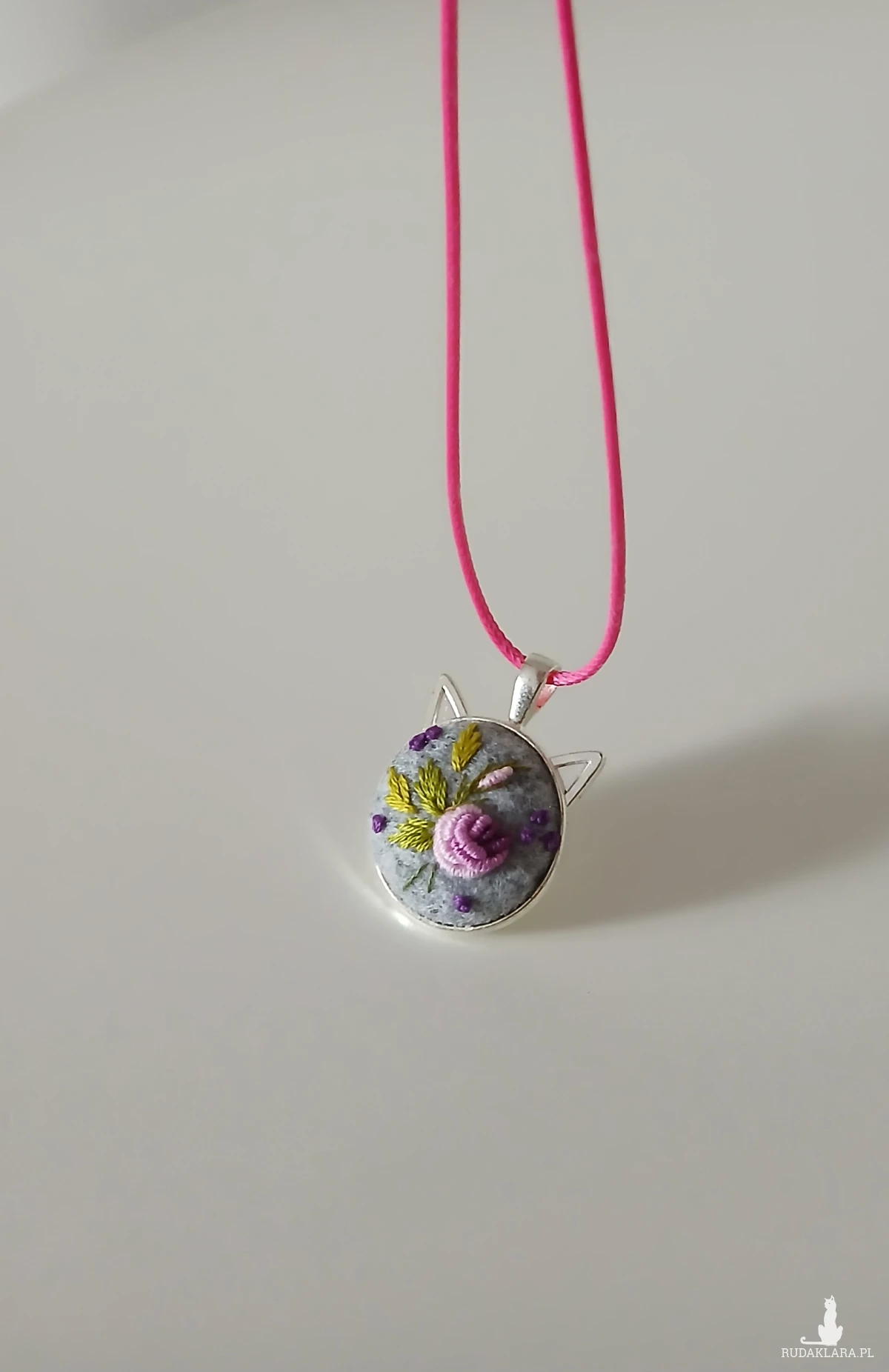 Perfekcyjnie dopracowany haft na filcu wykonałam polską bawełnianą muliną za pomocą igły. Jest on zabezpieczony impregnatem do tkanin ale po dłuższym użytkowaniu można go odświeżyć przy pomocy delikatnego mydła i letniej wody.