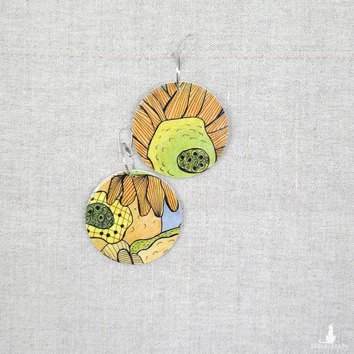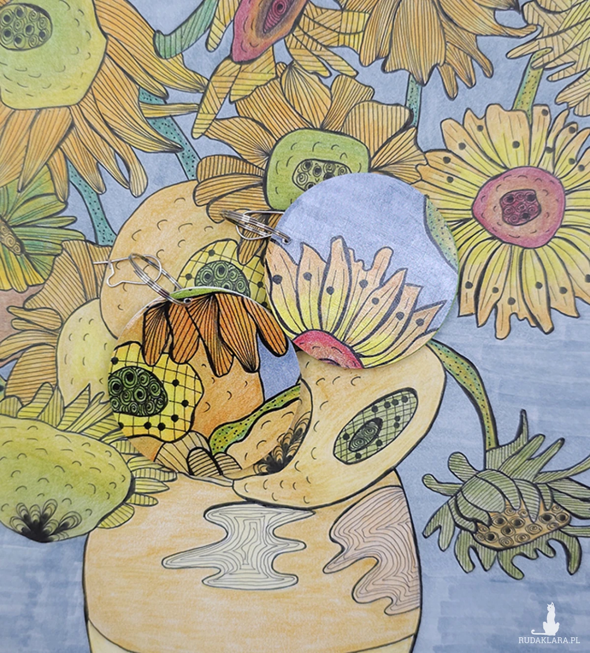 Te kolczyki to niebanalne połączenie inspiracji – słoneczniki, które wyglądają jakby wyszły prosto spod pędzla Van Gogha, a do tego są pełne relaksujących wzorów w stylu zentangle.