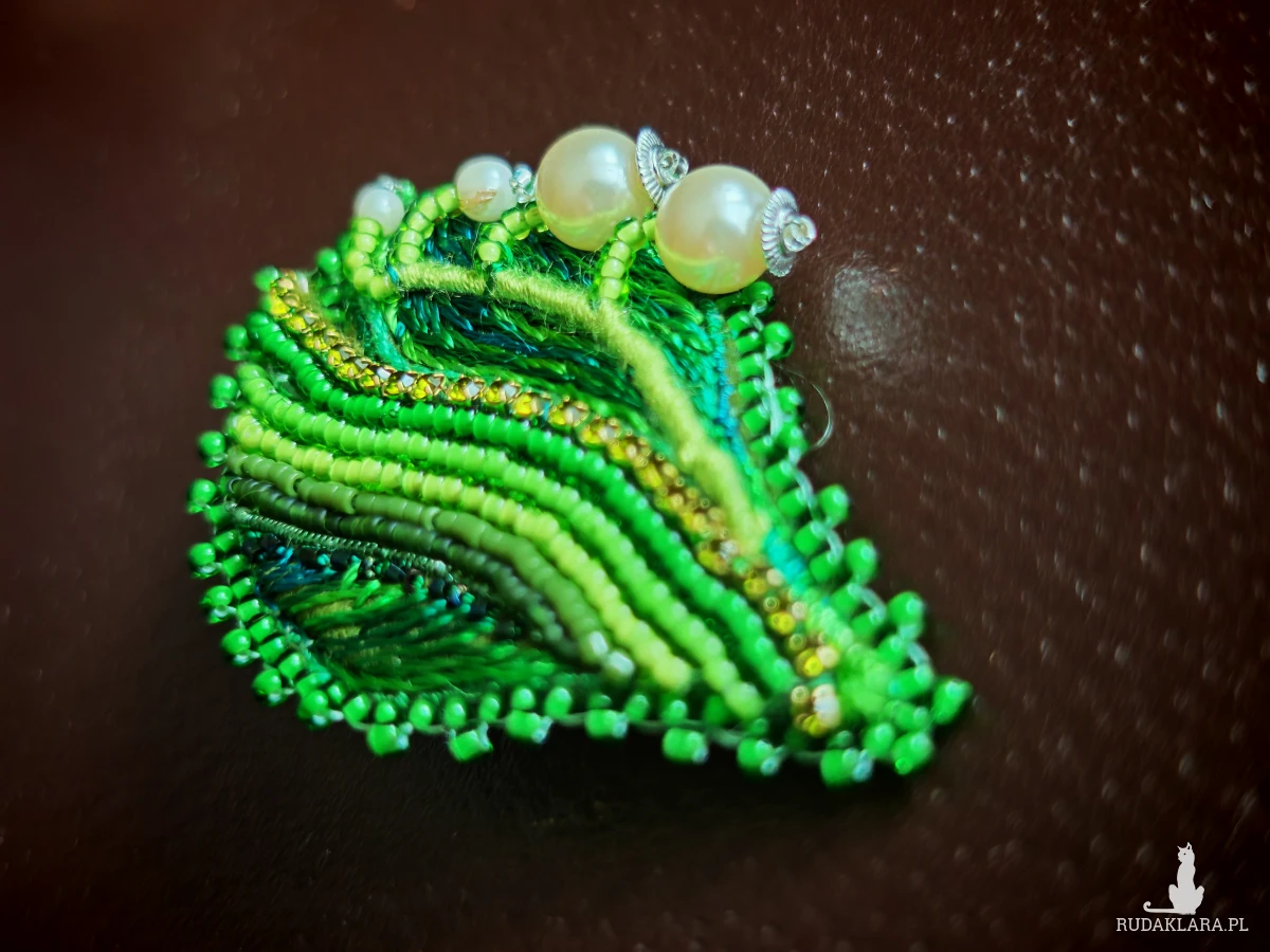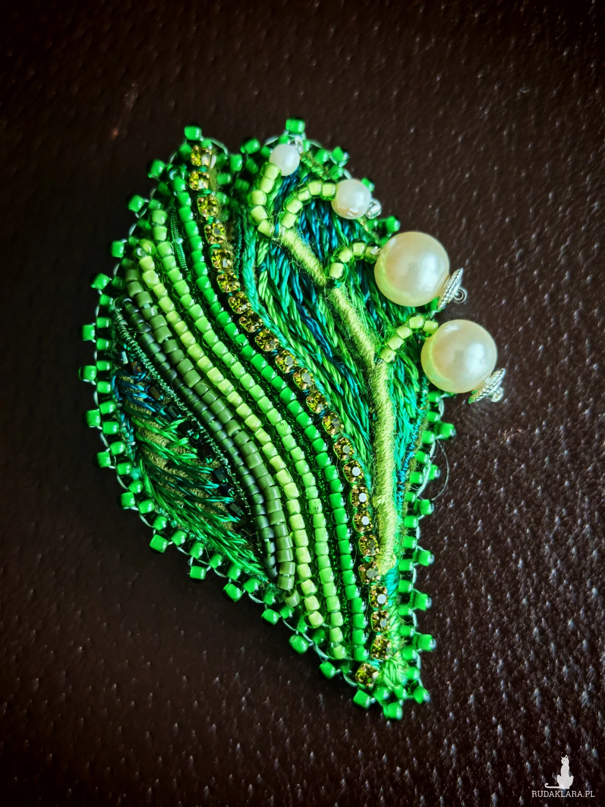 Haftowana broszka stylizowana na kwiat konwalii majowej, ozdobiona szklanymi koralikami, kryształkami i perłkami.