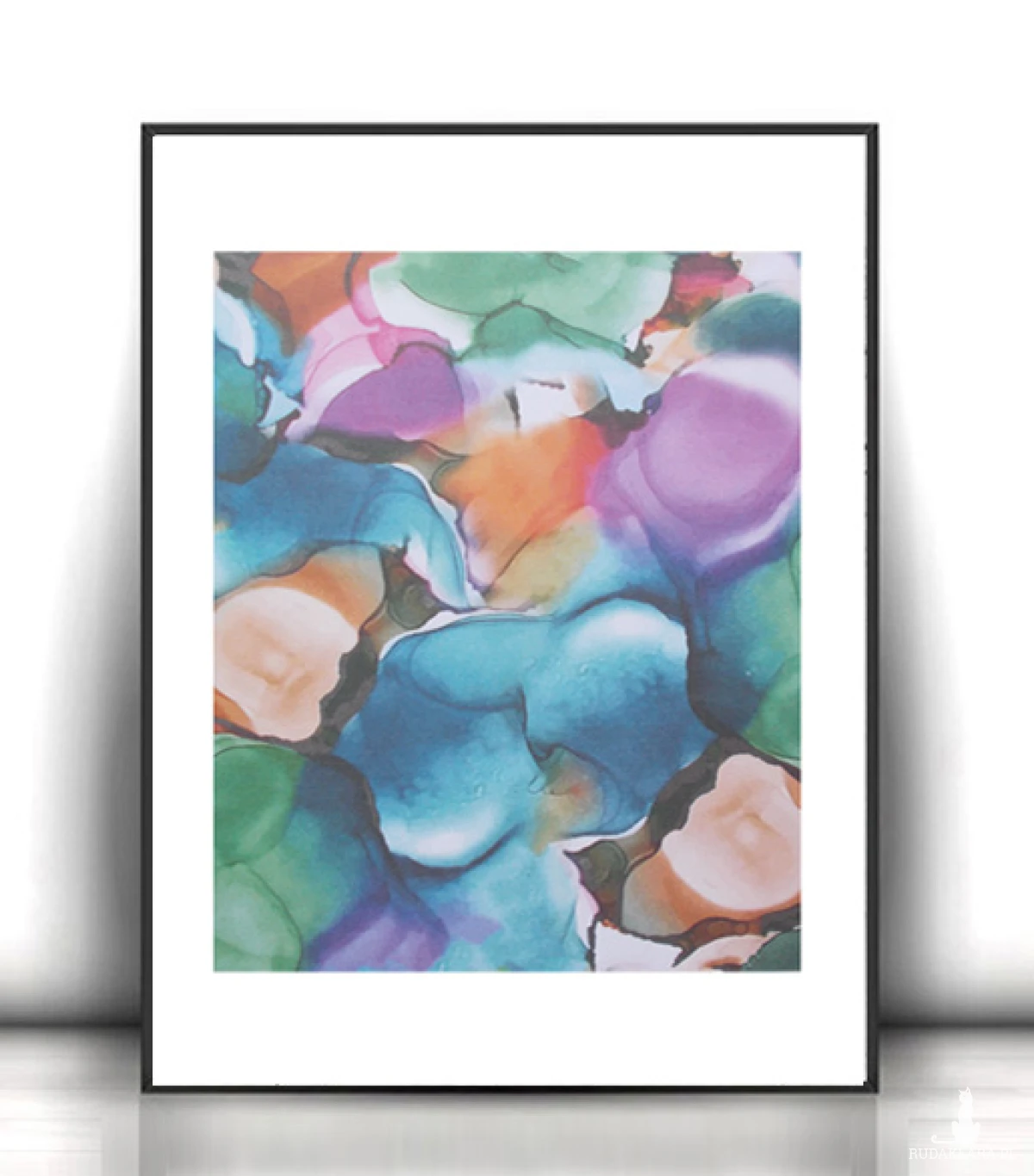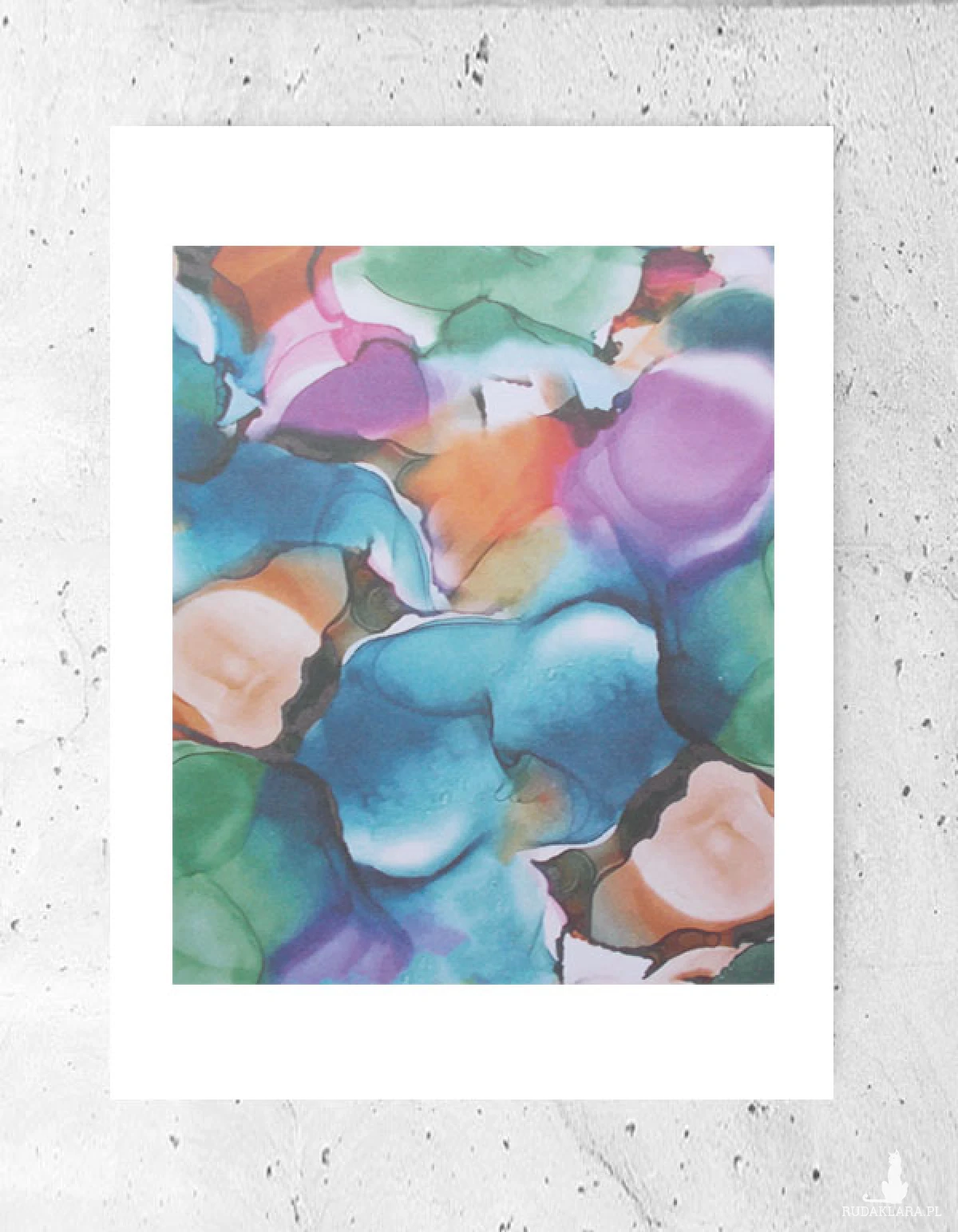 Nowy, kolorowy plakat z abstrakcją. Grafika na białym kartoniku w rozmiarze A4. Dekoracja na ścianę do sypialni, salonu, kuchni, jadalni, pokoju młodzieżowego, biura, gabinetu, kawiarni, cukierni, restauracji itp. Poster wystarczy dać do ramki 21x30 cm. Plakat będzie pasował do każdego stylu urządzania wnętrz.