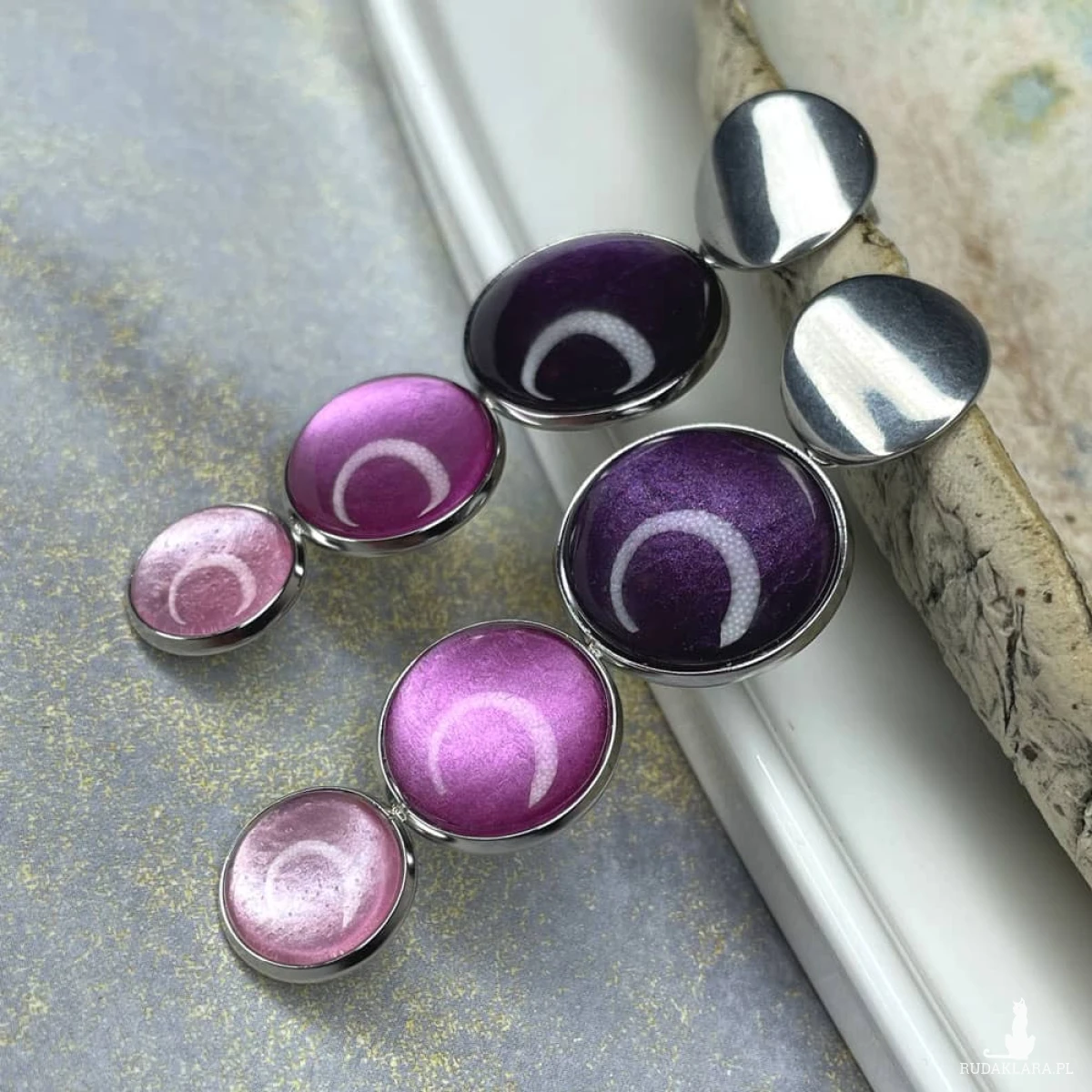 Te pełne blasku kolczyki są częścią kolekcji “W blasku perłowego księżyca”. Kolczyki wykonane są z ręcznie malowanych kaboszonów umieszczonych w bazach ze stali szlachetnej. Szklane elementy zachwycają subtelnym, opalizującym blaskiem, który jest niczym odbicie księżyca na tafli wody. Kolczyki mienią się w świetle, przyciągając wzrok i dodają elegancji każdej stylizacji. Ten dodatek jest idealny dla osób ceniących sobie wyrafinowaną i ponadczasową biżuterię.