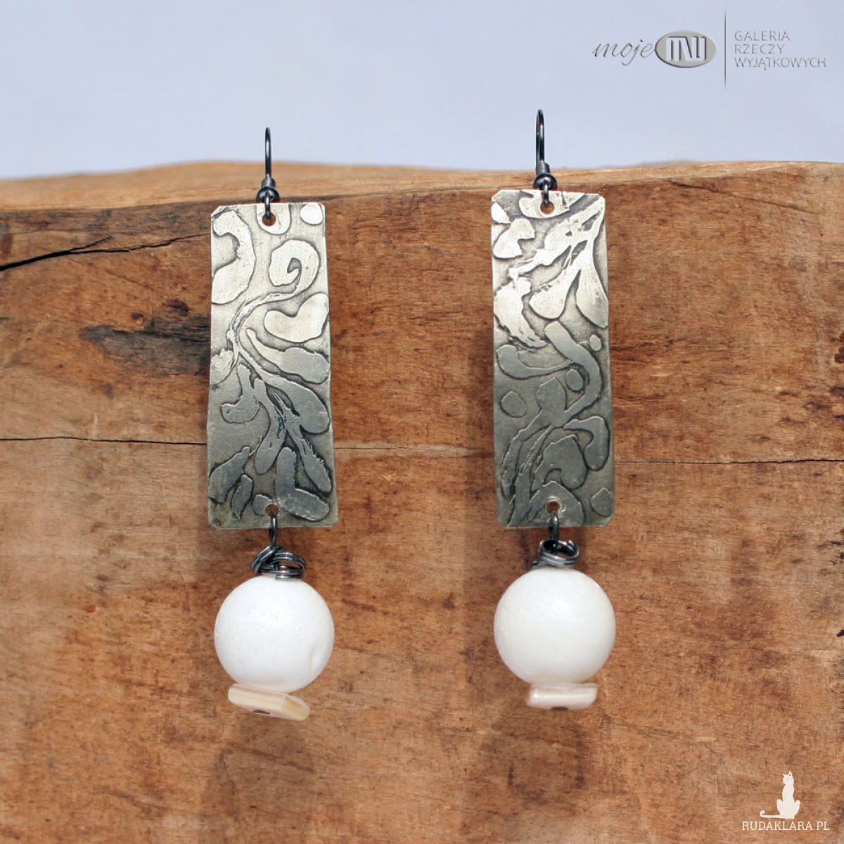 Długie kolczyki z alpaki z wytrawionymi florystycznymi wzorami oraz kuli białego korala. Blaszka jest patynowana i częściowo polerowana dla wydobycia rysunku. Kolczyki są dość duże, wyglądają efektownie. Zawieszone są na metalowych biglach w kolorze grafitowym.