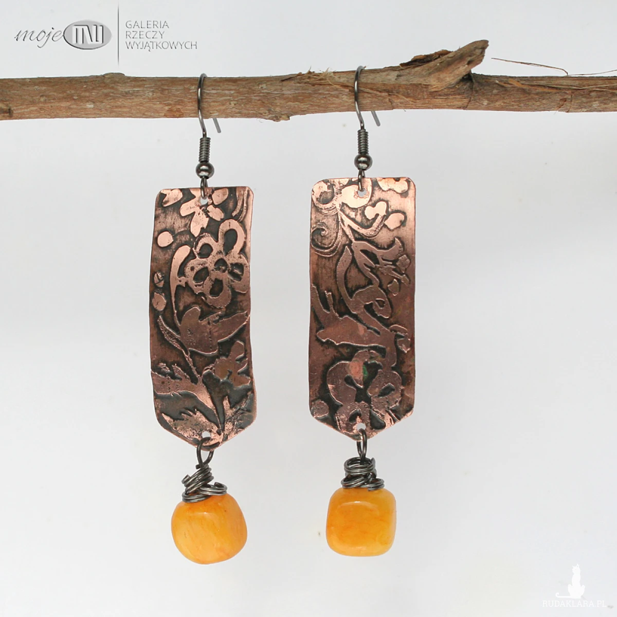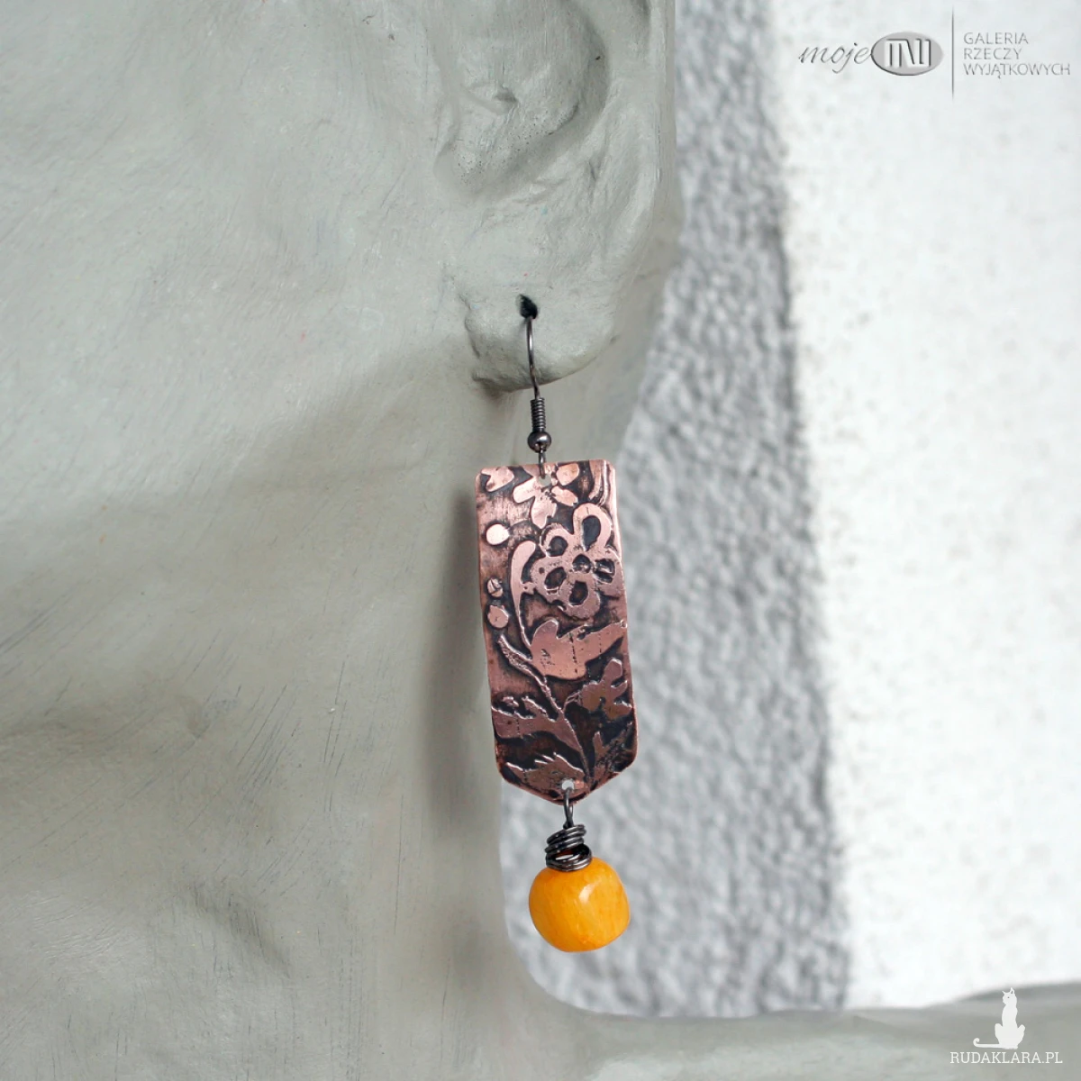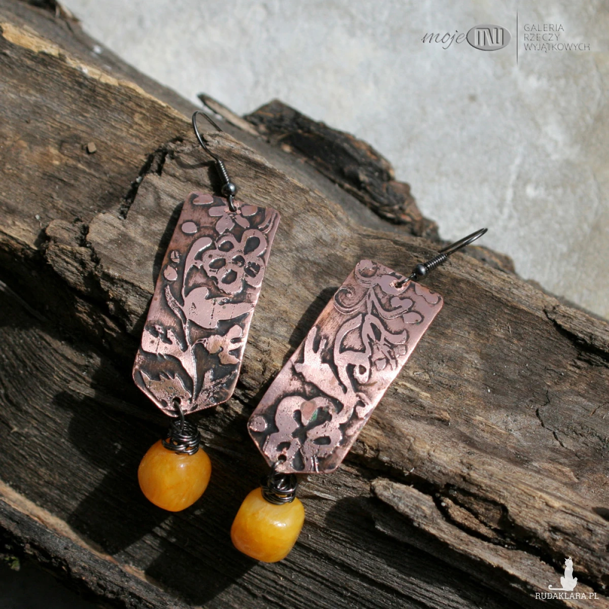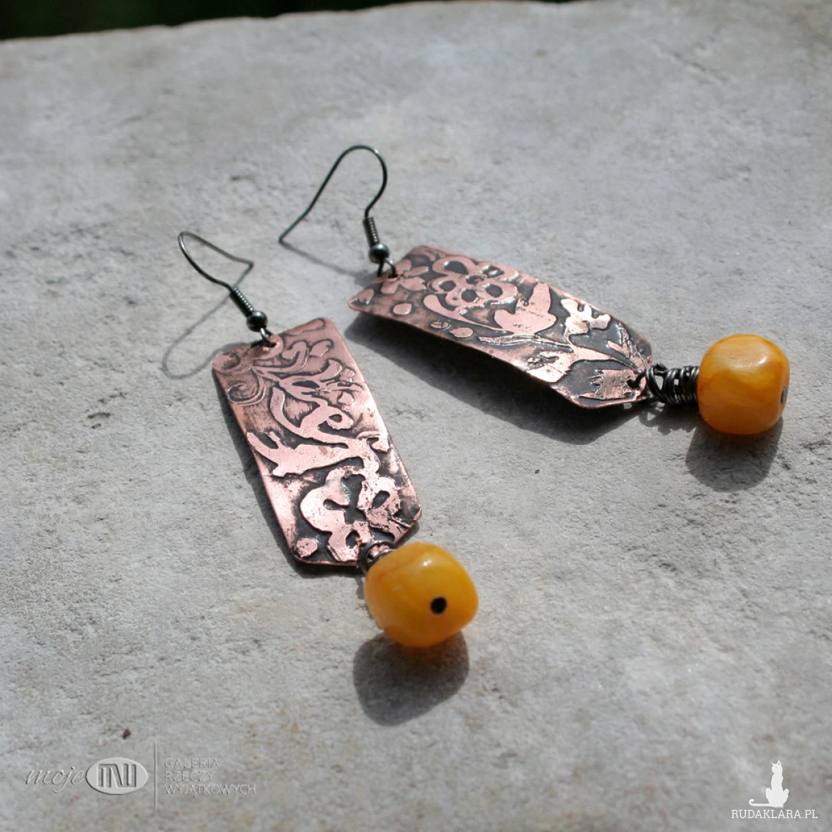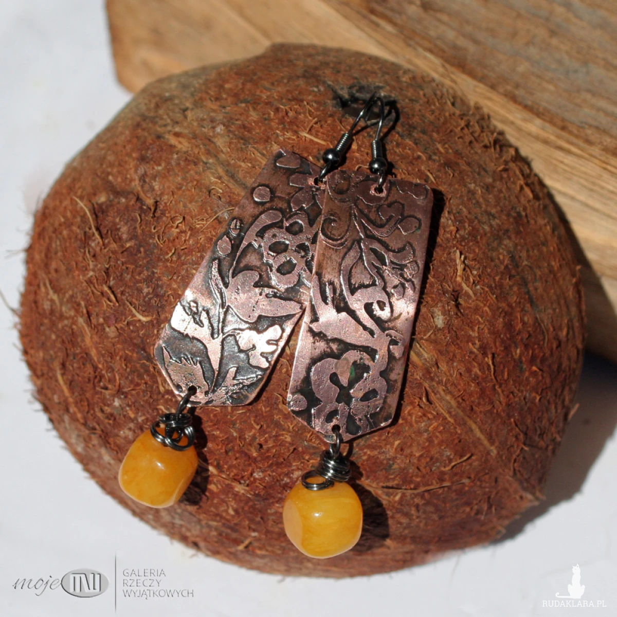Długie kolczyki z miedzi z wytrawionymi florystycznymi wzorami, ozdobione zaokrągloną kostką bananowo-żółtego marmuru. Blaszka jest patynowana i częściowo polerowana dla wydobycia rysunku. Kolczyki są dość duże, wyglądają efektownie. Zawieszone są na metalowych biglach w kolorze grafitowym.