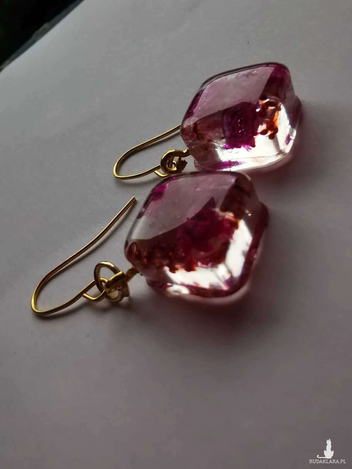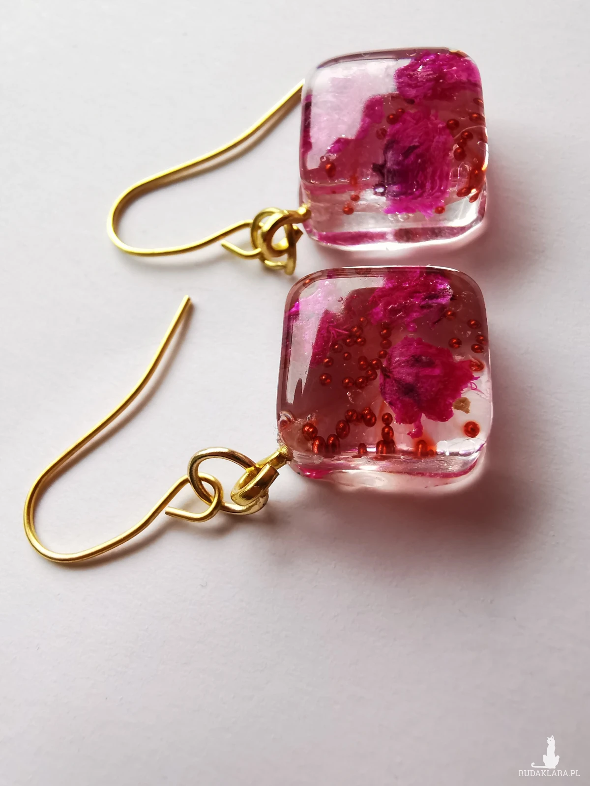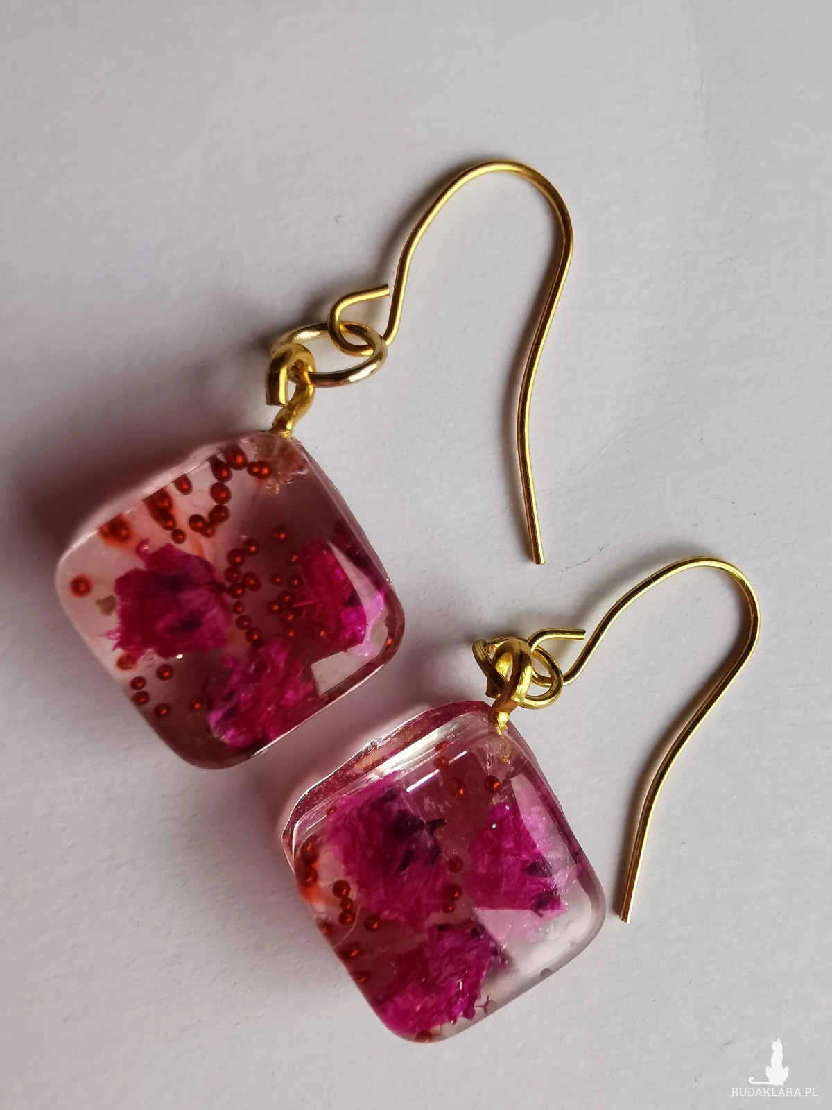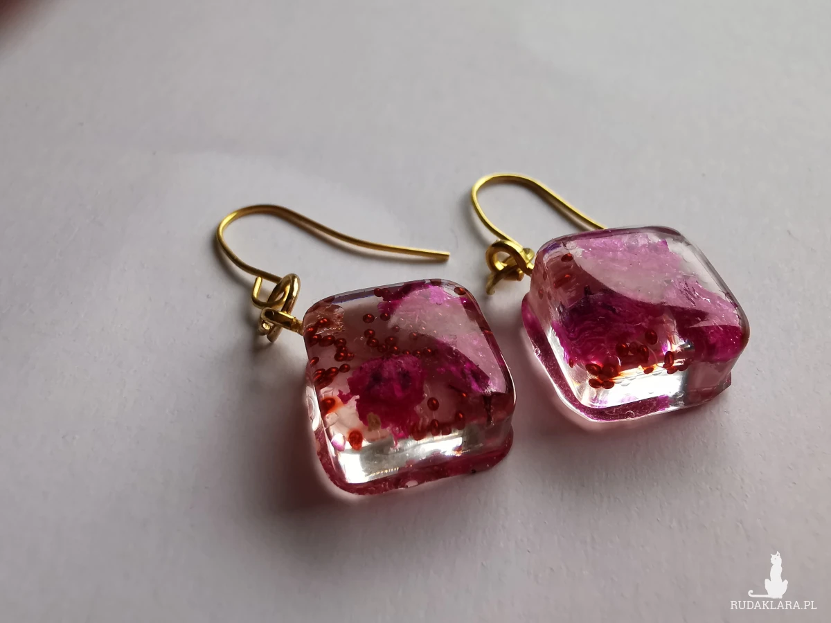 Kolczyki wiszące ręcznie wypełnione żywicą epoksydową i suszonymi kwiatami. Zatopione są w nich mini perełki i odrobina brokatu.