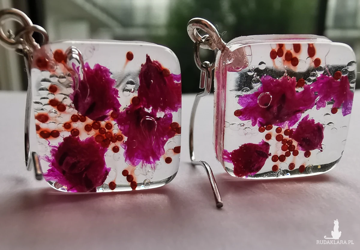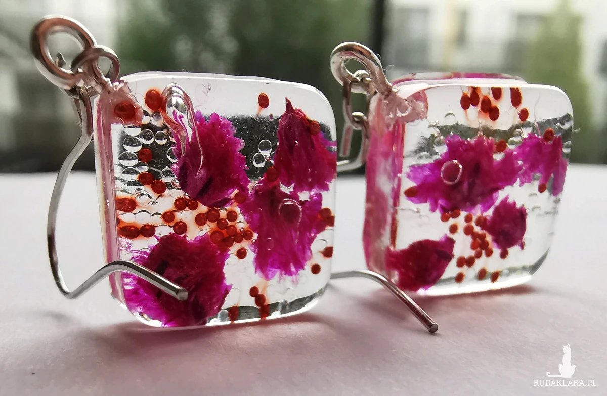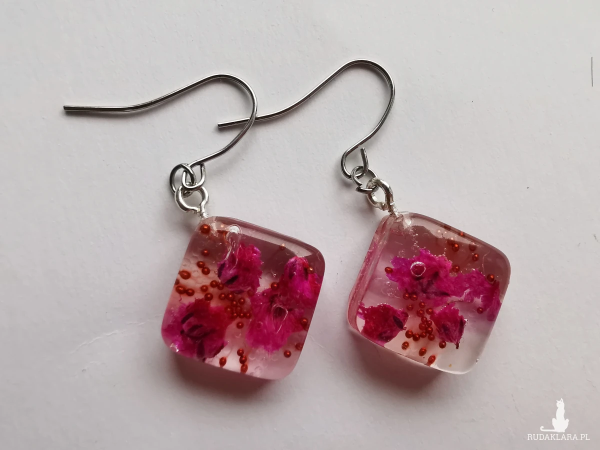 Kolczyki wiszące ręcznie wypełnione żywicą epoksydową i suszonymi kwiatami. Zatopione są w nich mini perełki i odrobina brokatu oraz różowa gipsówka
