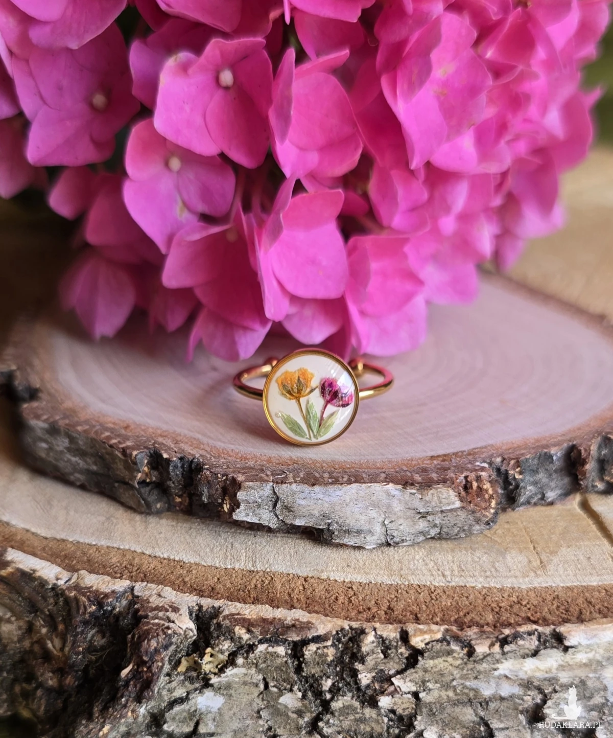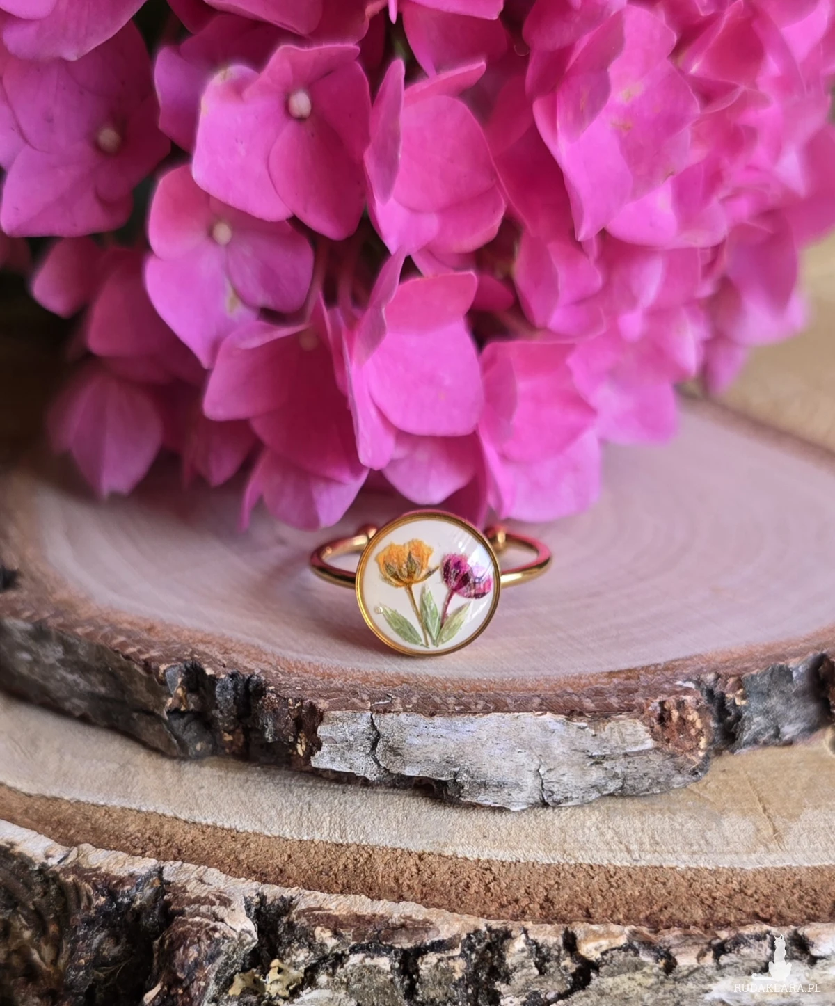Oferuję Państwu unikalną biżuterię. Pierścionek jest wykonany z suszonych kwiatów i żywicy epoksydowej. Biżuteria jest wspaniałym i oryginalnym prezentem na lata.