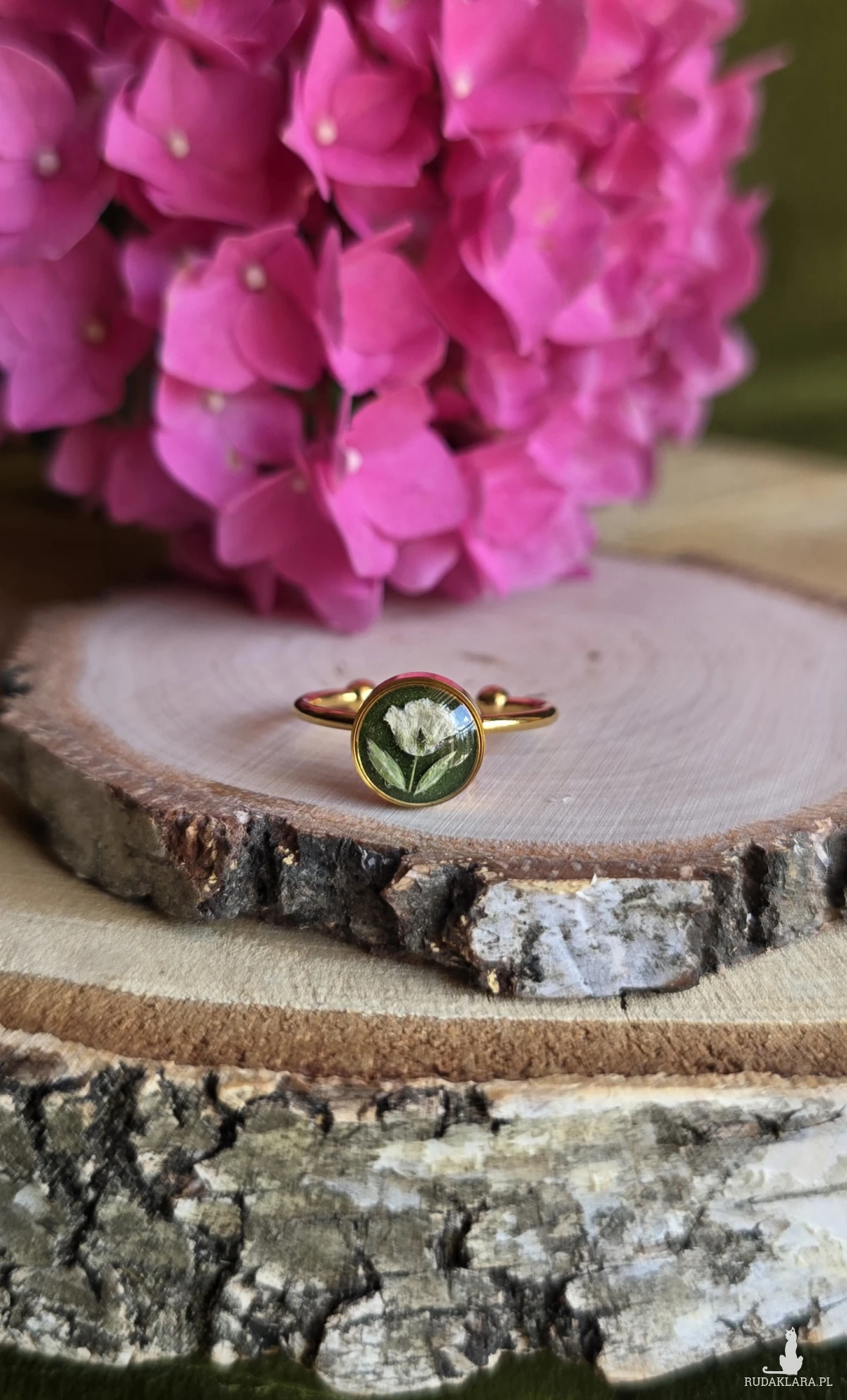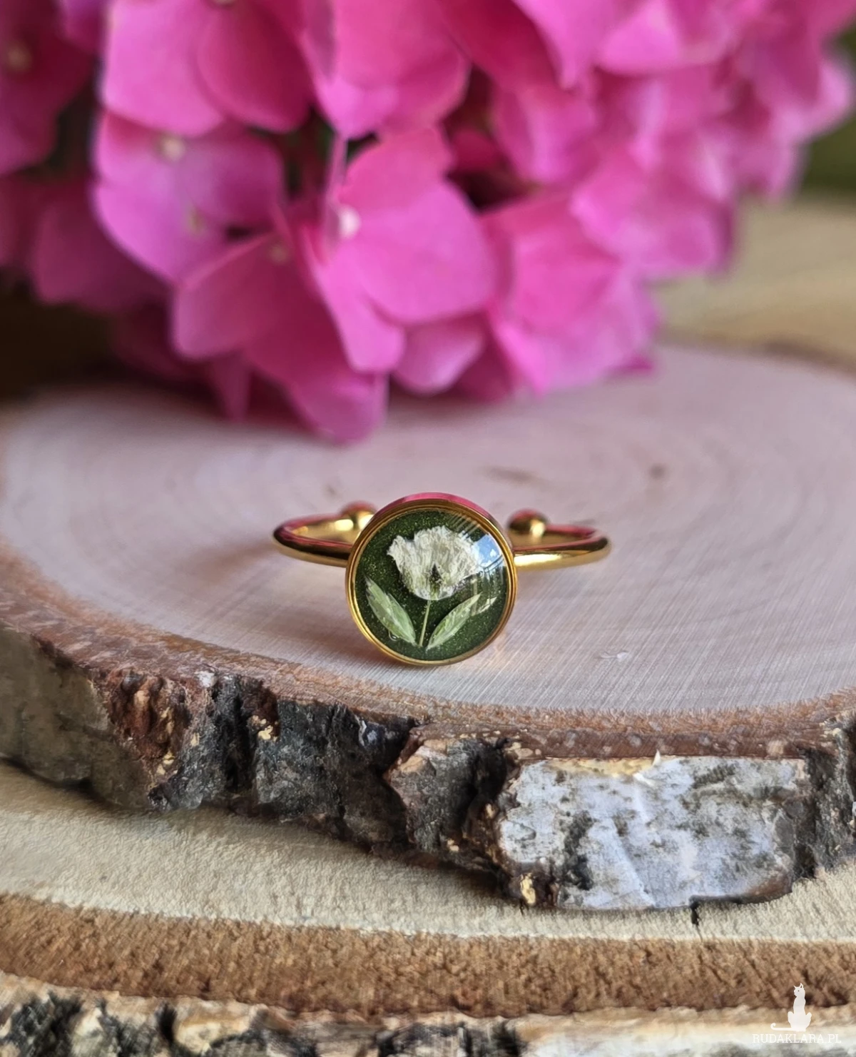 Oferuję Państwu unikalną biżuterię. Pierścionek jest wykonany z suszonych kwiatów i żywicy epoksydowej. Biżuteria jest wspaniałym i oryginalnym prezentem na lata.
