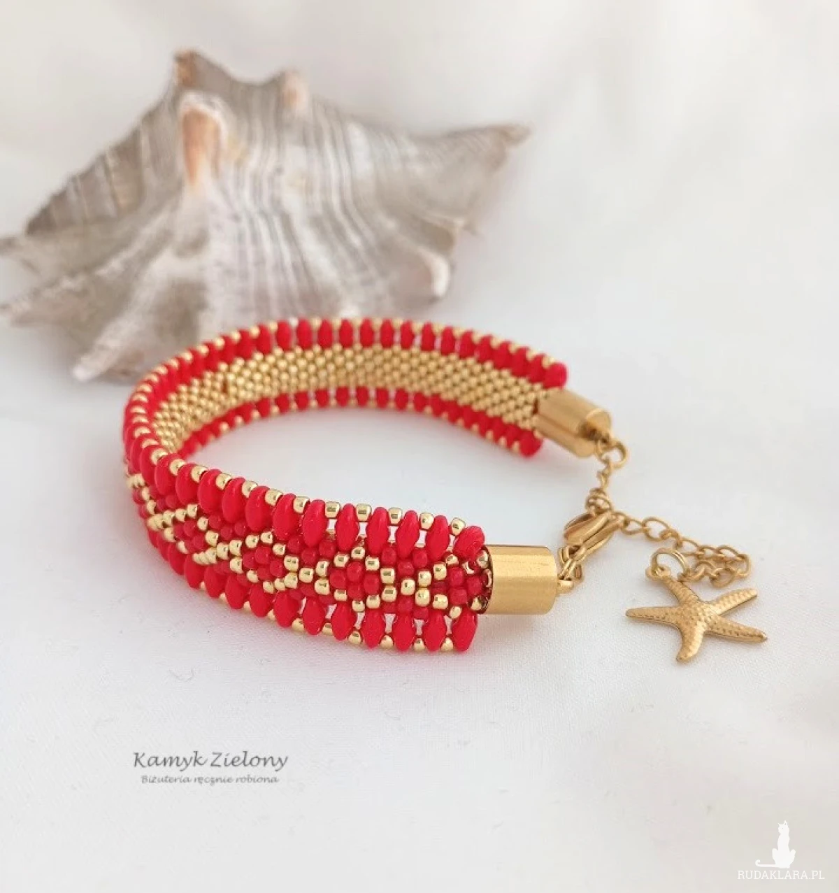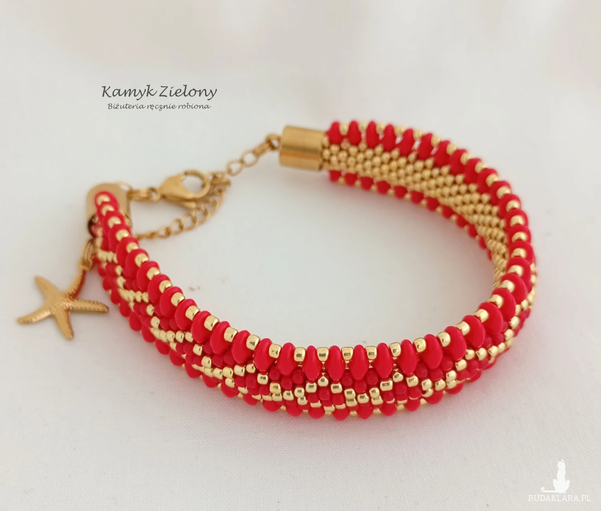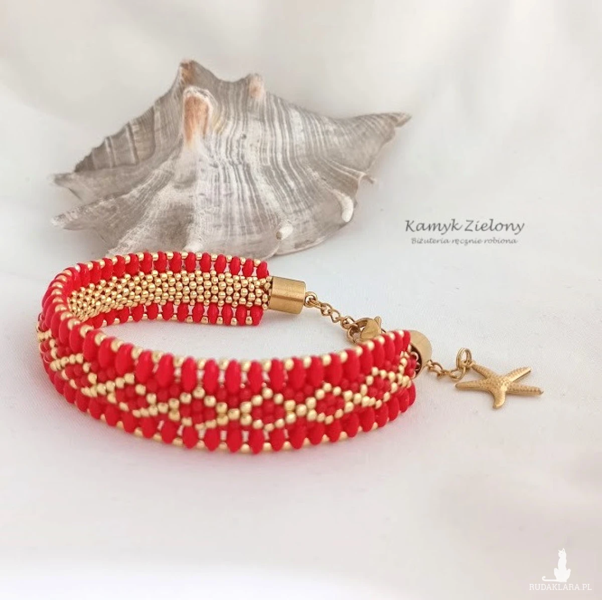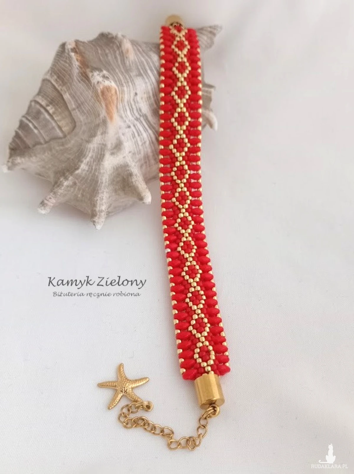 Wykonana ręcznie z wysokiej jakości szklanych koralików Toho w kolorze czerwonym i złotym. Na jej brzegach zastosowano dłuższe, również szklane koraliki SuperDuo w kolorze czerwonym.